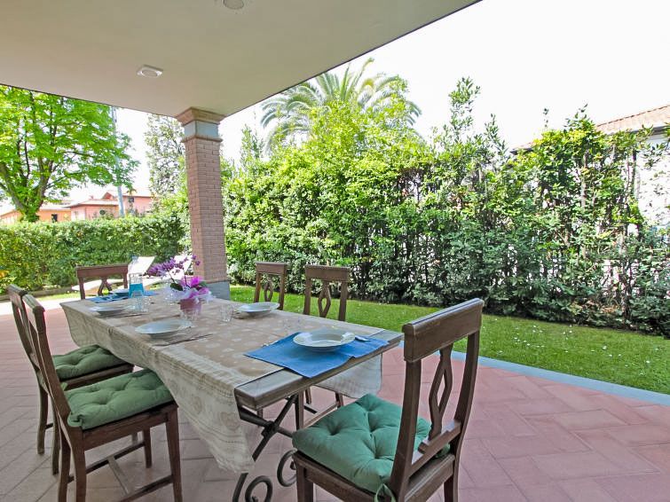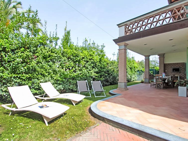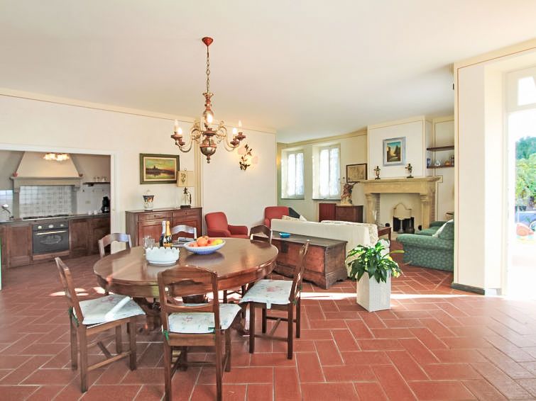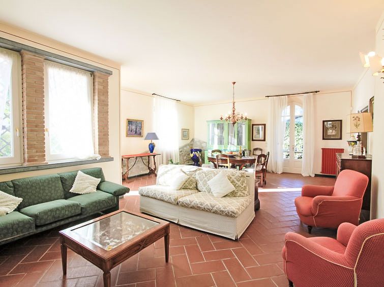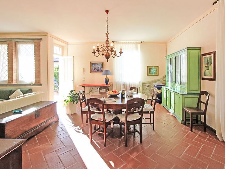 "Villa Torri", 5-room villa 155 m2. Bright, comfortable and stylish furnishings: large living/dining room with satellite TV (flat screen), DVD. Exit to the garden, to the veranda. Kitchen (5 hot plates, oven, dishwasher, microwave, freezer). Sep. WC. Heating (extra). Upper floor: 1 double bedroom with air conditioning.