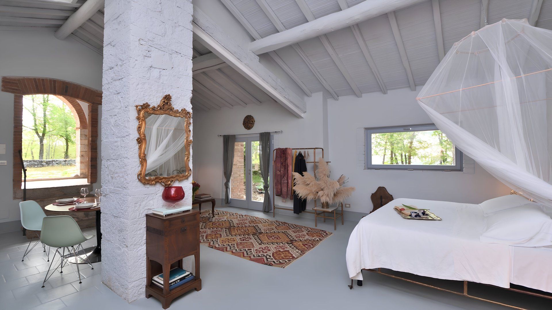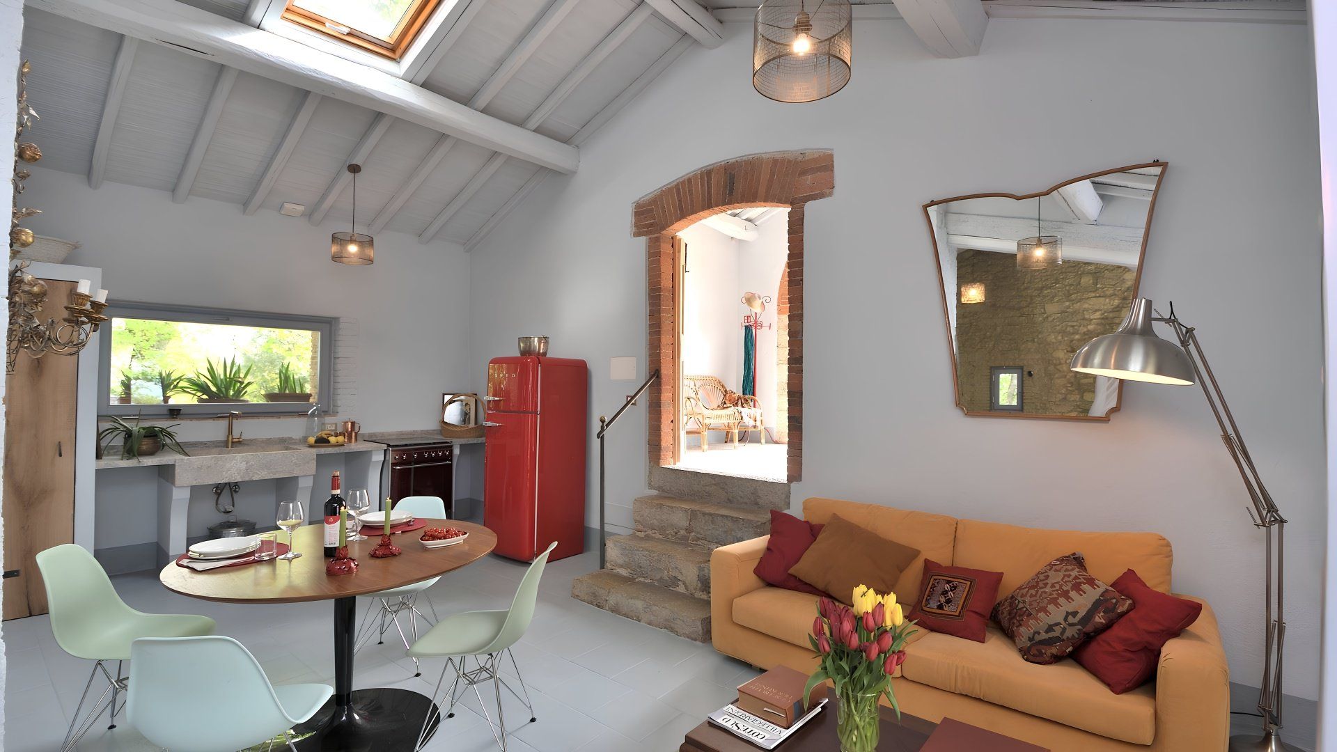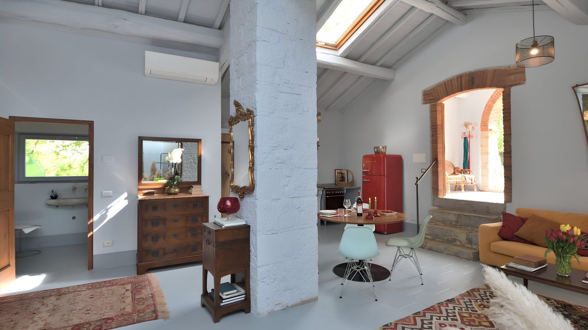 This studio apartment in a stone barn conversion is a perfect blend of modern and antique design. We love the infinity pool (40 metres away) which overlooks the Val d'Orcia, offering breathtaking views. It’s surrounded by wild plants and shrubs that reflect the forested land beyond. The owner’s live in the main house with their two friendly dogs and they occasionally use the pool when the area is unattended by guests. The private furnished terrace and outdoor lounge area here is a lovely spot for a glass of wine. If you prefer to be a bit more active, there are endless trails and routes for walkers and bikers, while the pretty village of Gaiole is 11 kilometres away.