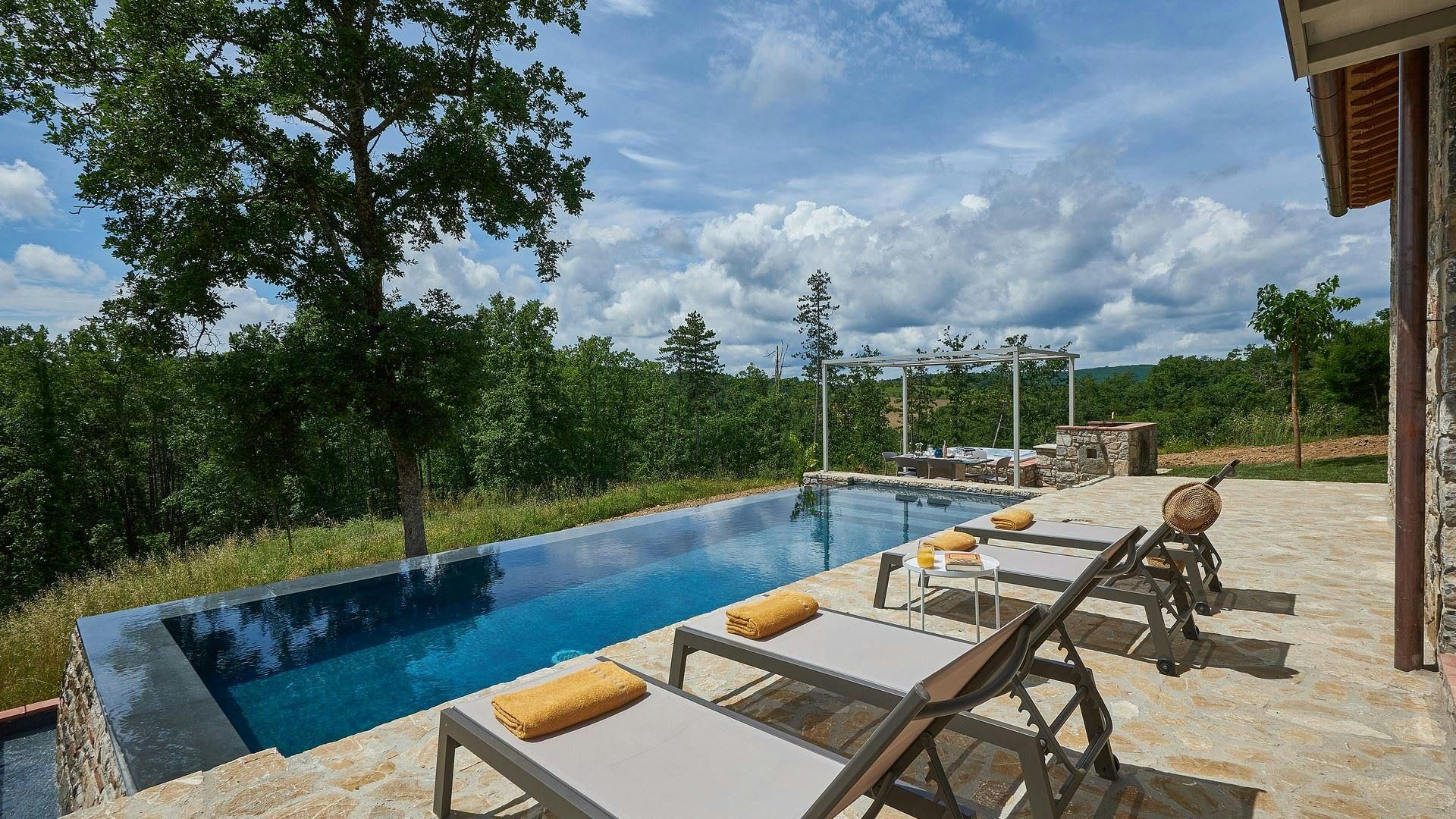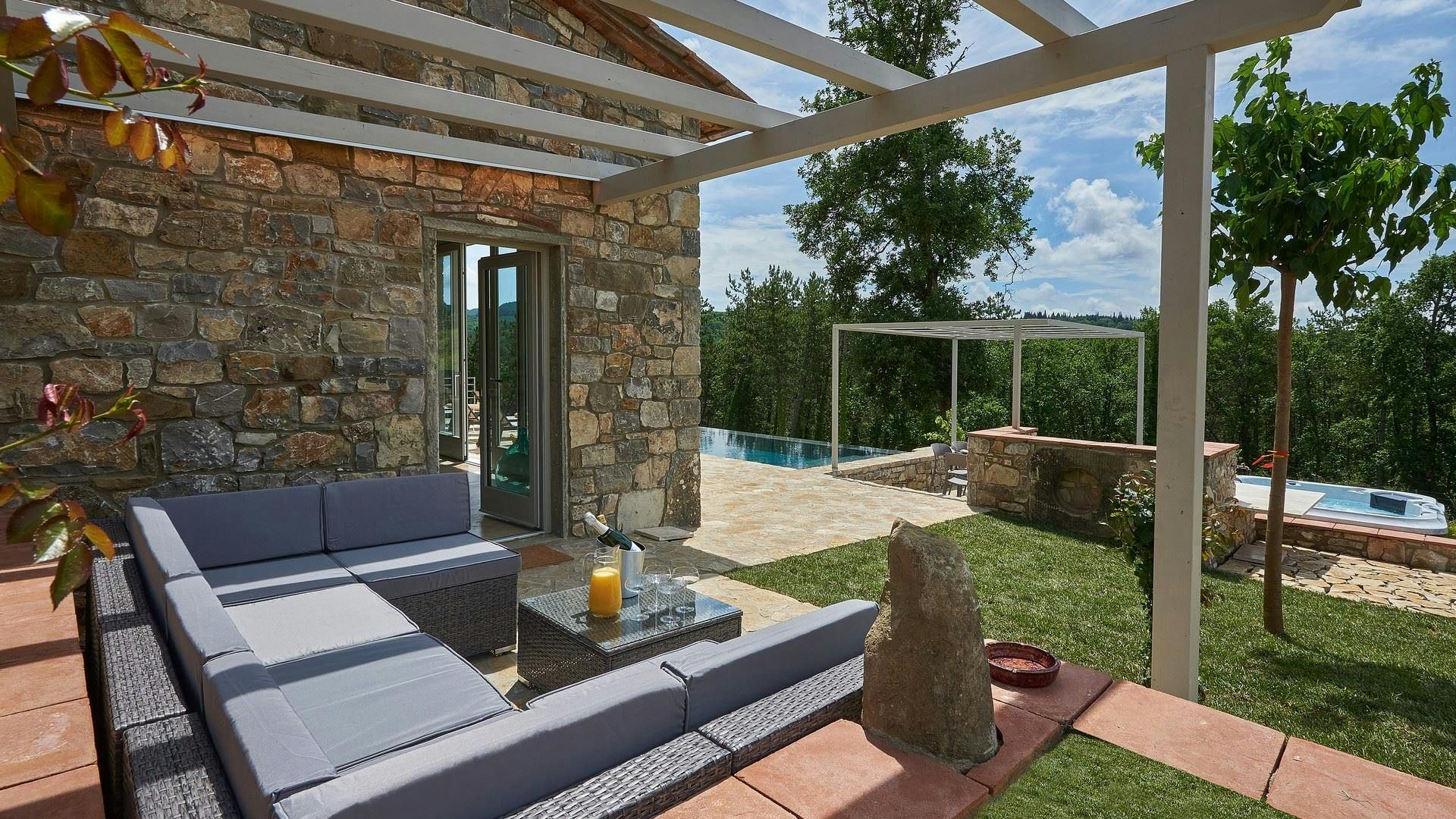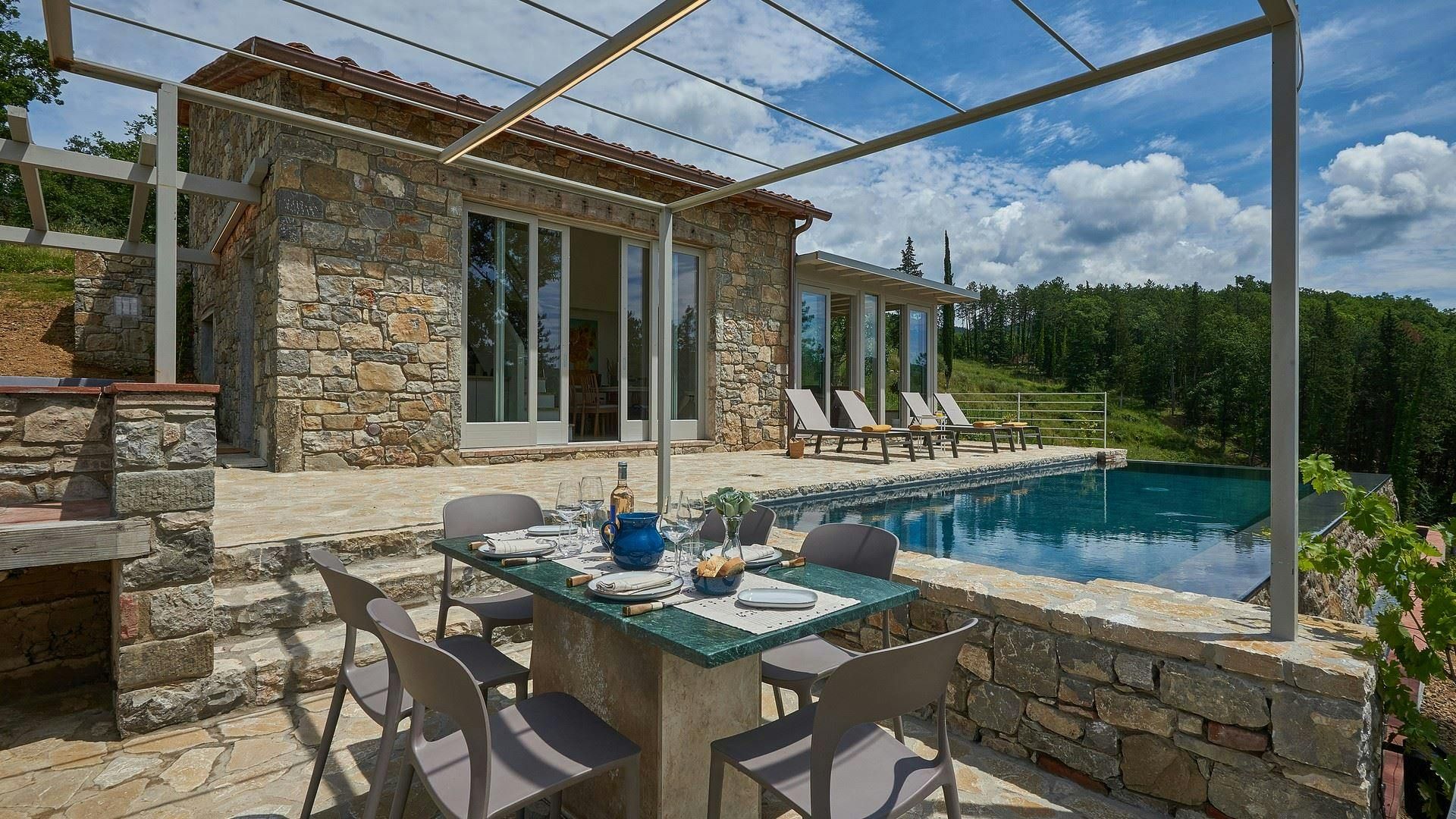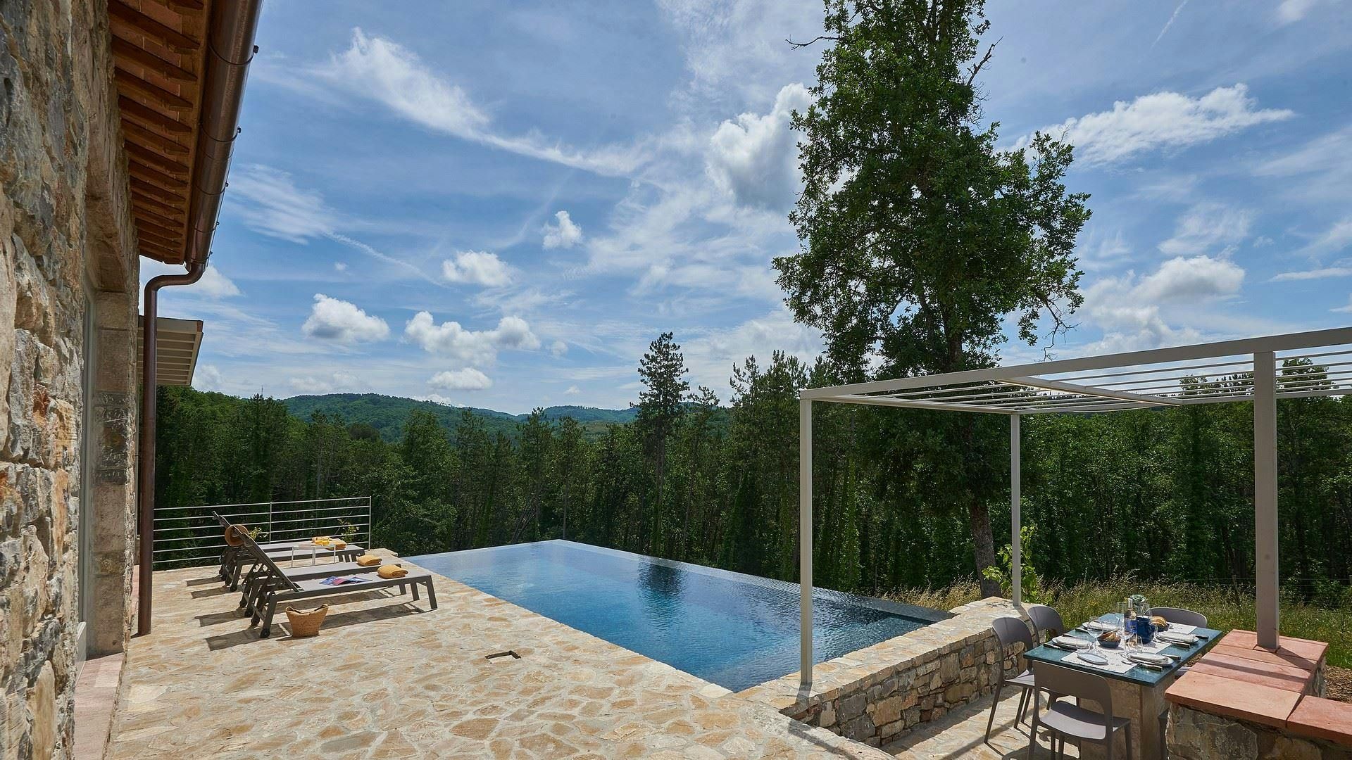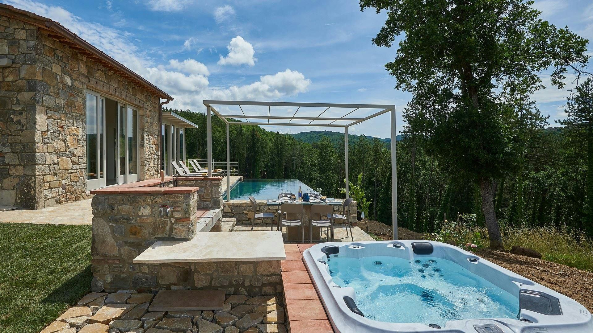If you’re looking for an escape from it all, this could be the home for you. Set on a private road deep in the woods, this Chianti villa has tranquillity running through its core. We love the seamless blend of modern furniture with the traditional building here, but the outdoor space is our biggest winner. Sun-kissed terraces, a hot tub, a private pool, alfresco dining areas – what’s not to love? If you can tear yourself away, it’s a mere ten-minute drive to the wine-making town of Gaiole, which is well worth a visit.
