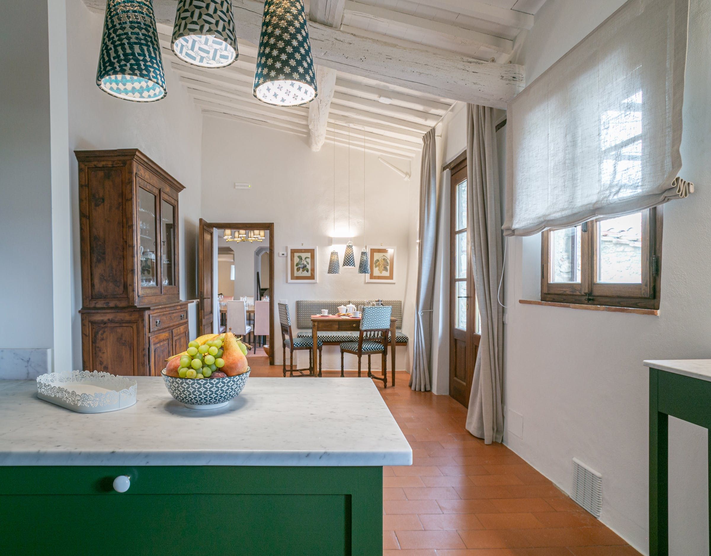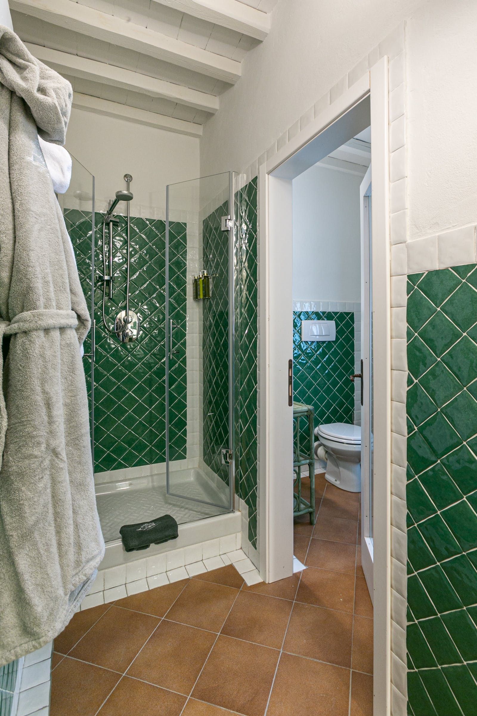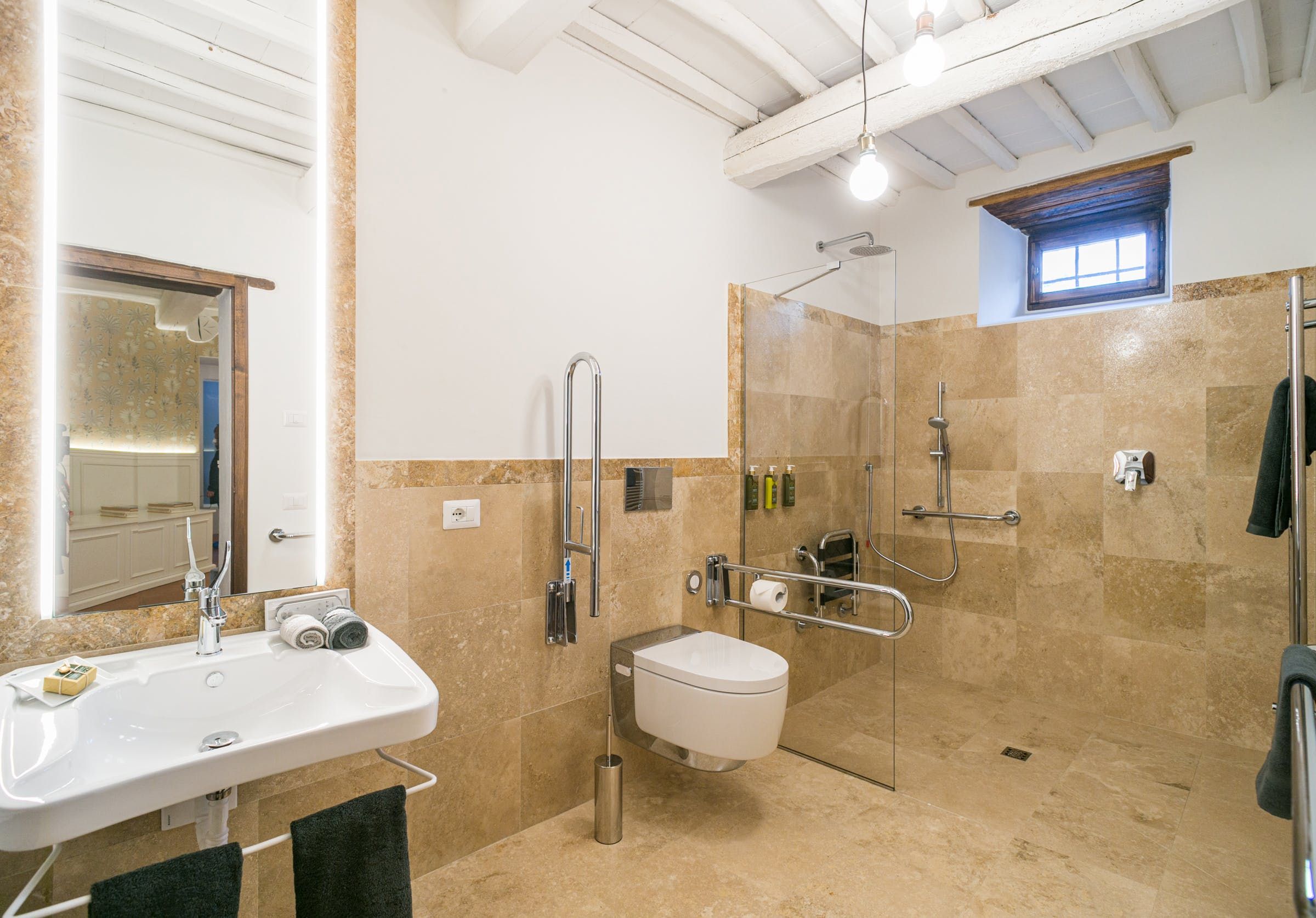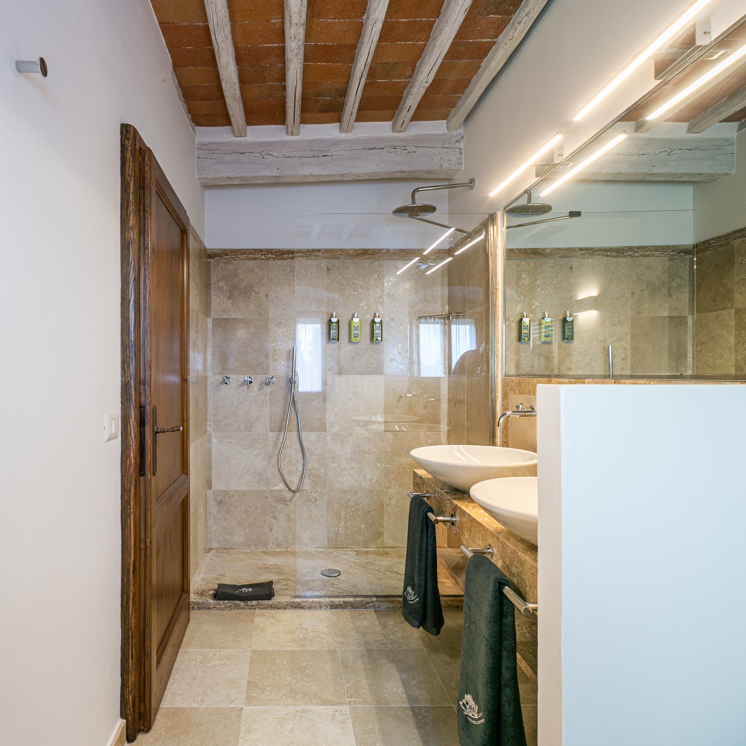 Inside, you'll find typical Tuscan features, such as traditional terracotta floors and a country-style kitchen. With its multiple living rooms, this home is perfect for a large family or group of friends. Off one of the dining areas is a snug that converts into a bedroom with an ensuite bathroom – ideal for guests with limited mobility. We adore the local travertine stone bathrooms throughout this villa too.