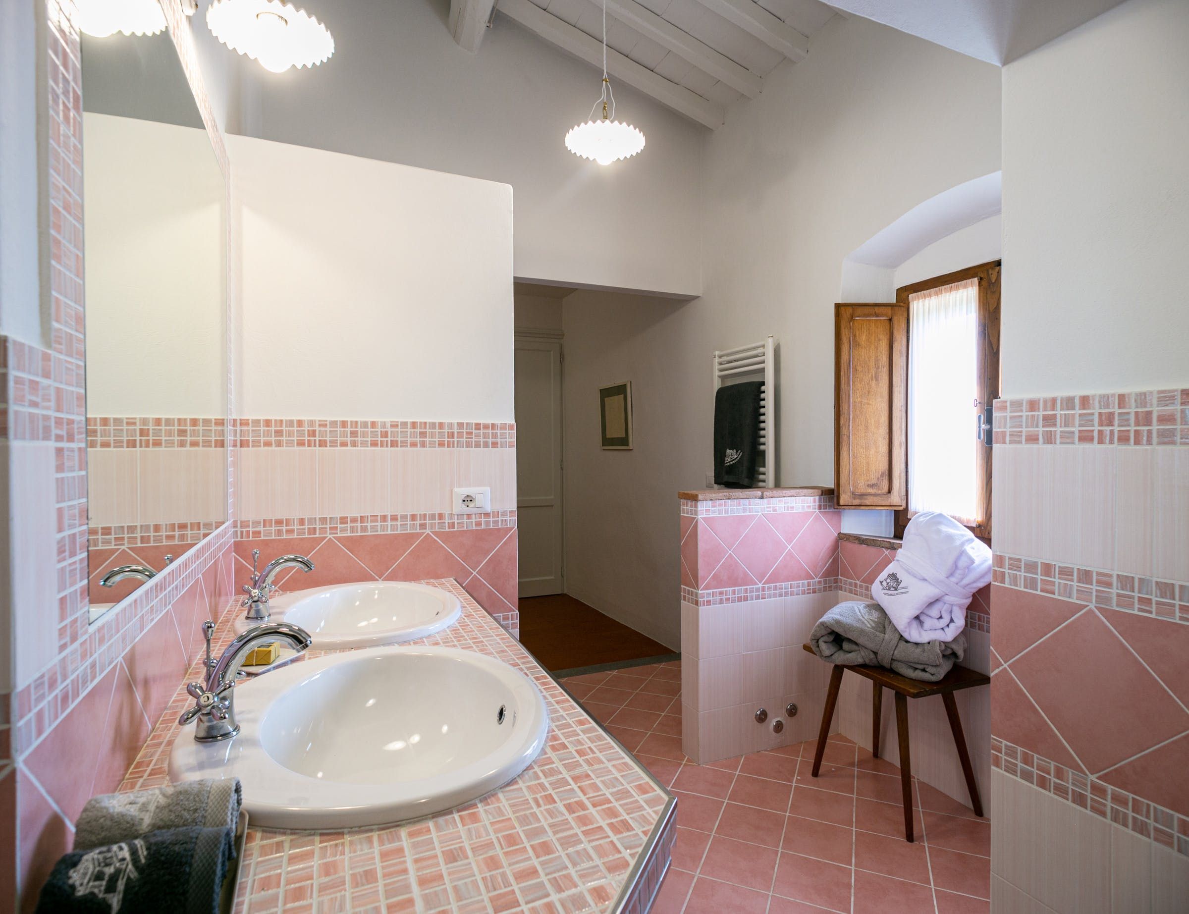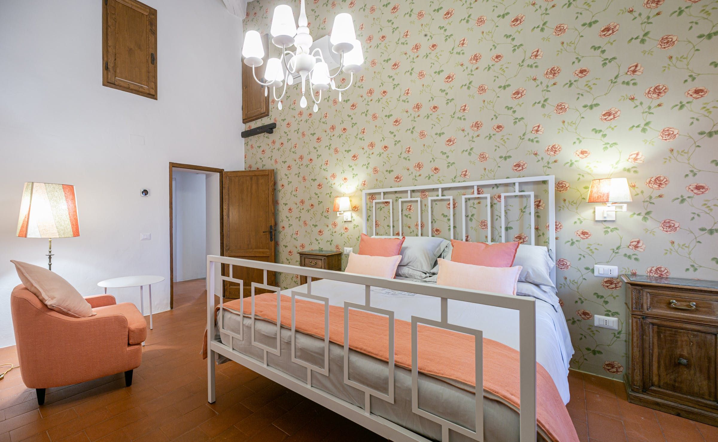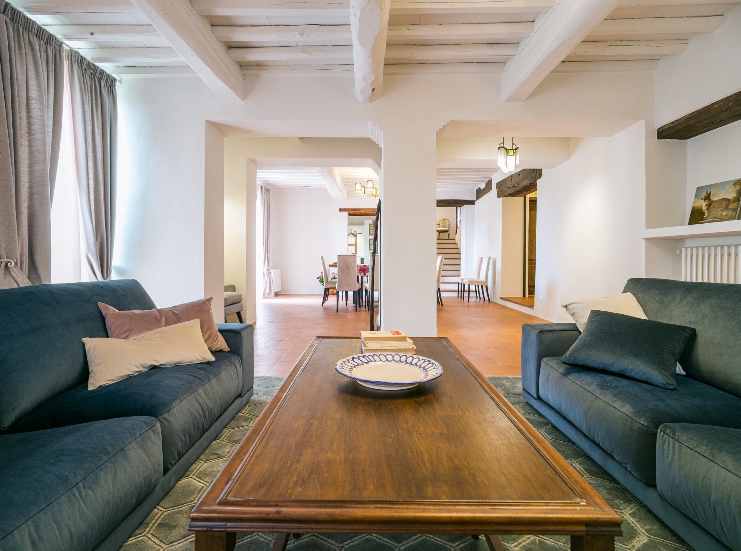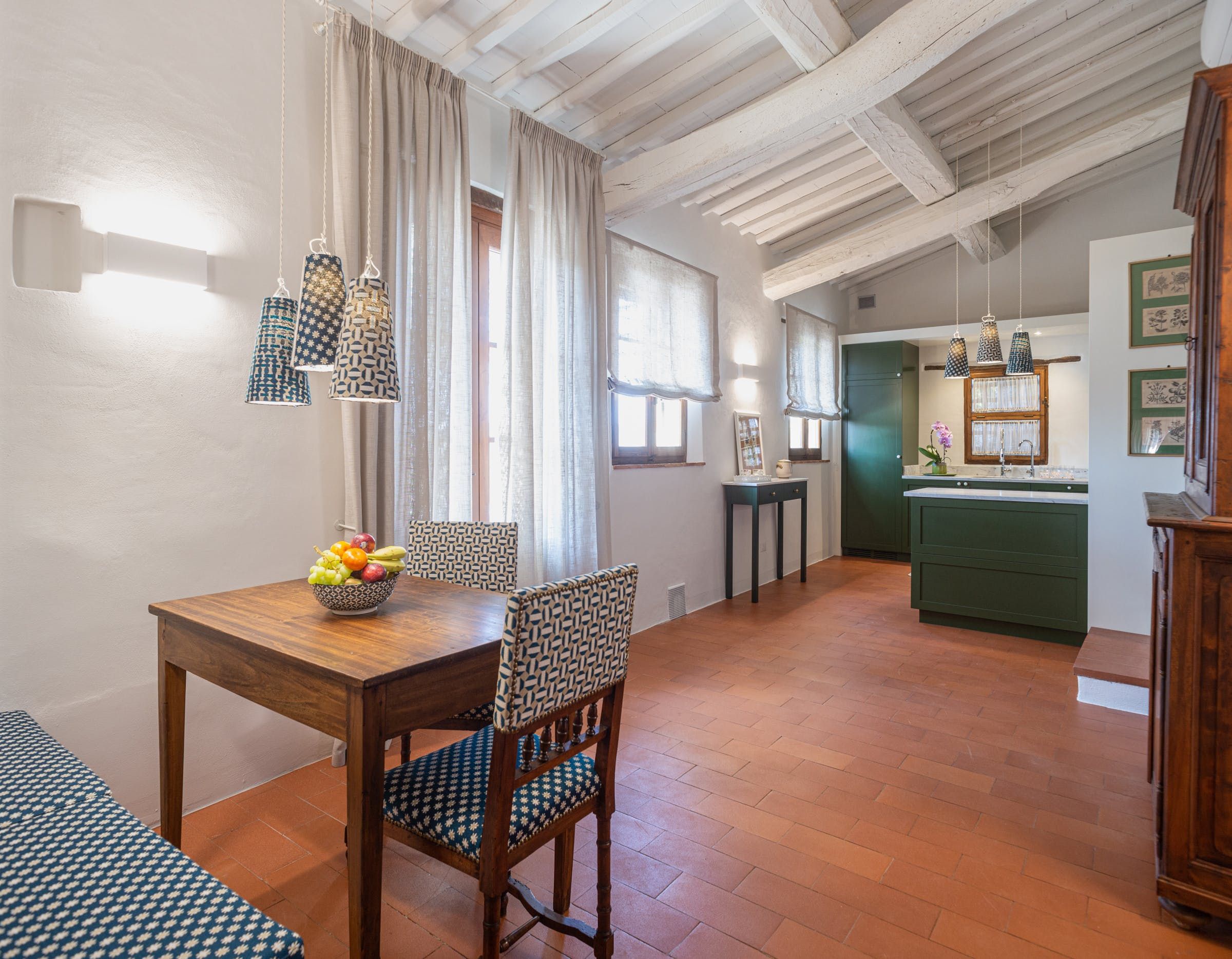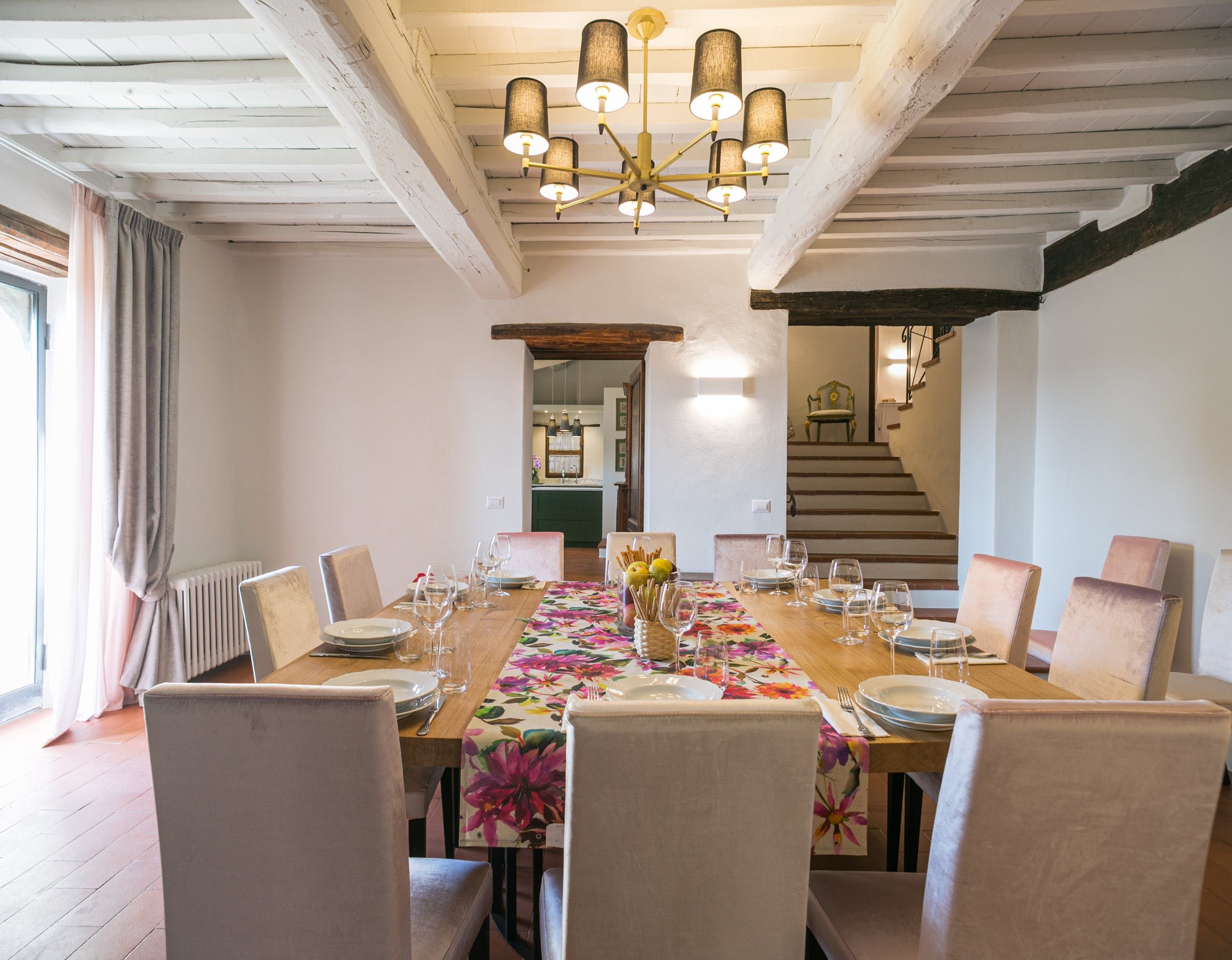 Inside, you'll find typical Tuscan features, such as traditional terracotta floors and a country-style kitchen. With its multiple living rooms, this home is perfect for a large family or group of friends. Off one of the dining areas is a snug that converts into a bedroom with an ensuite bathroom – ideal for guests with limited mobility. We adore the local travertine stone bathrooms throughout this villa too.