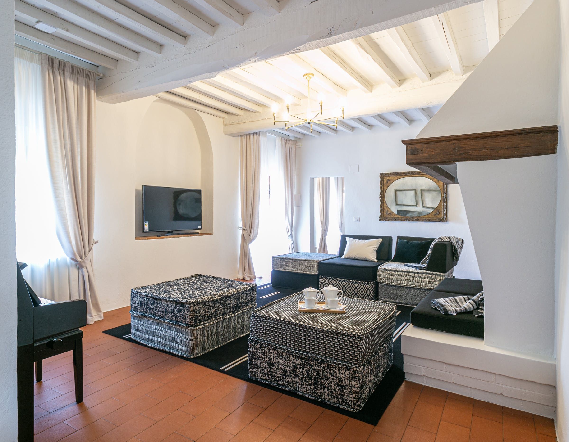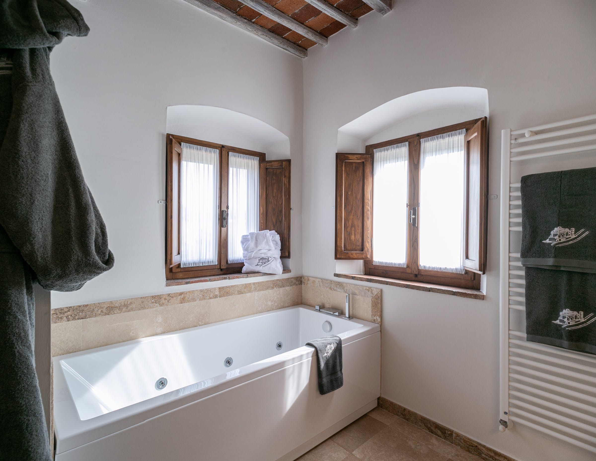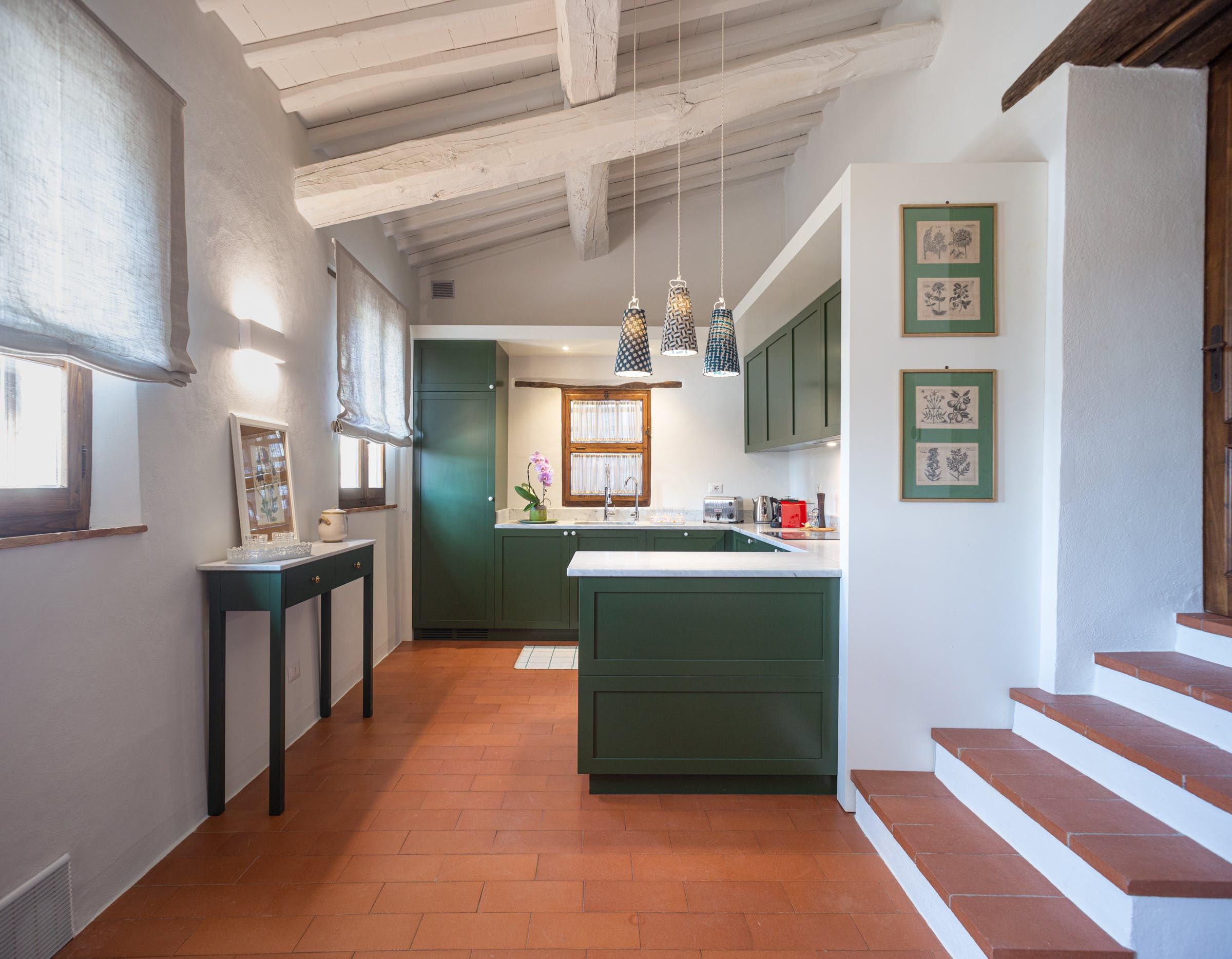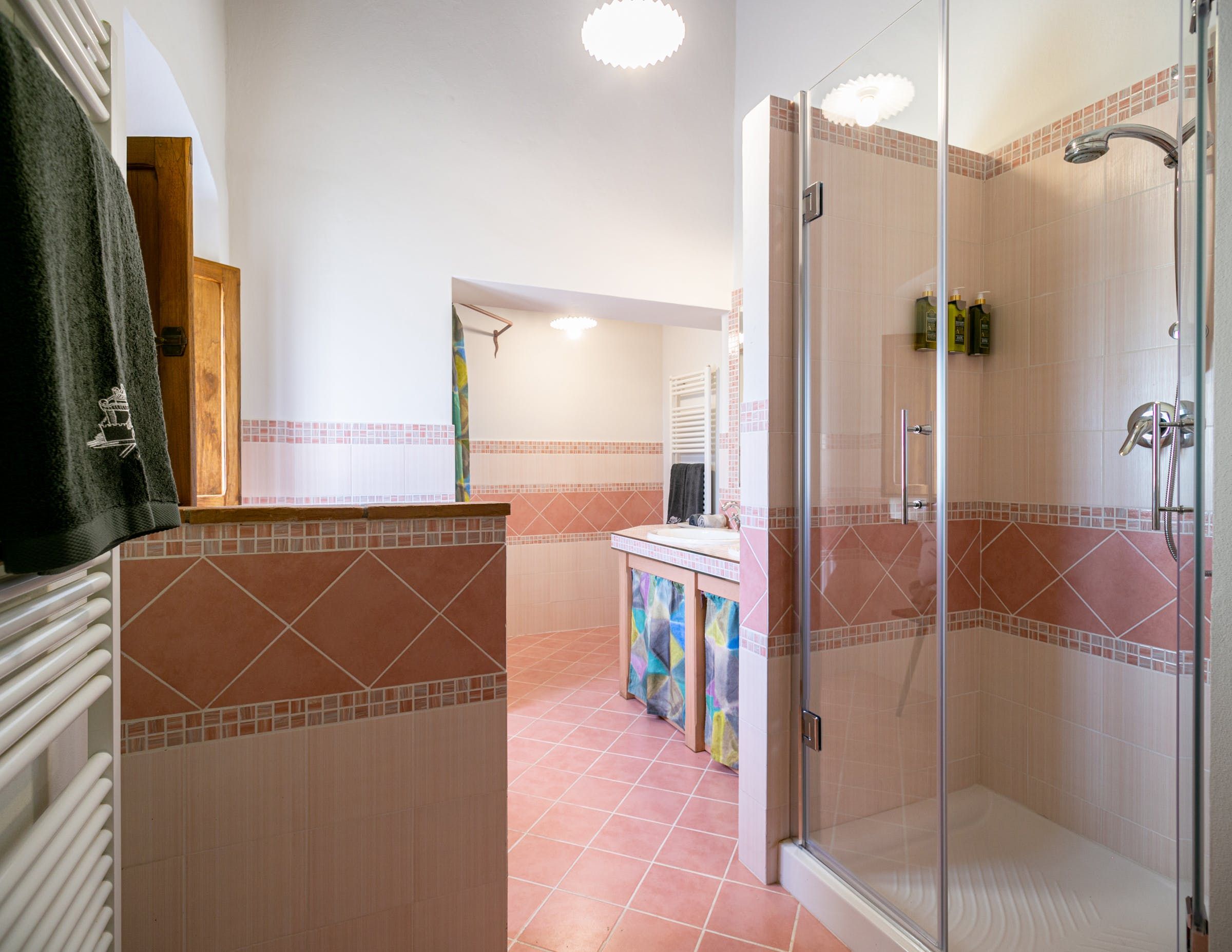 Inside, you'll find typical Tuscan features, such as traditional terracotta floors and a country-style kitchen. With its multiple living rooms, this home is perfect for a large family or group of friends. Off one of the dining areas is a snug that converts into a bedroom with an ensuite bathroom – ideal for guests with limited mobility. We adore the local travertine stone bathrooms throughout this villa too.