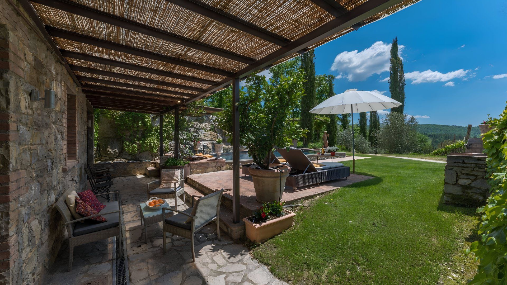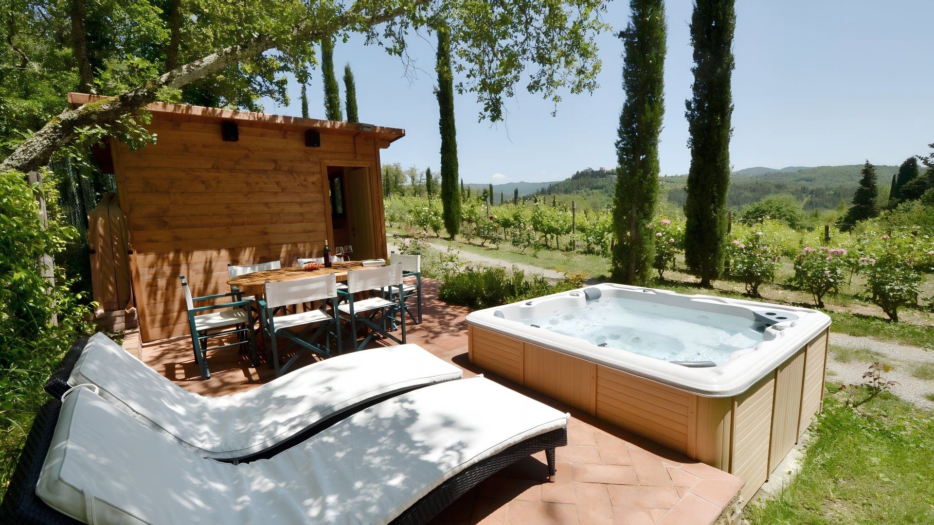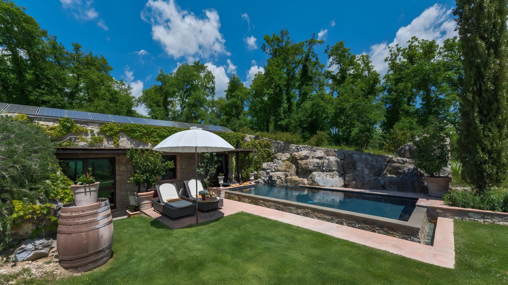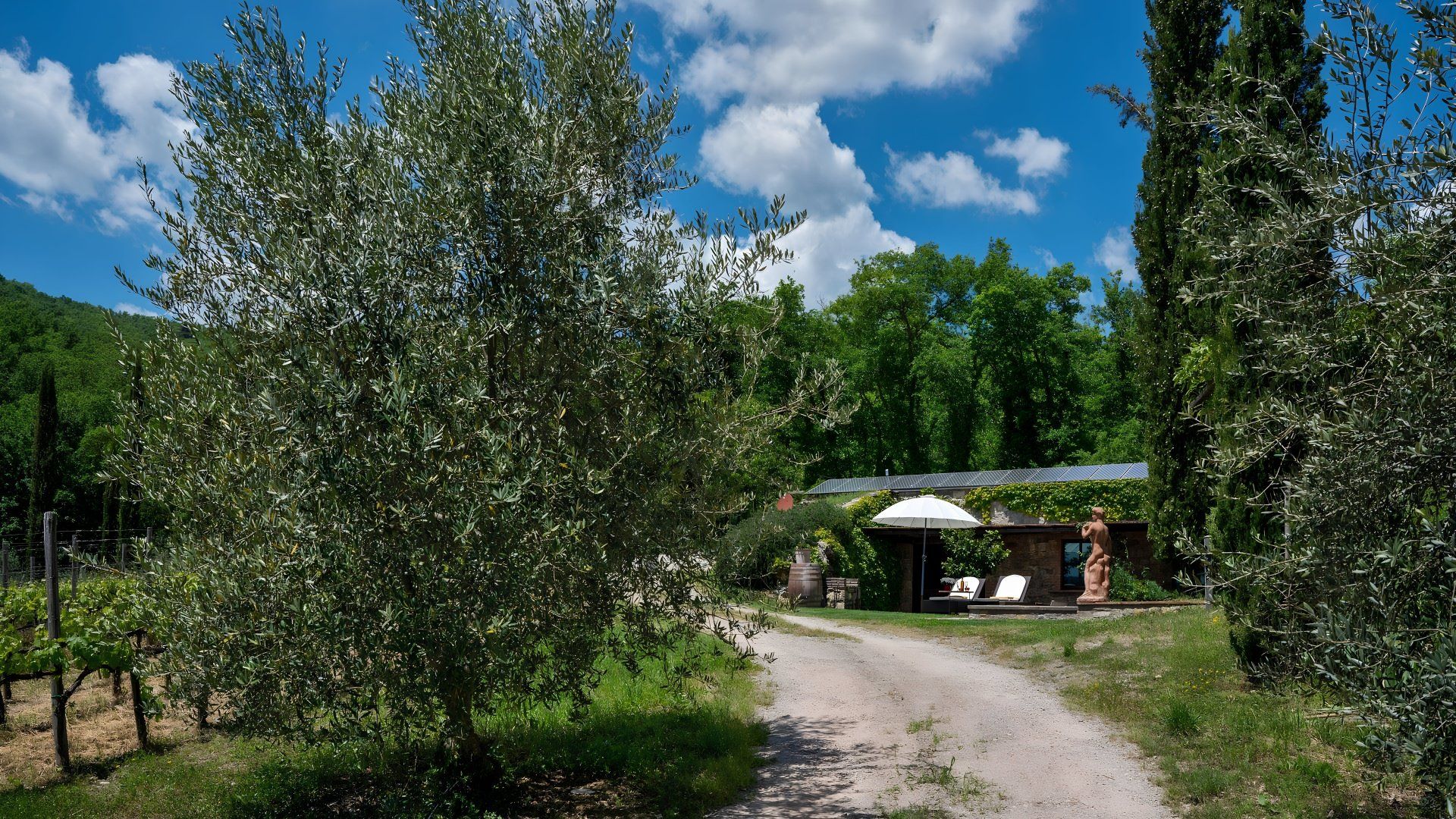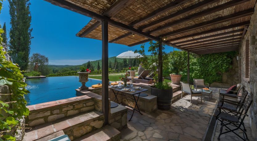 Offering views of the surrounding hills and the owner's vineyard, this eco-friendly villa is set within the Chianti countryside. While the interior is fairly subdued and the unpaved road leading here isn't the best drive, this home promises a paradisal outdoor living space. You'll find a poolside dining area and a hot tub in the garden, plus you can enjoy fresh produce from the chicken coop and vegetable patch. Exploring Tuscany? Gaiole is two kilometres away, and Radda is eight.