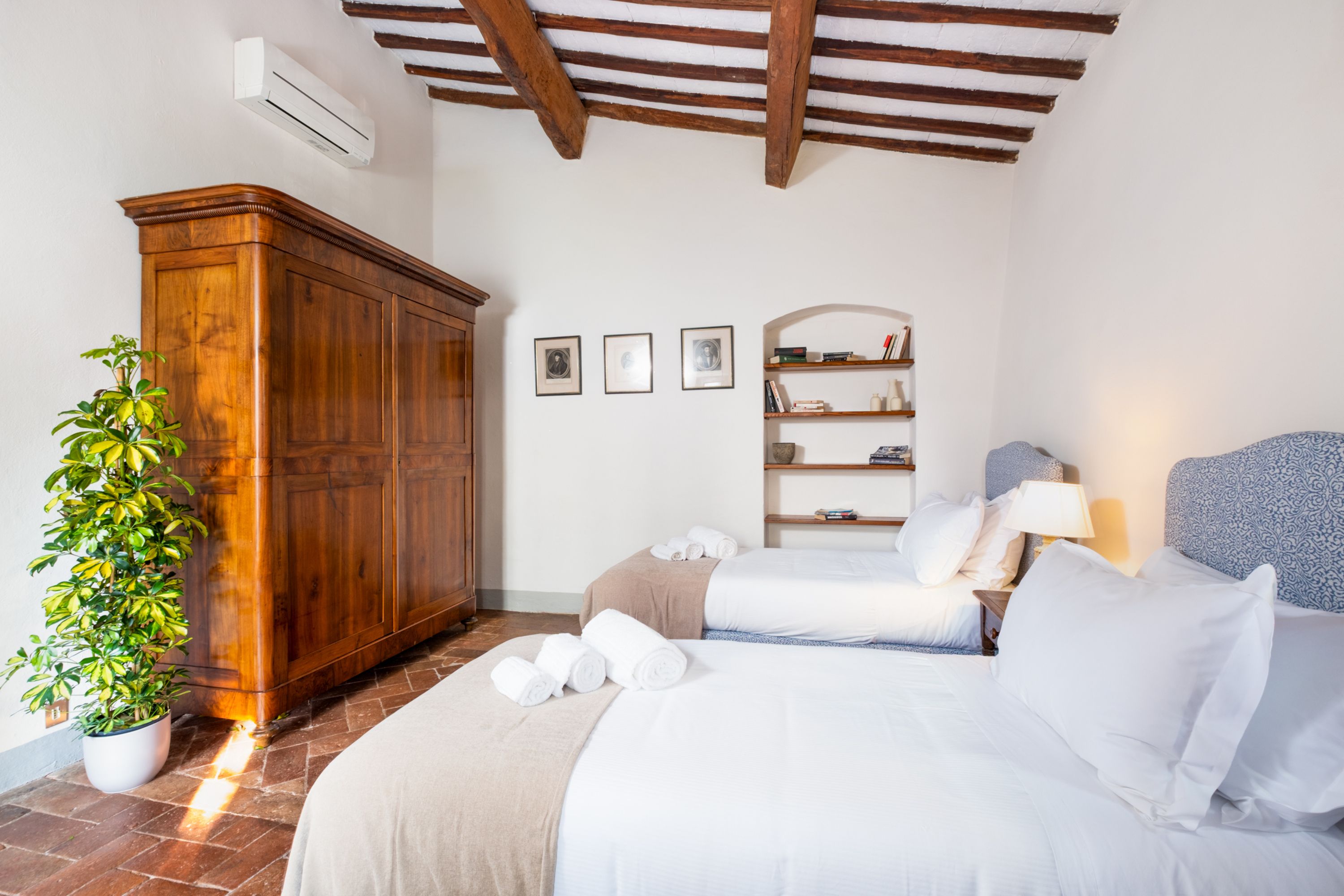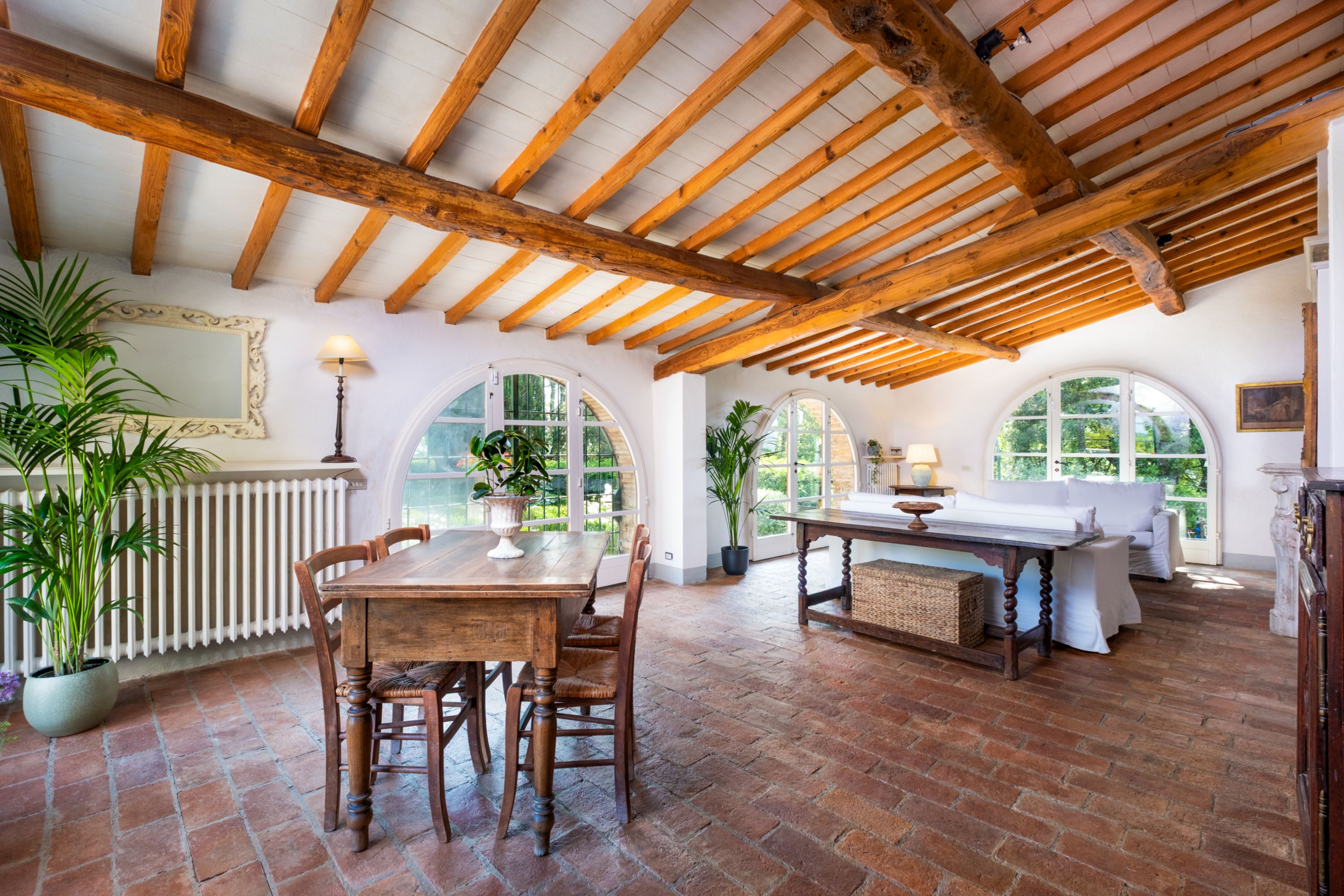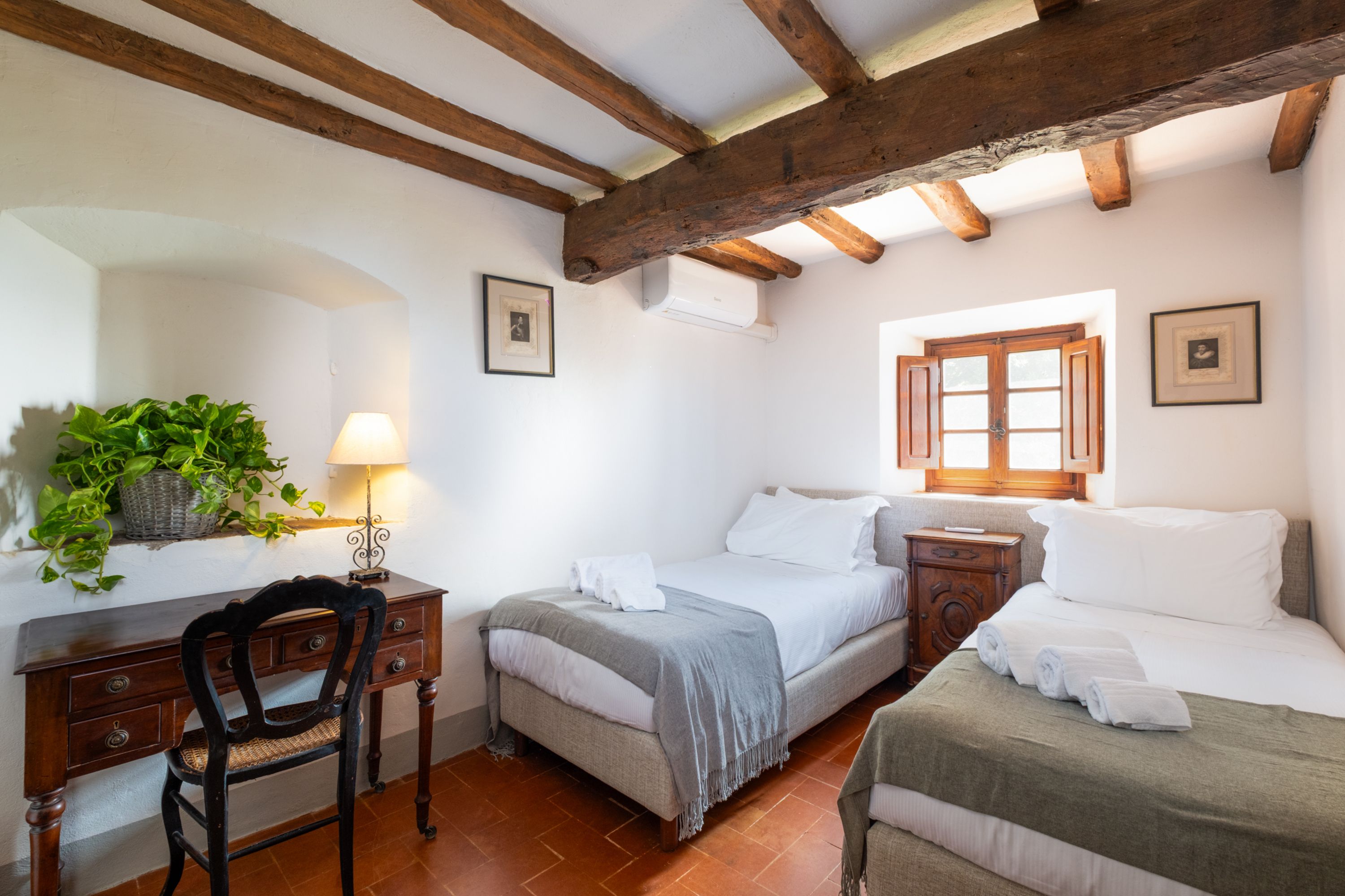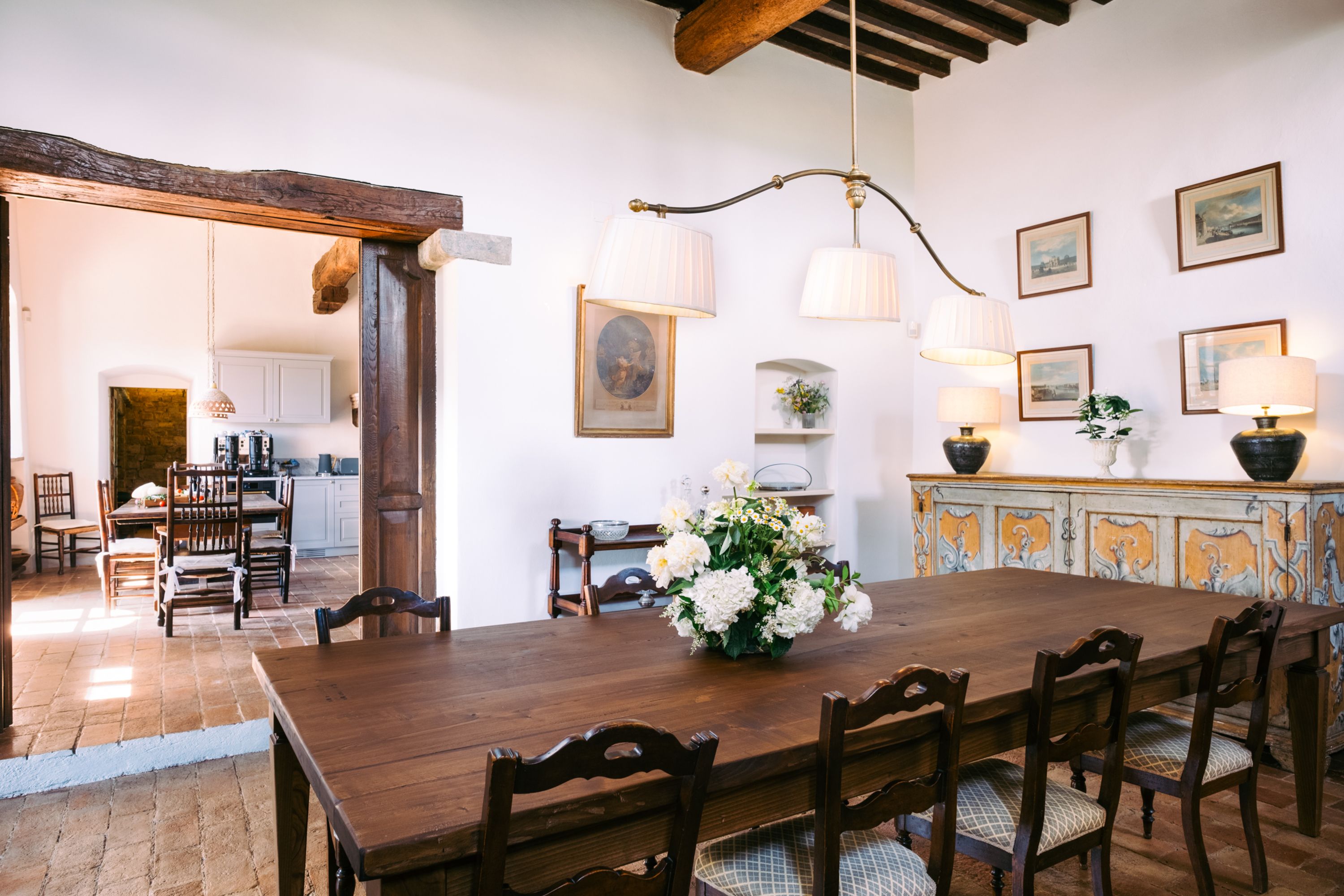 Amidst the olive groves and vineyards of the Chianti hills, this ancient spot offers a little slice of the good life. With foundations dating back to the 13th century, you can feel the history in the bones of this building. The kitchen looks like a grand master’s painting of a farmhouse scene – dried flowers and pots hanging from the rafters, a gas range-style cooker in the old hearth and a solid-wood breakfast table. There’s something medieval and grand about the main lounge with its wall-sized tapestry and huge, stone fireplace. A second, family room is more 19th-century-chic with arched windows brightening the space, an antique bureau and book-lined walls. The cavernous, vaulted games room boasts a pool table and classic book collection, and bedrooms are decked out with draped headboards and curtained four-posters fit for royalty.