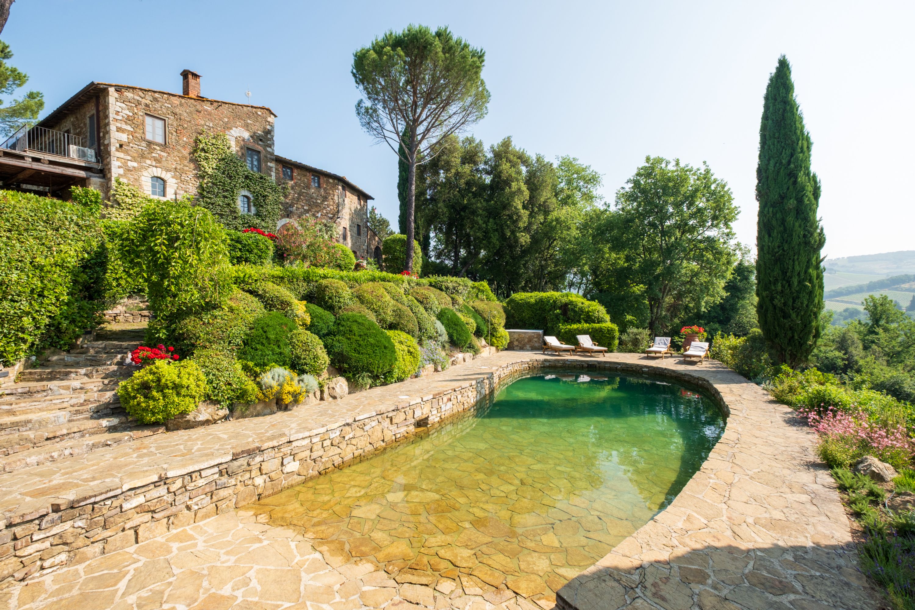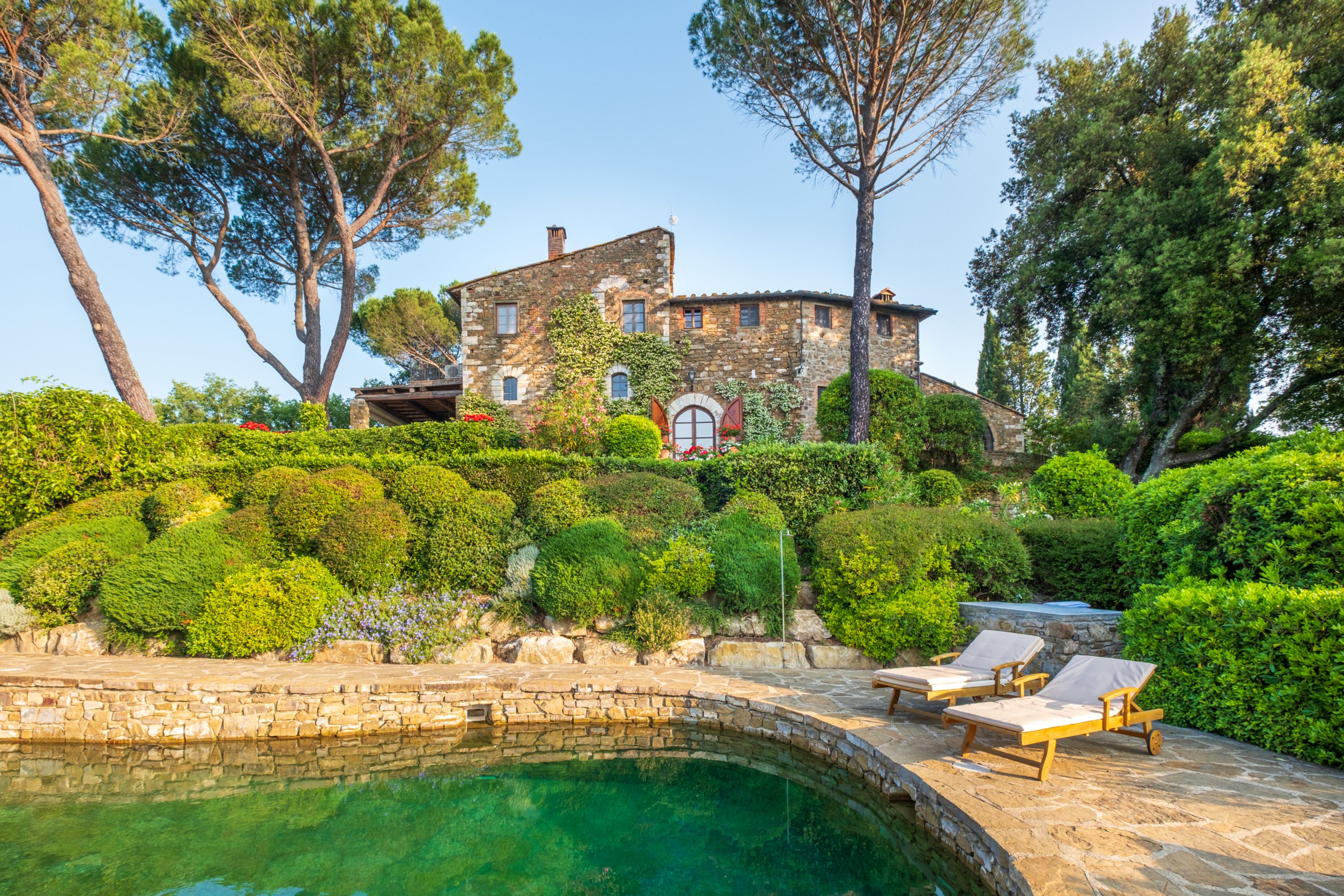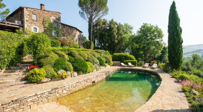 Outside, the swimming pool is something to behold; set in stone and slipping naturally into an emerald green pool. The gardens are bursting with herbs and flowers and, wandering the huge grounds, you’ll find tennis courts, boules, outdoor dining under a vine-covered pergola, comfy seating under gazebos and views of the surrounding Chianti hills as far as the eye can see.