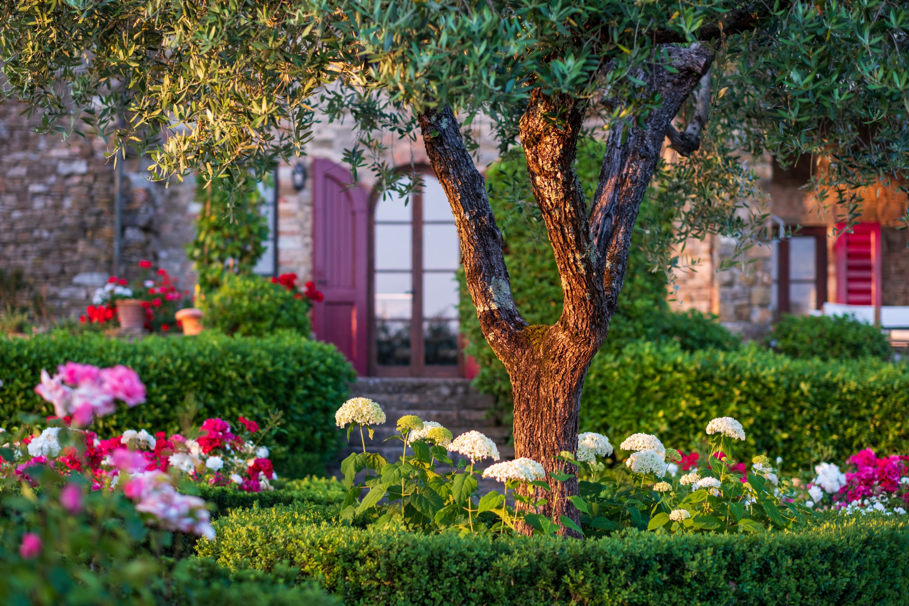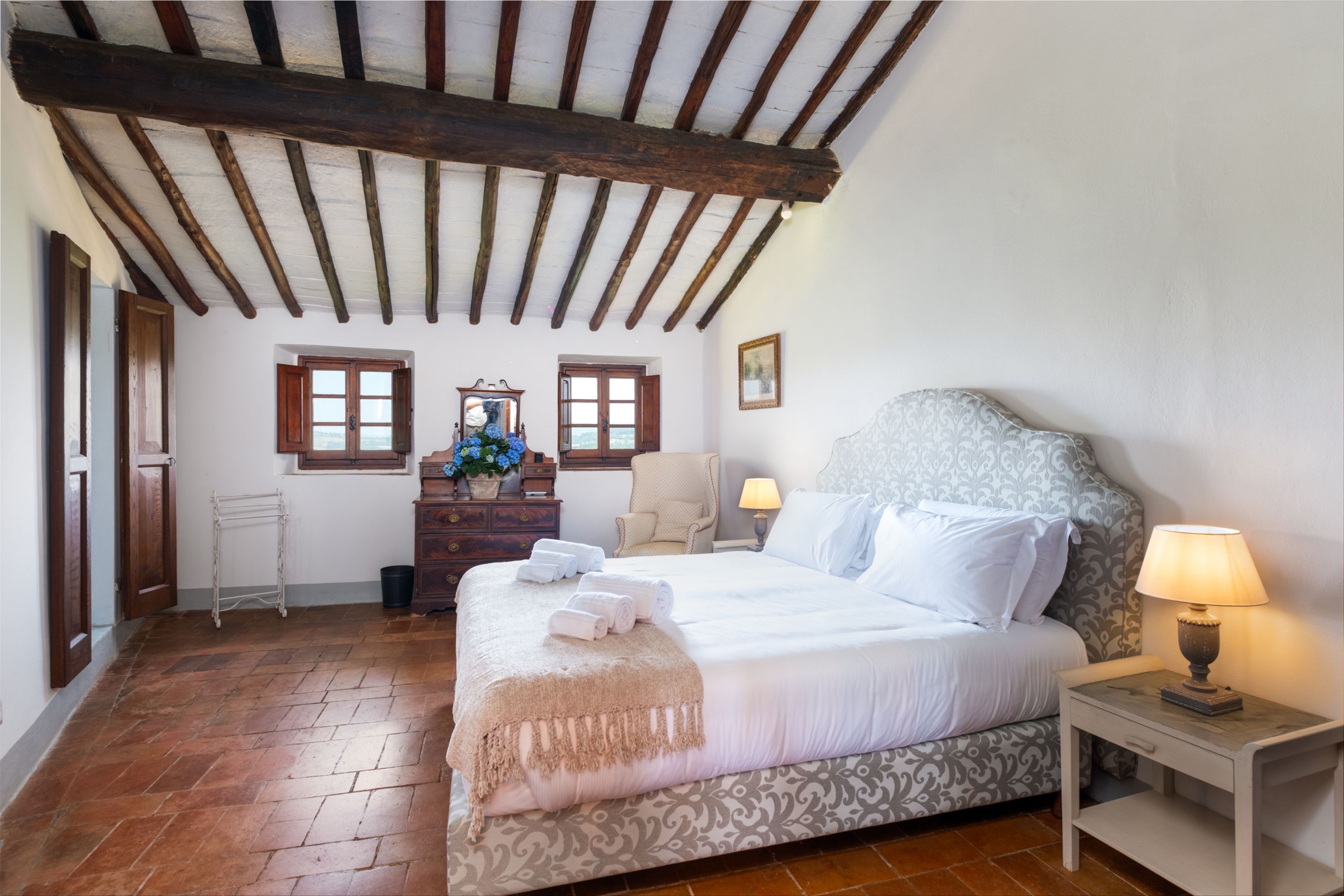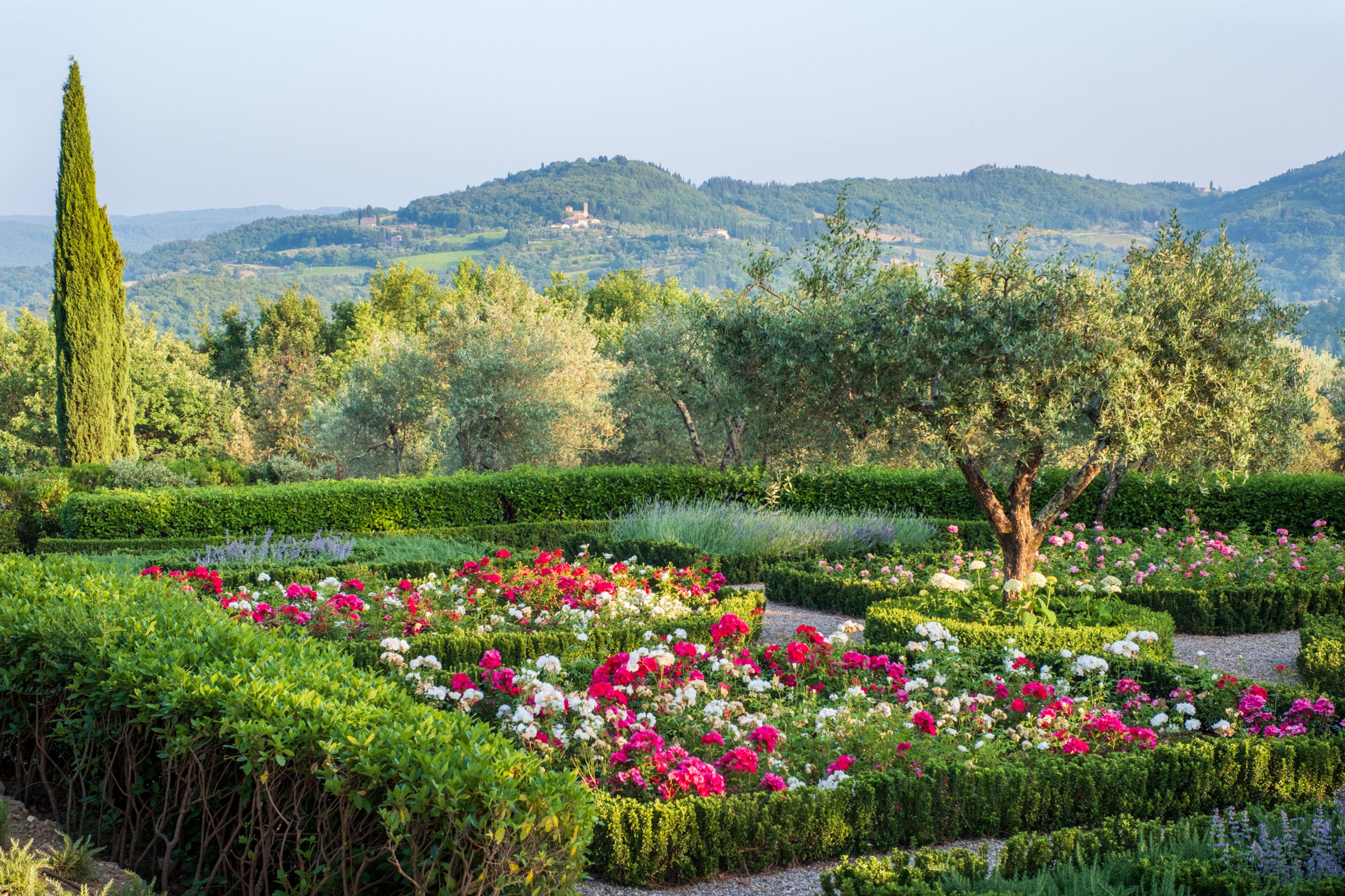 Outside, the swimming pool is something to behold; set in stone and slipping naturally into an emerald green pool. The gardens are bursting with herbs and flowers and, wandering the huge grounds, you’ll find tennis courts, boules, outdoor dining under a vine-covered pergola, comfy seating under gazebos and views of the surrounding Chianti hills as far as the eye can see.
