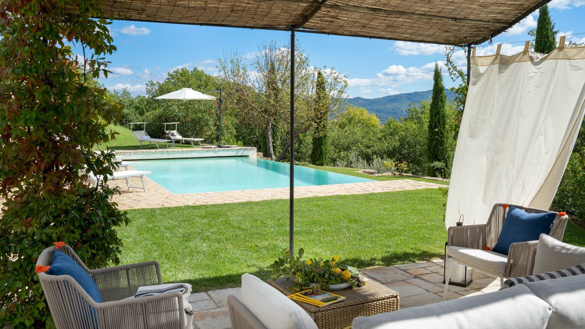 You'll find this restored Tuscan farmhouse at the top of a hill, overlooking the rolling green countryside which is dotted with olive groves, cypresses and fruit trees. Showcasing plenty of rustic charm, you'll be surrounded by original features here, from vaulted ceilings to stone walls and terracotta tiles. While indoors you'll have everything you need to feel right at home, the garden is a real gem, offering a swimming pool and plenty of comfy seating. Enjoy a slow start to the day with a refreshing dip or simply curl up on the outdoor sofa with a cup of coffee. Surrounded by lavender, sage and an array of colorful flowers, the outdoor space here is truly a treat for the senses.