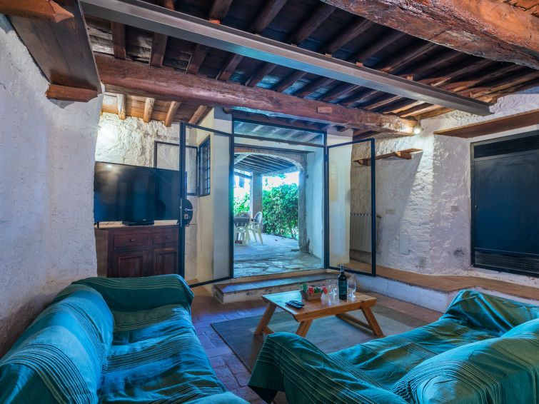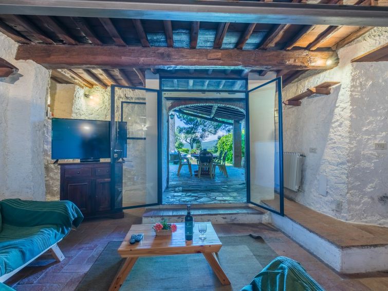 "Taverna", 5-room house 112 m2 on 3 levels. Spacious, practical and rustic furnishings: living room with TV (flat screen). Kitchen-/living room (oven, dishwasher, 4 induction hot plates) with dining table. Upper floor: 2 double bedrooms, each room with shower/WC. 2nd upper floor: 1 double bedroom with shower/WC.