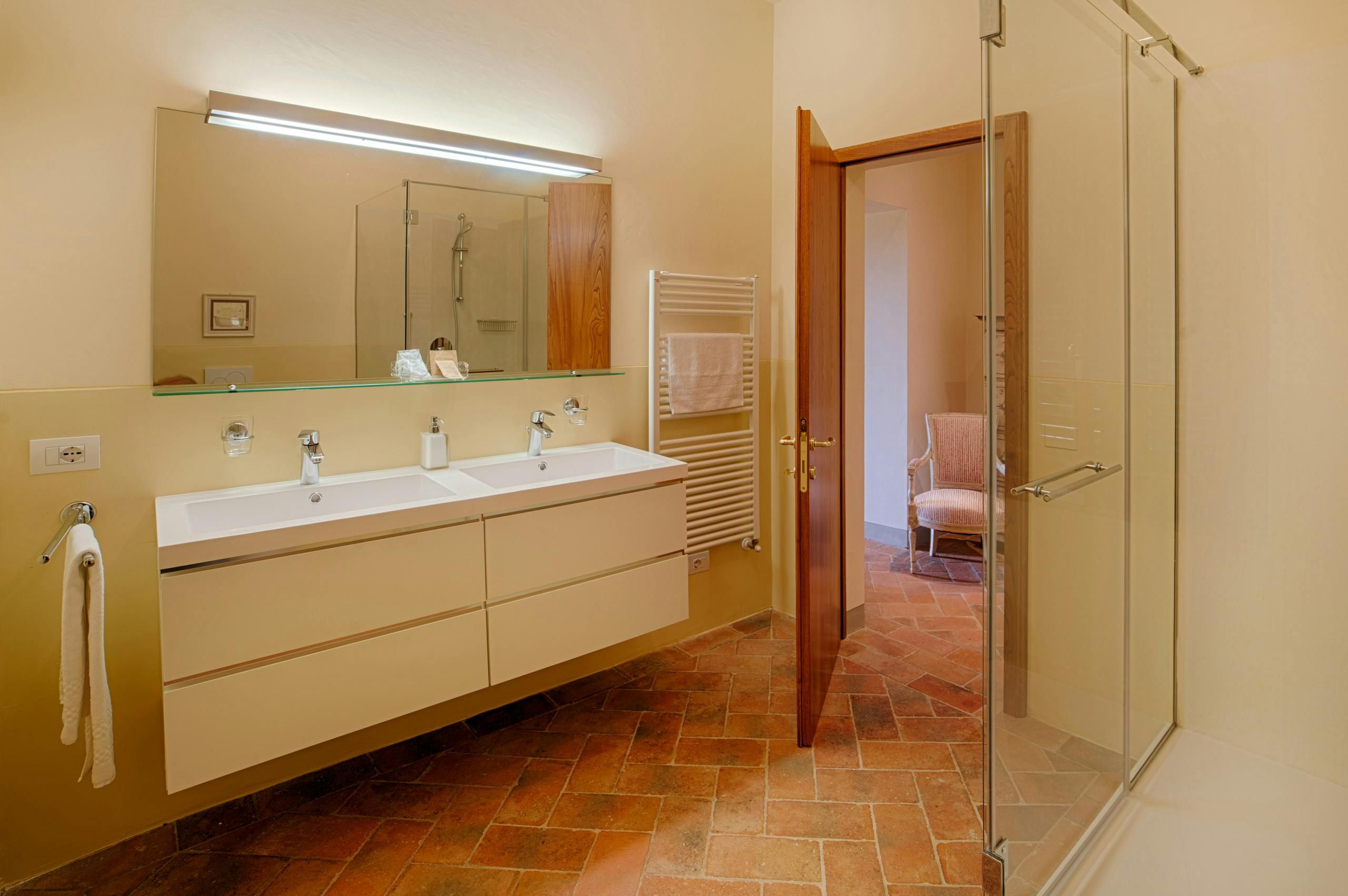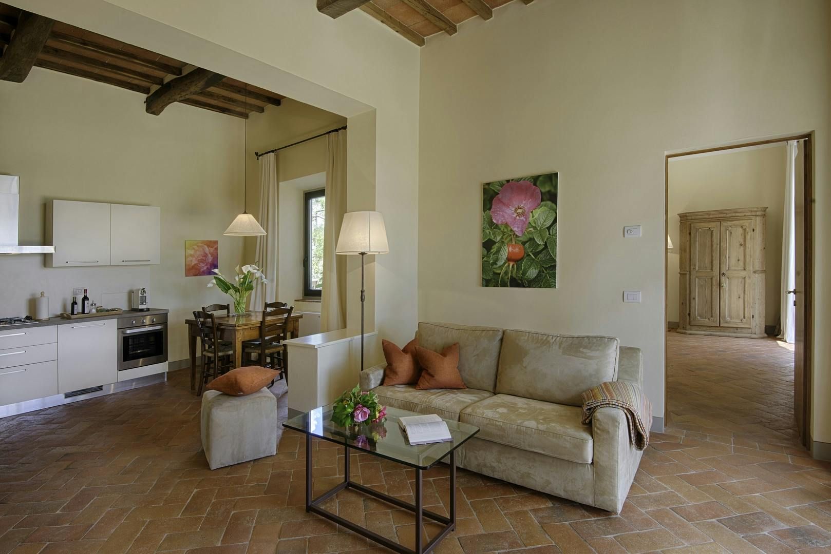 This Tuscan estate was built in the 1920s and was recently restored, creating peaceful apartments and villas surrounded by vineyards, olive groves and oak woods. This apartment embraces the old traditions of provincial Italy – some would call it dated, but we say the open-plan kitchen, living and dining room are homely and terracotta floors keep your feet cool in summer. Guests here have access to a large shared swimming pool which has a stunning view of the Tuscan hills. Plus, breakfast is included and your host can arrange wine tastings on request.