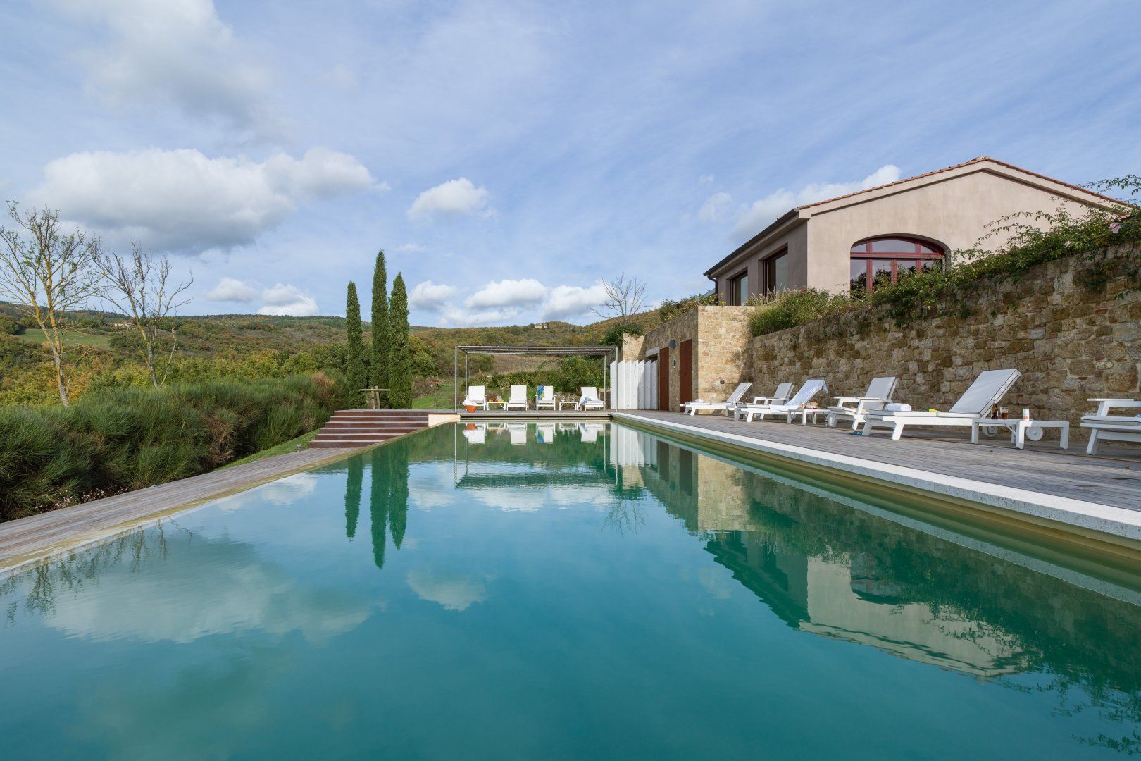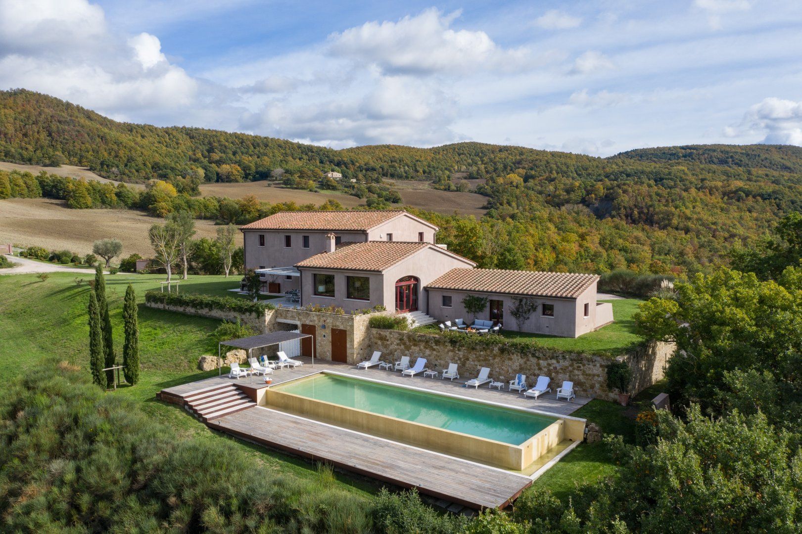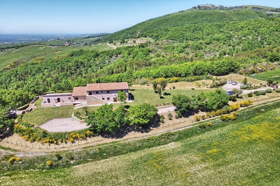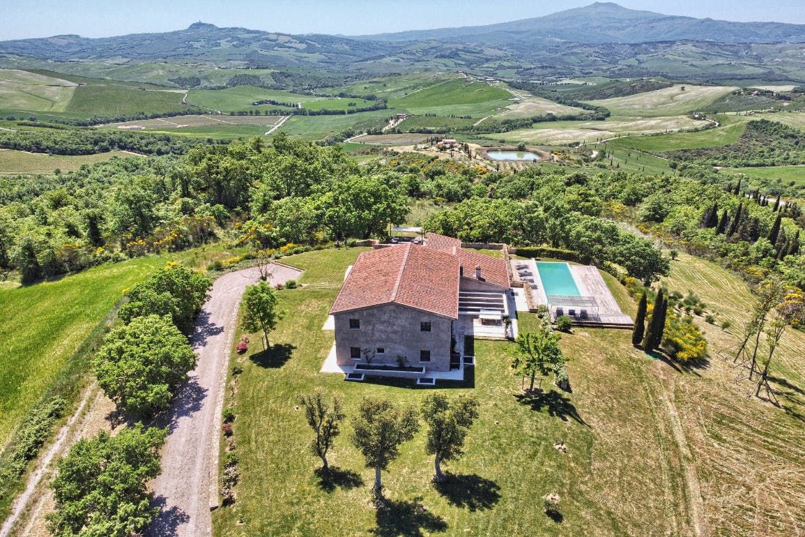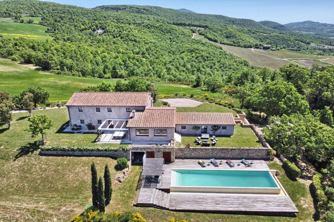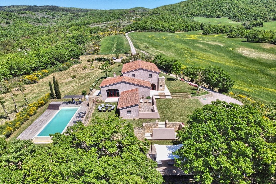 You can't beat the views of the beautiful Val D'Orcia, itself a UNESCO World Heritage Site, from this Tuscan farmhouse lying in the Siena Province on a private two-acre estate. Tear yourself away from the vistas, and you'll find a deft renovation, combining contemporary interiors and historic charm. An excellent choice for a large group of friends or family, there's plenty of space to spill out and feel at home here. Cool off from the Tuscan sun in the infinity pool. Put to use the vast, chef-worthy kitchen (we're talking two dishwashers, two ovens, and some) for a big dinner party – a private chef is bookable for fine dining. Or keep things easy and fire up the barbecue or pizza oven outside as breath-taking views of the valley spread out before you – best seen beneath the pergola at sunset with a glass of something chilled. And on chiller nights, hunker down beside the fireplace with a good book – there are two living rooms to choose from. When it's time to lay your head, hop in the home's elevator and take your pick from the many bedrooms, boasting king-sized beds and separate bathrooms. We'll let you decide who lucks out on that ground floor suite with bi-folds opening onto the lawned gardens. Should you ever wish to leave this idyll, you'll find you're in an excellent base to uncover Tuscany's vineyards and historic villages, starting in Sarteano, just a ten-minute drive away. With its tempting trattorias and beguiling historic charms, you'll be off to a flying start.