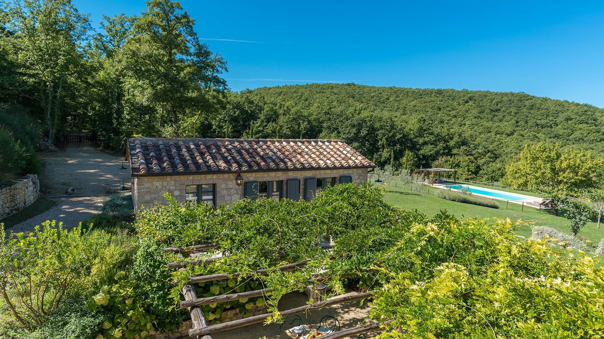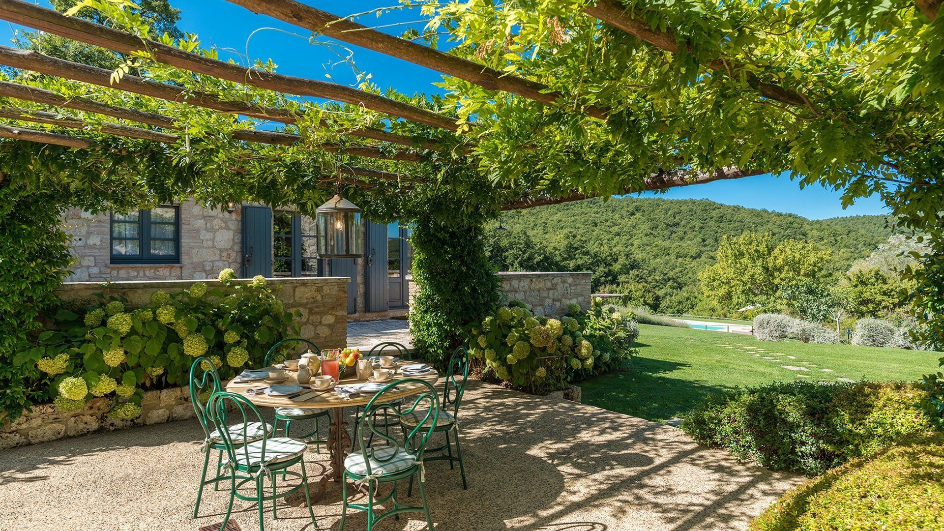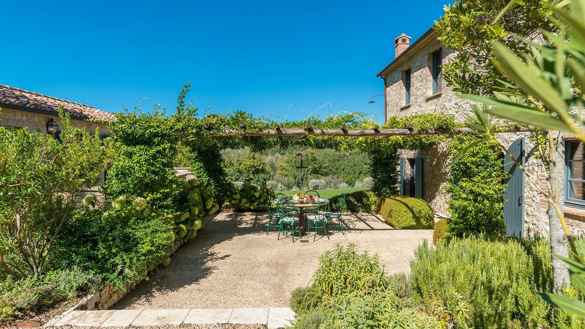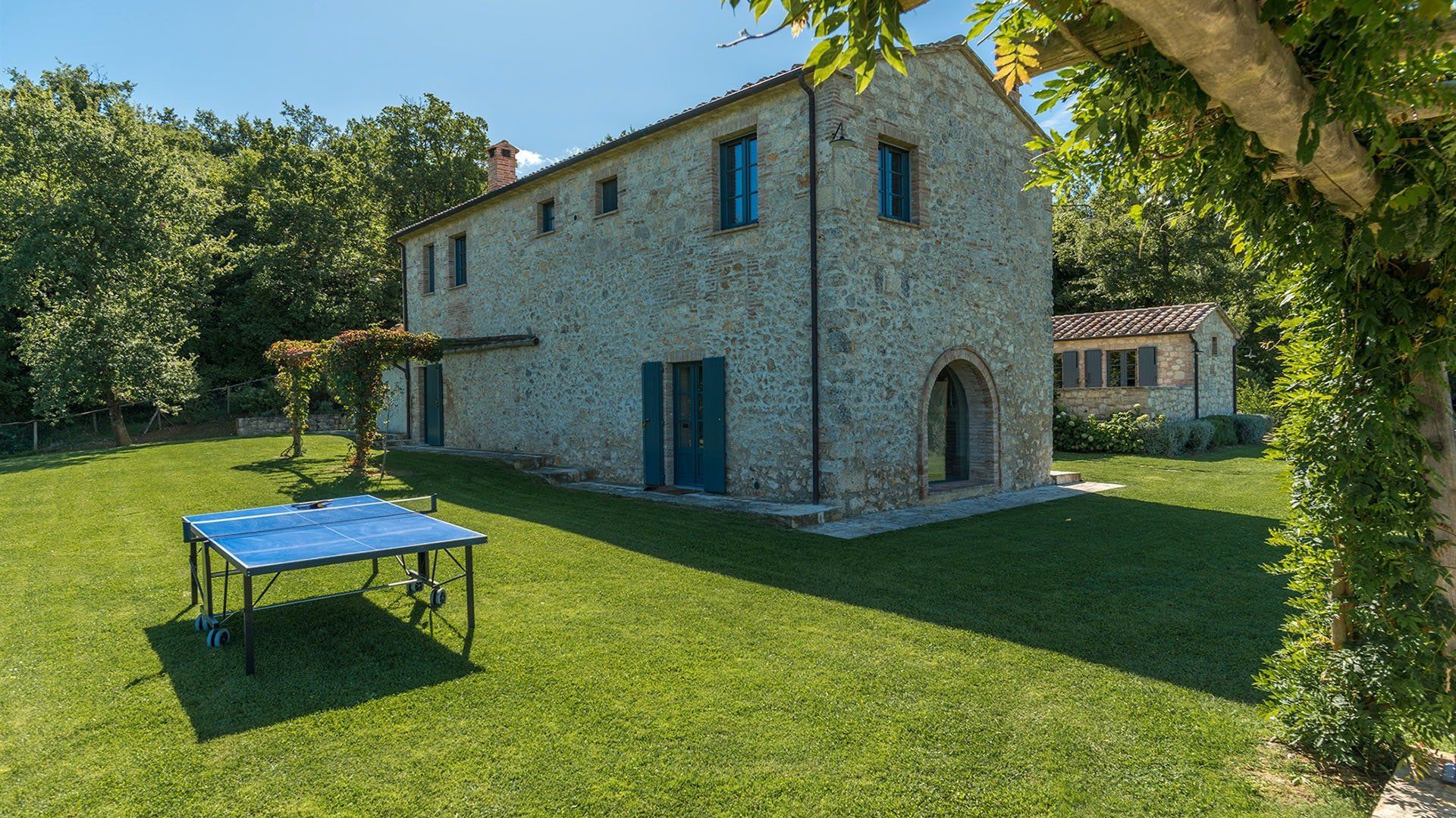 Just outside the charming village of Sarteano, this cosy villa is surrounded by woodland and rolling Tuscan countryside. We love the arched window looking out over the garden – the perfect spot to curl up on a plushy sofa with a good book. To cool down, take a long swim in the pool before drying off for an aperitif on the terrace, just one of the many outdoor lounging areas. Indulge in long lunches under the shade of the greenery before a round of table tennis on the lawn. If you’re looking to add a touch of luxury to your holiday, the spa resorts of Chianciano Terme, Bagno Vignoni, and Bagni San Filippo are just half an hour away. Wine connoisseurs might enjoy a trip to Montepulciano to wash down a cheese tasting in Pienza. Art lovers will no doubt take the hour’s drive to Siena or Arezzo for a day drip. No matter what little adventures you decide to go on, be sure to stop and smell the flowers in the garden and feel the soft grass between your toes.