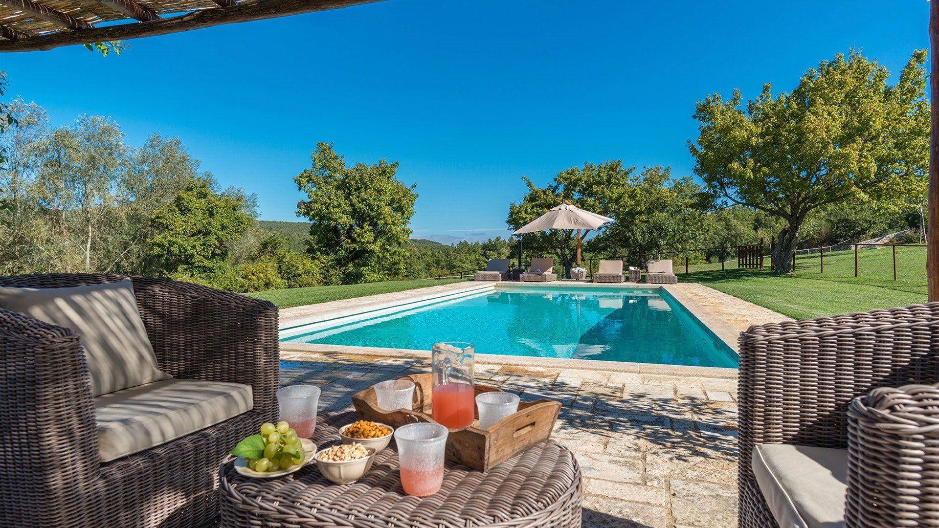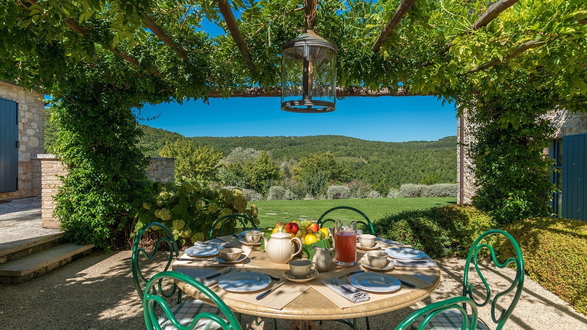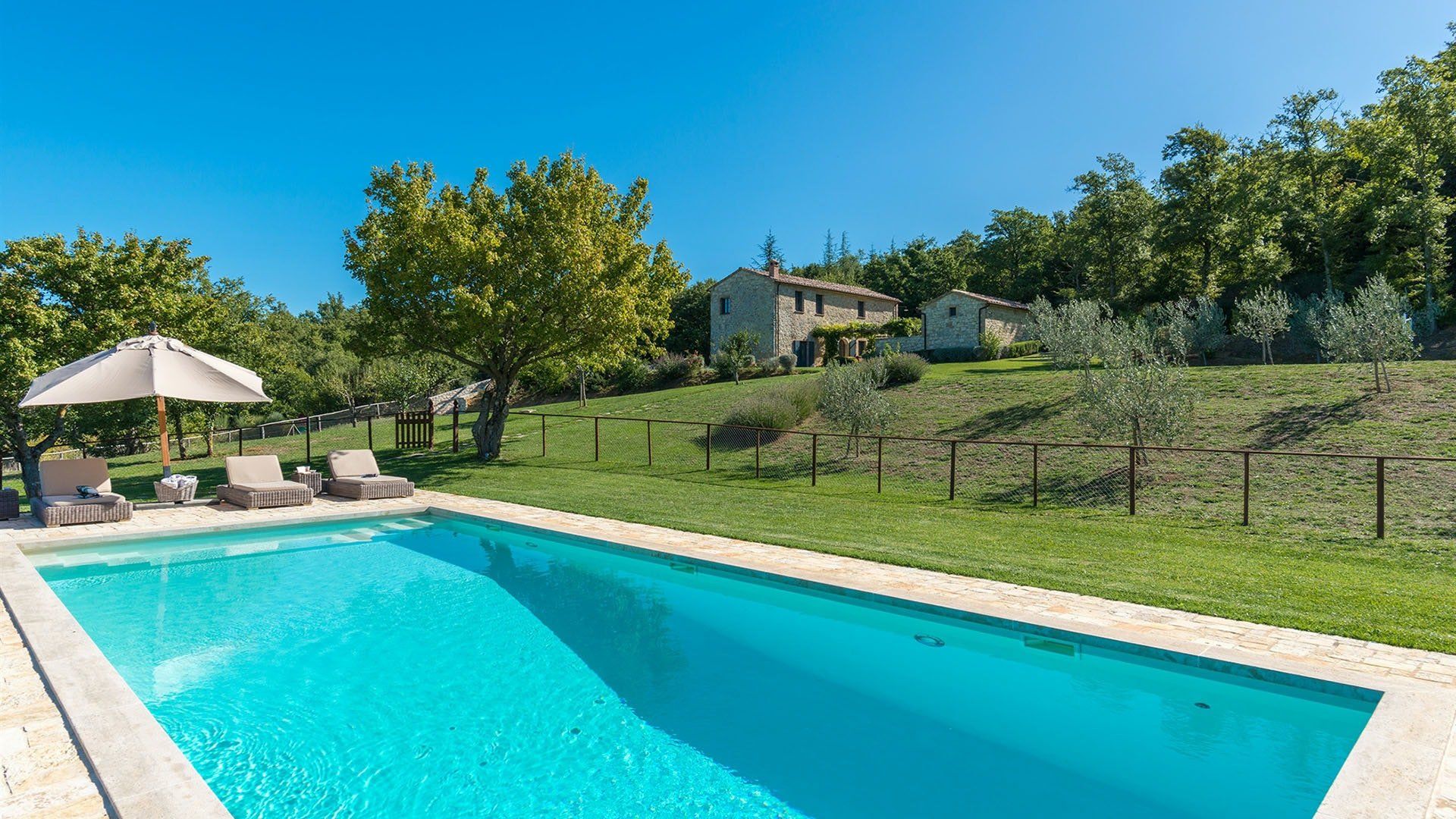 Just outside the charming village of Sarteano, this cosy villa is surrounded by woodland and rolling Tuscan countryside. We love the arched window looking out over the garden – the perfect spot to curl up on a plushy sofa with a good book. To cool down, take a long swim in the pool before drying off for an aperitif on the terrace, just one of the many outdoor lounging areas. Indulge in long lunches under the shade of the greenery before a round of table tennis on the lawn. If you’re looking to add a touch of luxury to your holiday, the spa resorts of Chianciano Terme, Bagno Vignoni, and Bagni San Filippo are just half an hour away. Wine connoisseurs might enjoy a trip to Montepulciano to wash down a cheese tasting in Pienza. Art lovers will no doubt take the hour’s drive to Siena or Arezzo for a day drip. No matter what little adventures you decide to go on, be sure to stop and smell the flowers in the garden and feel the soft grass between your toes.