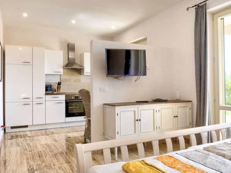 "Stella - Villa di Sogno", 1-room apartment 40 m2, on the ground floor. Bright, beautiful and tasteful furnishings: living/sleeping room with 1 sofabed, 1 double bed, dining table and satellite TV. Exit to the terrace. Kitchenette (oven, dishwasher, 4 ceramic glass hob hotplates, electric coffee machine).
