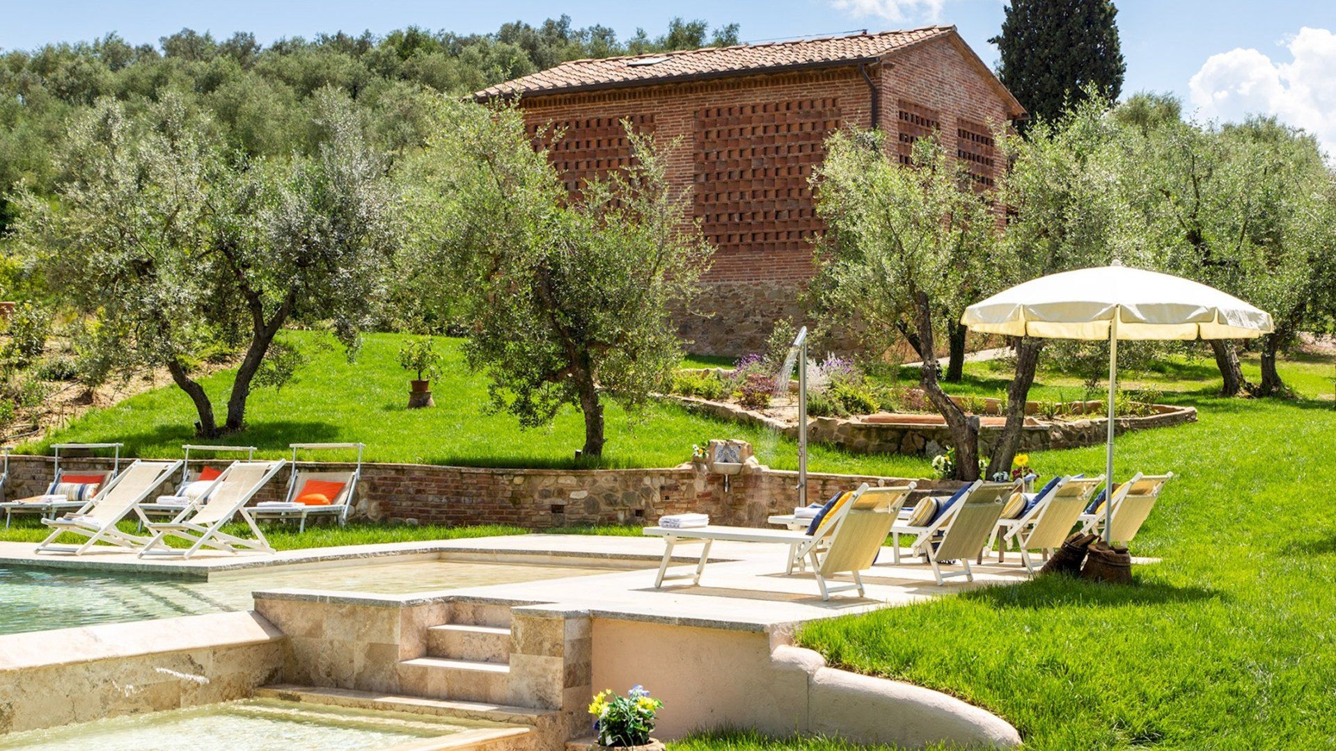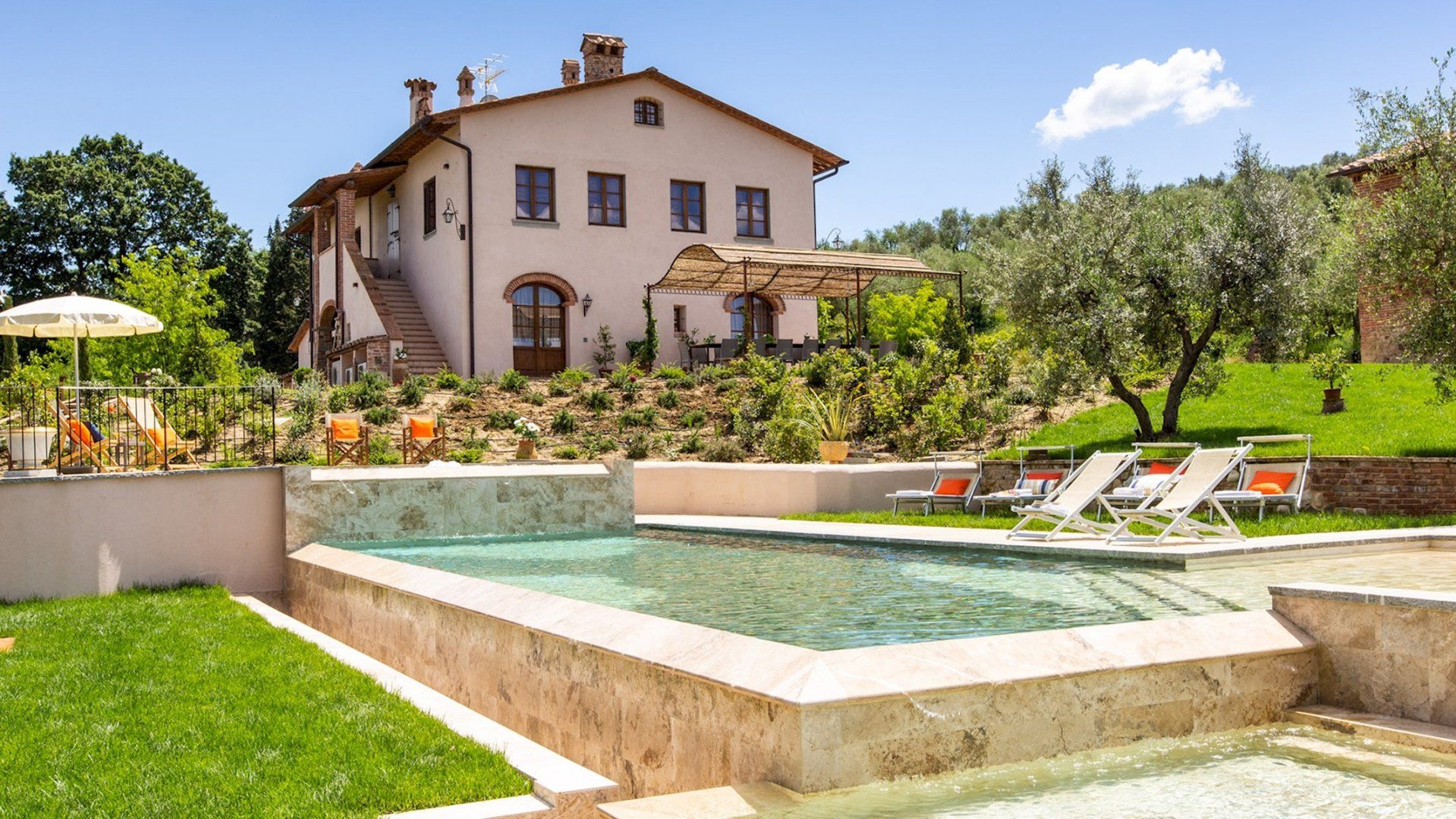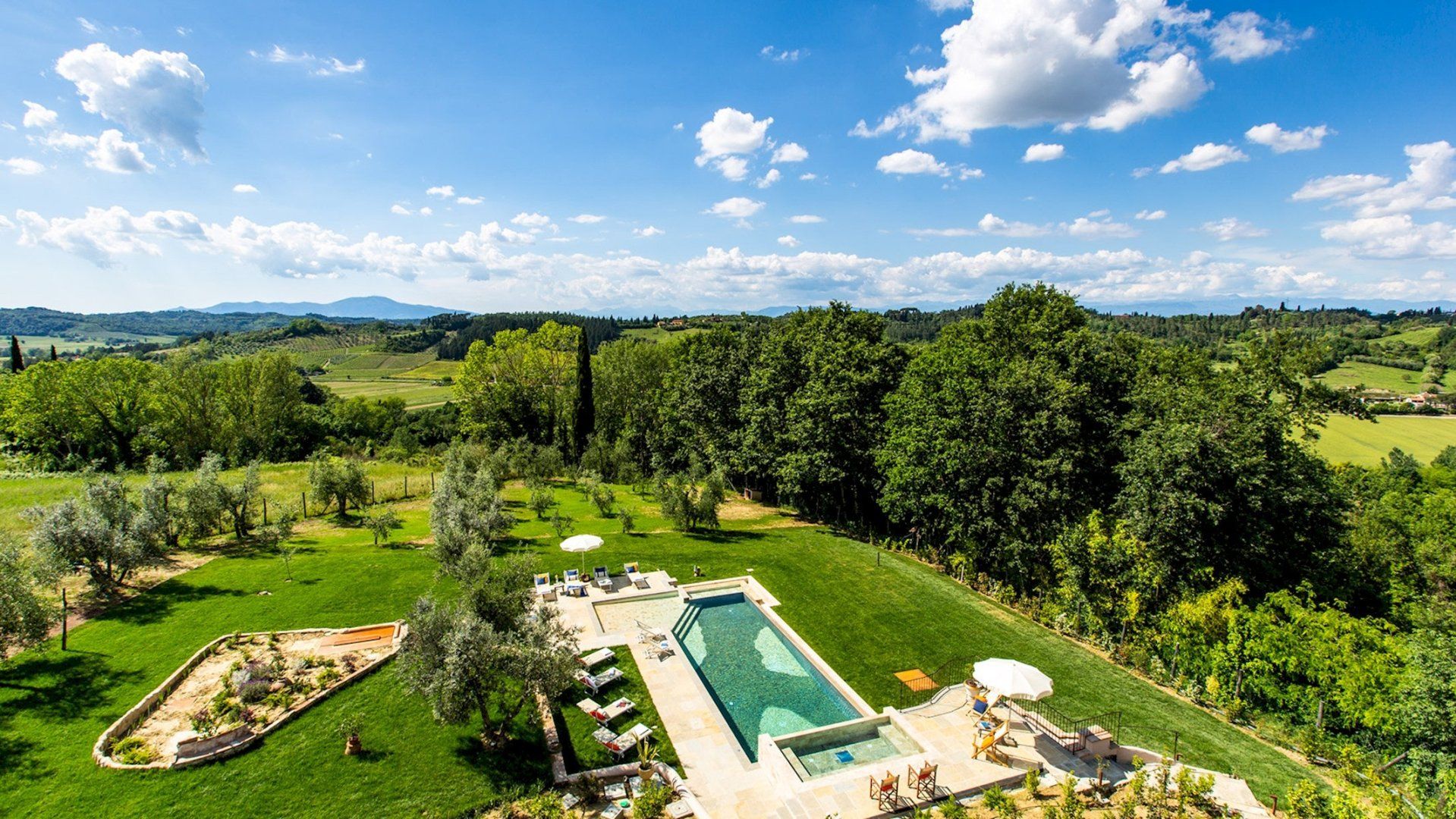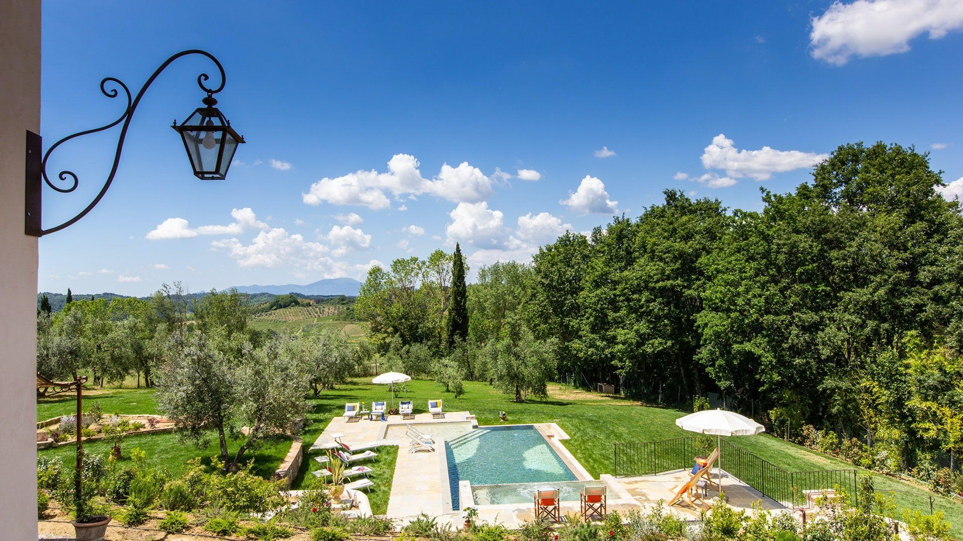 Sitting proudly amongst the Tuscan hills, this fine villa looks out across olive groves and vineyards, as well as an ancient hilltop fort. Equidistant between the provinces of Florence and Pisa, there is a wealth of cultural gems to explore, including the nearby town Vinci (of Leonardo fame). The grounds and gardens are extensive and beautiful, interspersed with olive trees and sweet-scented Mediterranean herbs. The immaculate swimming pool is set over three levels, with the Jacuzzi cascading down into the infinity pool and then on into a shallower children’s pool. Inside the handsome villa, with its classic shuttered windows and scalloped terracotta roof tiles, you’ll find a cool and calm retreat from the Tuscan sun. Exposed brickwork and natural tones of sand and honeyed stone create a calming atmosphere, and there is lovely antique furniture throughout.