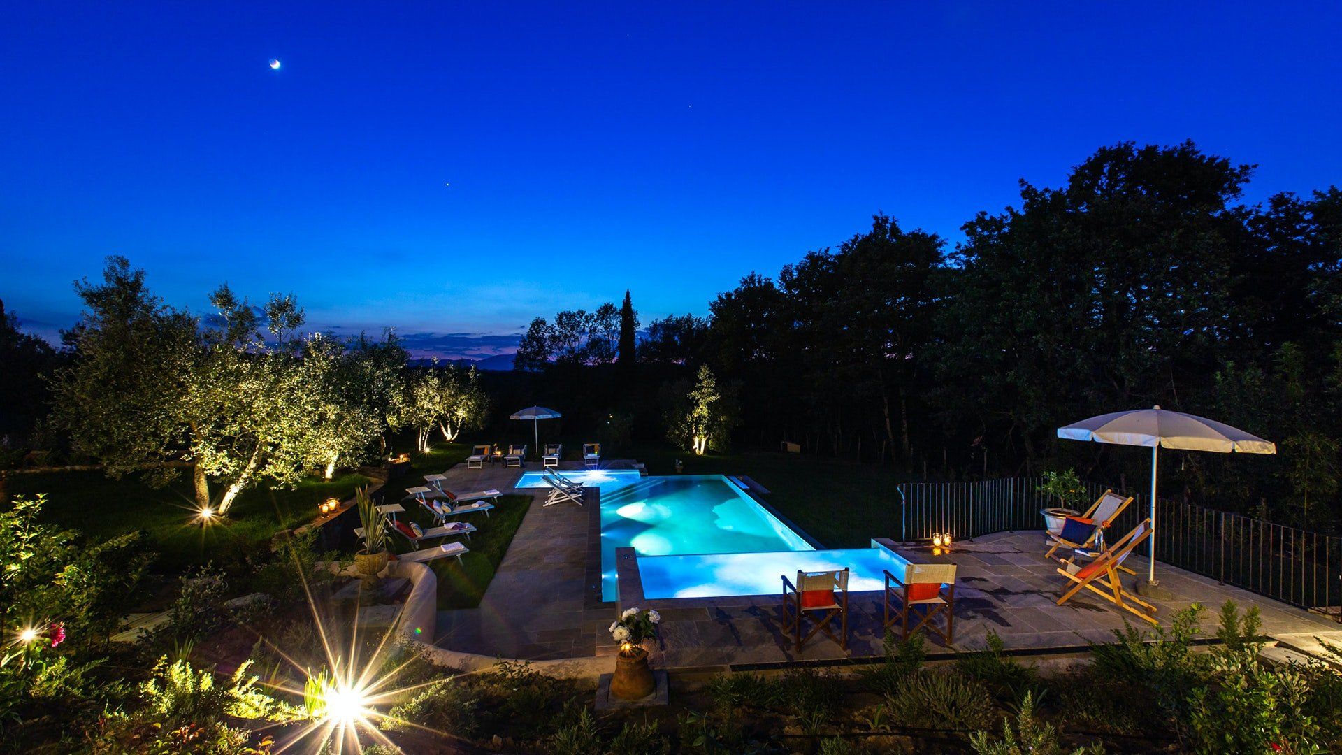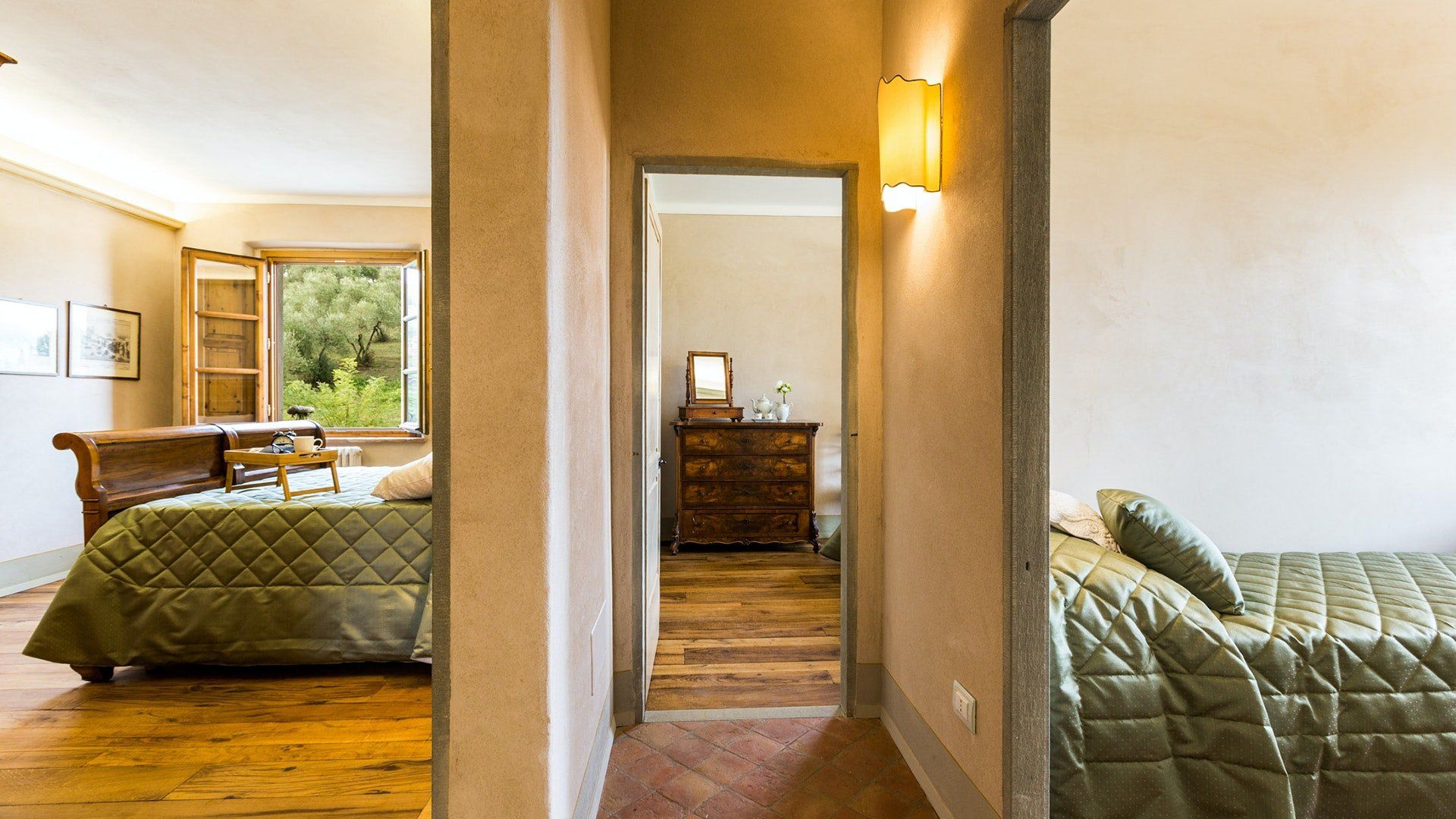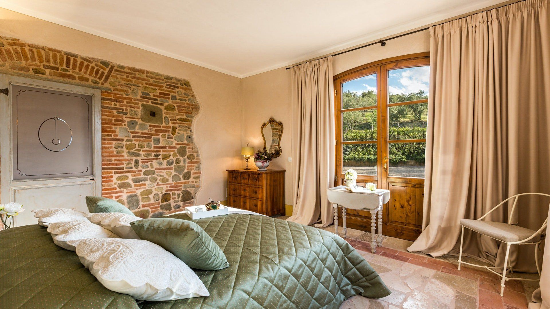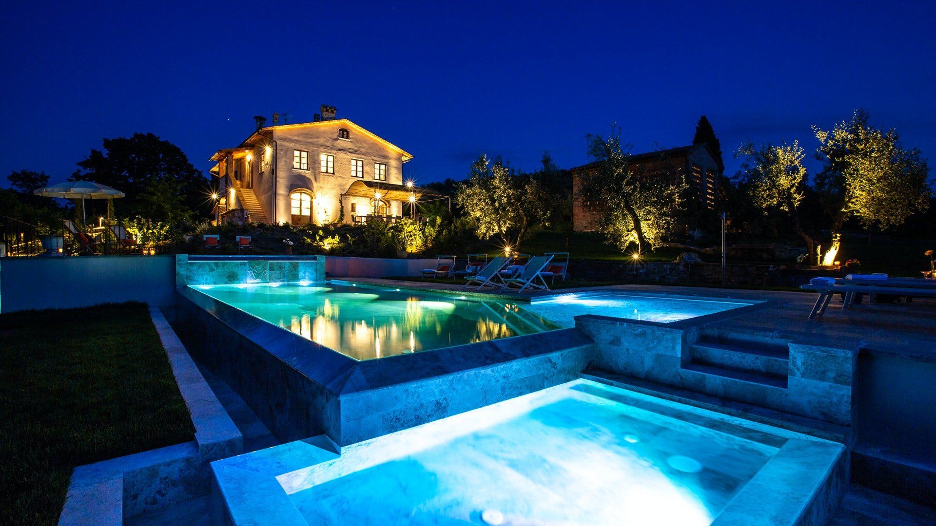 Sitting proudly amongst the Tuscan hills, this fine villa looks out across olive groves and vineyards, as well as an ancient hilltop fort. Equidistant between the provinces of Florence and Pisa, there is a wealth of cultural gems to explore, including the nearby town Vinci (of Leonardo fame). The grounds and gardens are extensive and beautiful, interspersed with olive trees and sweet-scented Mediterranean herbs. The immaculate swimming pool is set over three levels, with the Jacuzzi cascading down into the infinity pool and then on into a shallower children’s pool. Inside the handsome villa, with its classic shuttered windows and scalloped terracotta roof tiles, you’ll find a cool and calm retreat from the Tuscan sun. Exposed brickwork and natural tones of sand and honeyed stone create a calming atmosphere, and there is lovely antique furniture throughout.