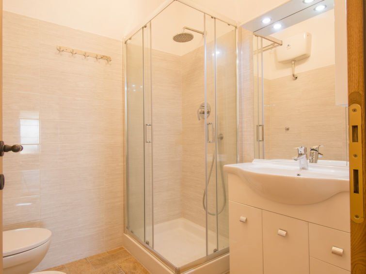 "Podere Sant'Elisa", 4-room apartment 105 m2 on 1st floor. Renovated in 2017, tasteful furnishings: 1 room with 1 french bed (160 cm), shower/WC. 1 room with 1 french bed (160 cm). 1 room with 3 beds (80 cm). Kitchen-/living room (oven, dishwasher, 5 gas rings, toaster, kettle, microwave, freezer, electric coffee machine) with dining table.