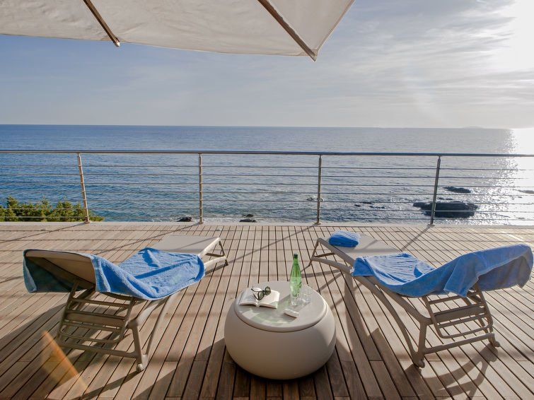 "Vistamare", 8-room house 450 m2 on 3 levels. Renovated in 2022, beautiful and tasteful furnishings: 1 double bedroom. 1 room with 2 beds (80 cm). Dining room with dining table. Exit to the terrace. Kitchen (oven, dishwasher, 5 induction hot plates, toaster, kettle, microwave, freezer, electric coffee machine).