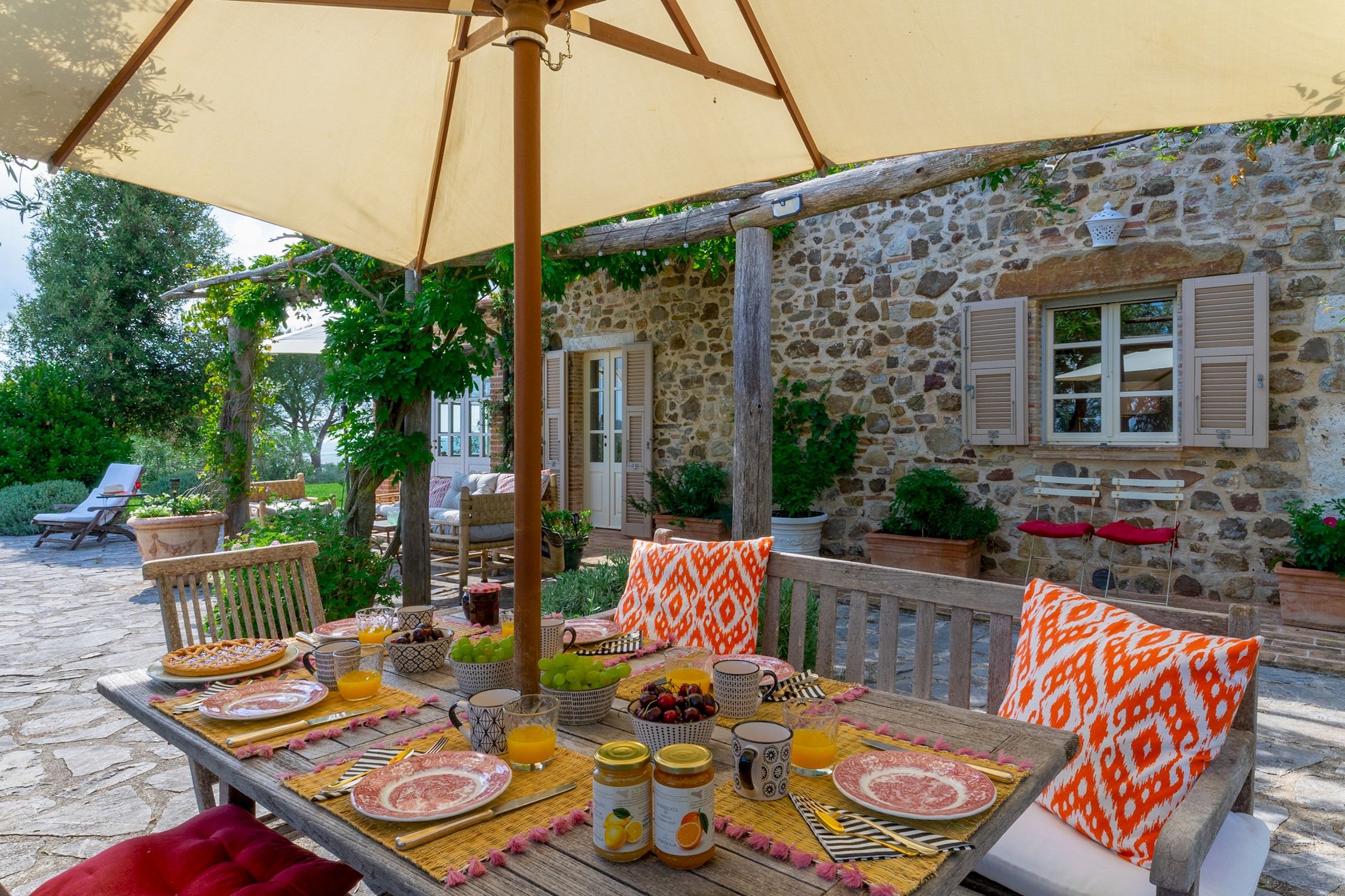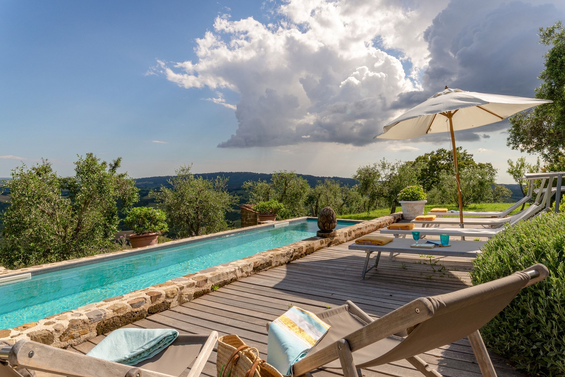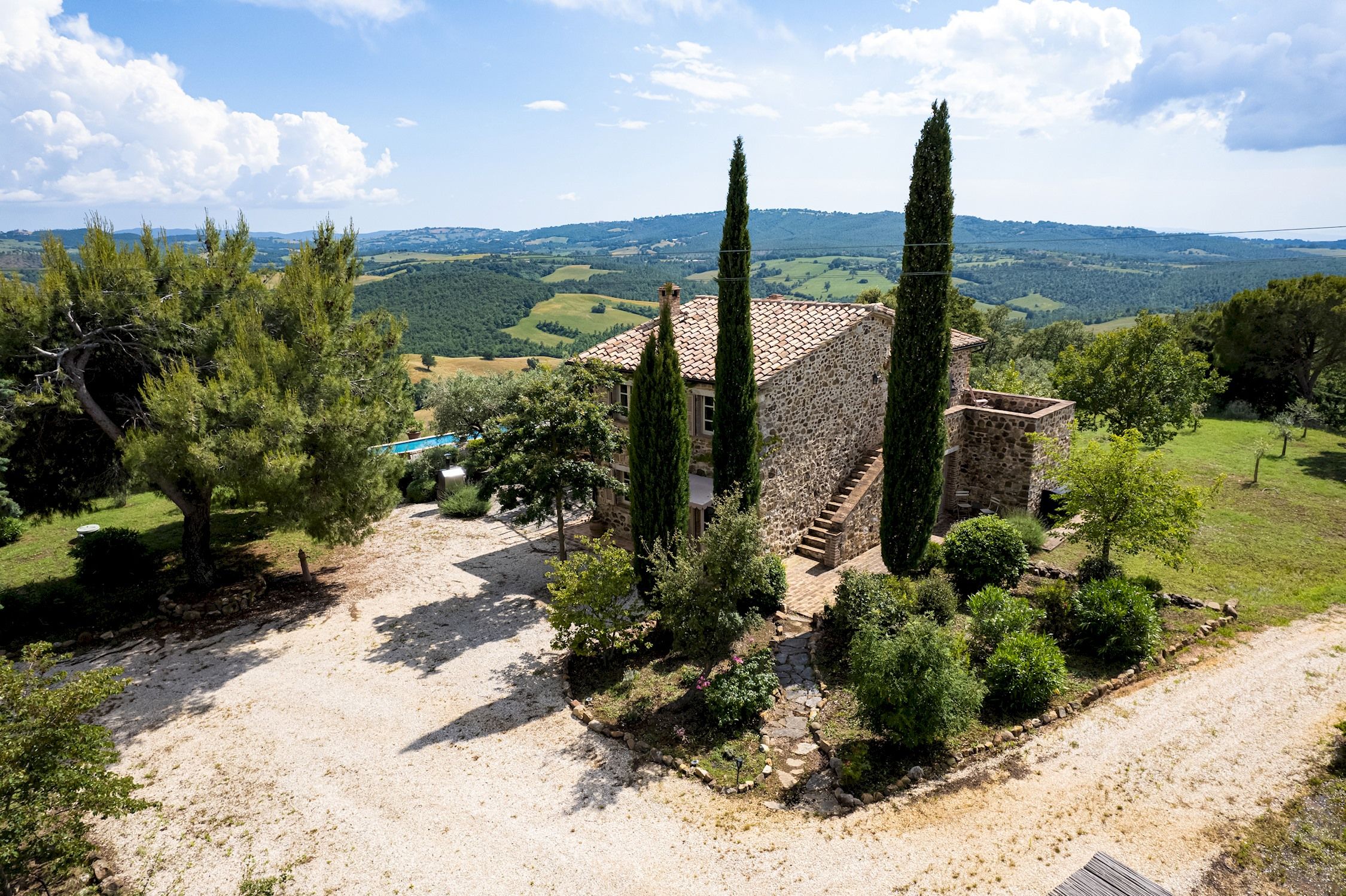 Romantic and whimsical, this beautifully renovated 19th-century farmhouse is nestled amid the rolling hills, olive groves, and vineyards of the Tuscan countryside. A wisteria- and rose-covered pergola frames the terrace and makes for a stunning spot for an alfresco meal, day or night, and the private swimming pool is perfectly positioned for enjoying the views. The house has been renovated to incorporate local craftsmanship, blending antique terracotta floors and chestnut ceiling beams with pastel hues – it’s pretty and comfortable. The thermal springs of Terme di Saturnia are a short drive away, and you can reach the coast in fifty minutes.
