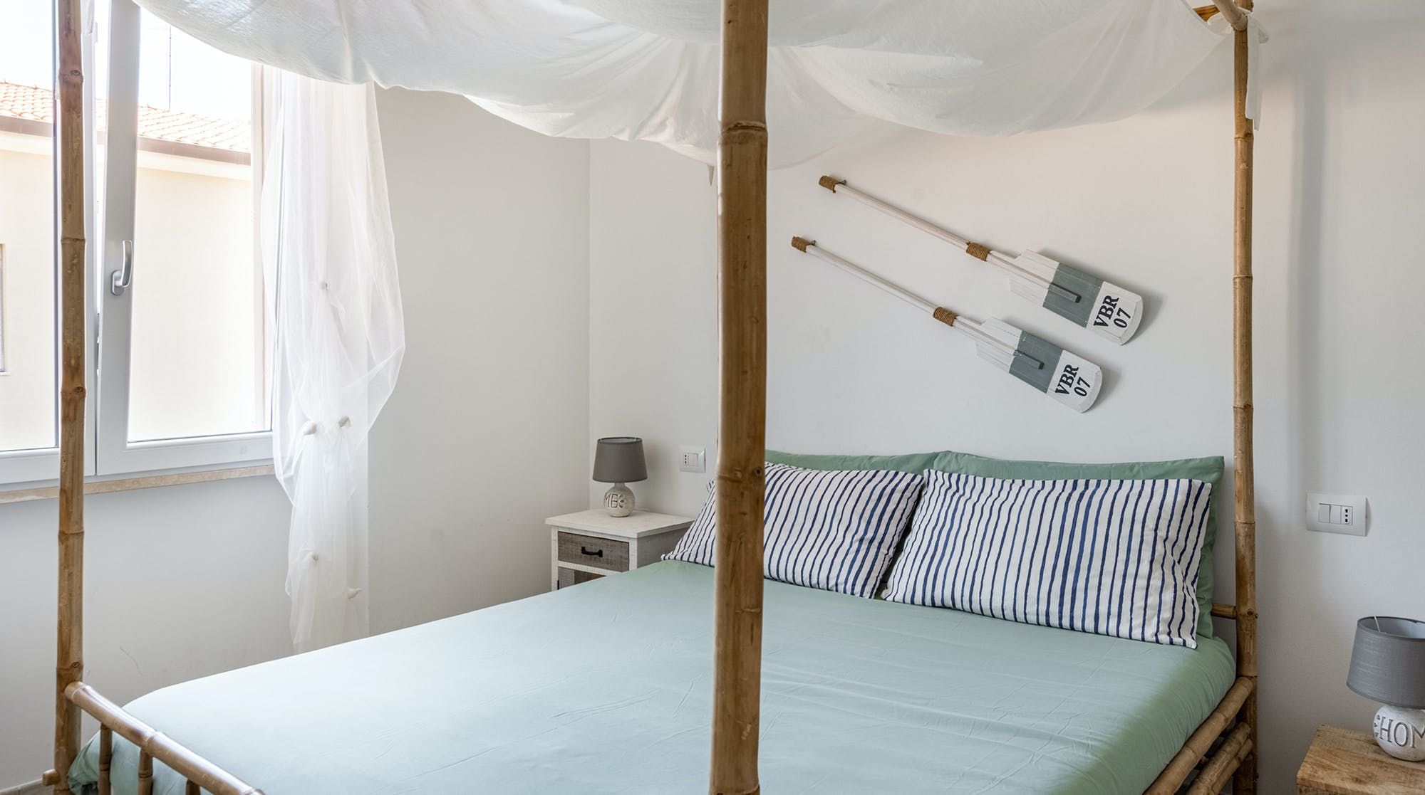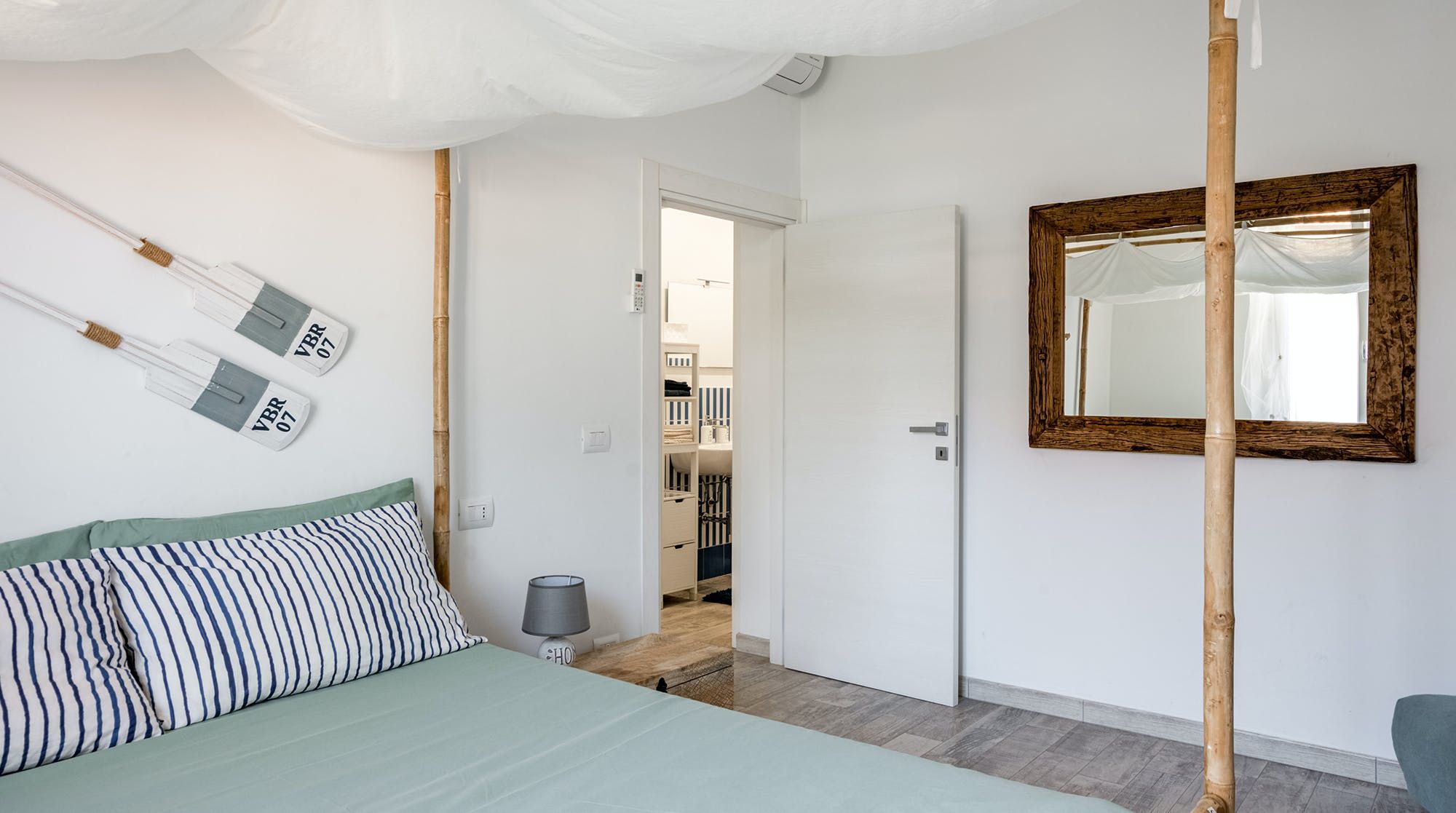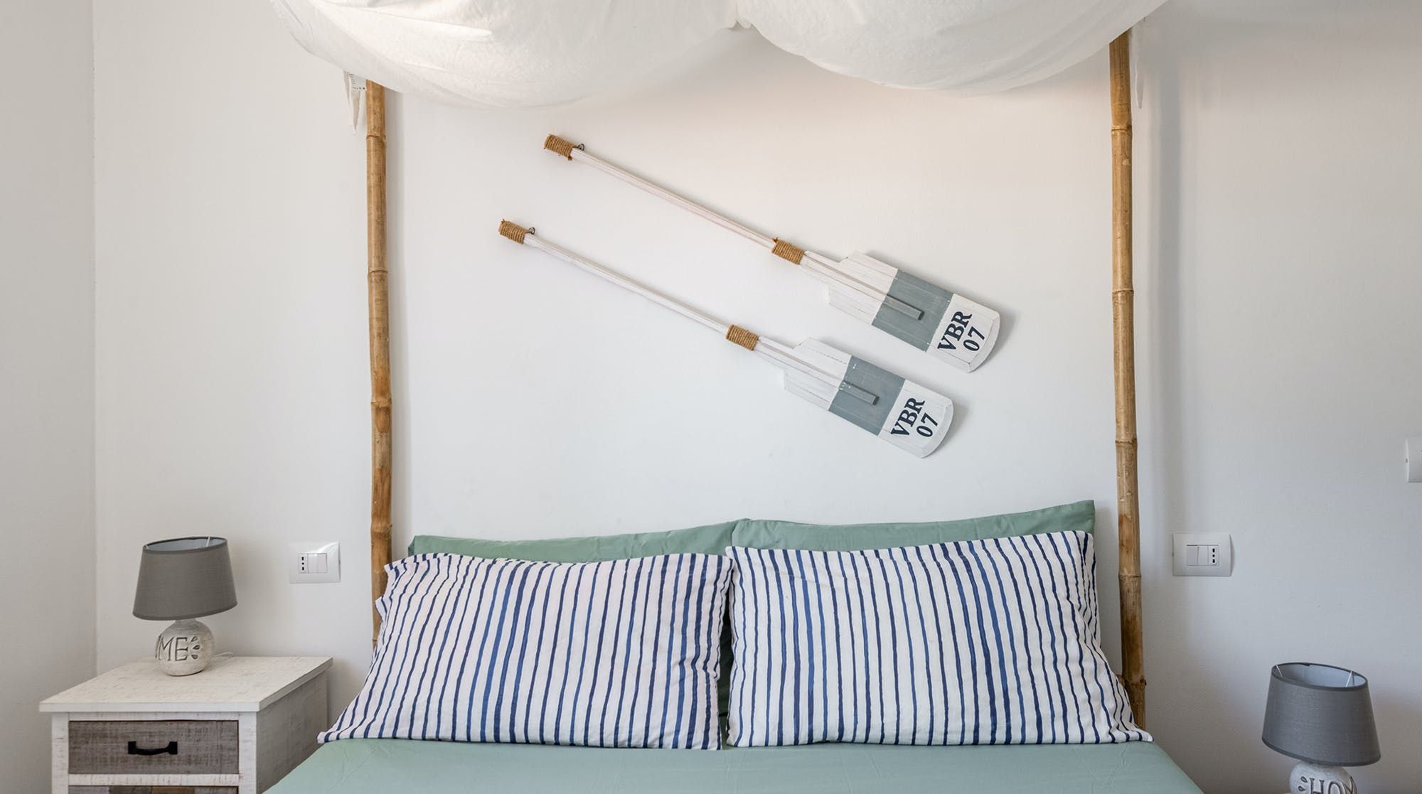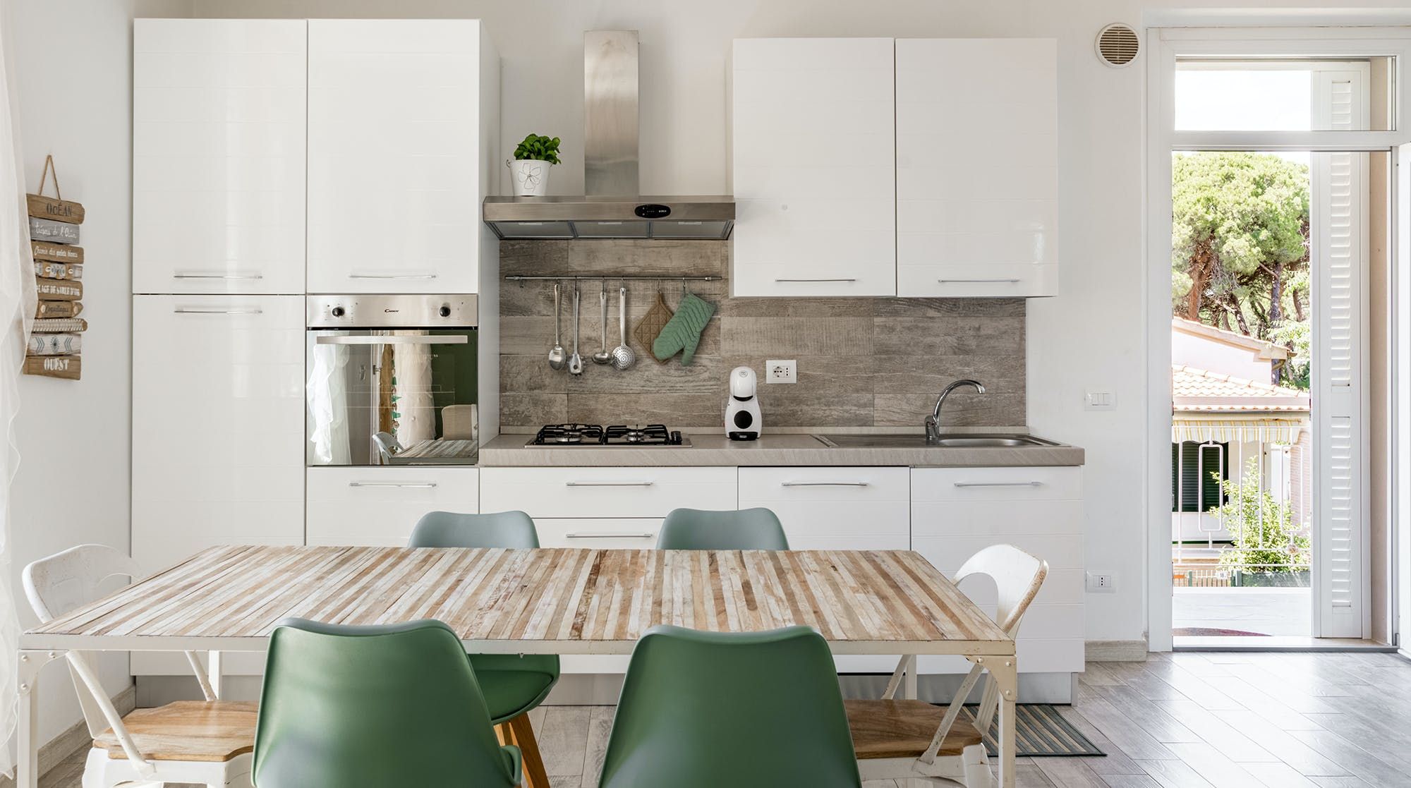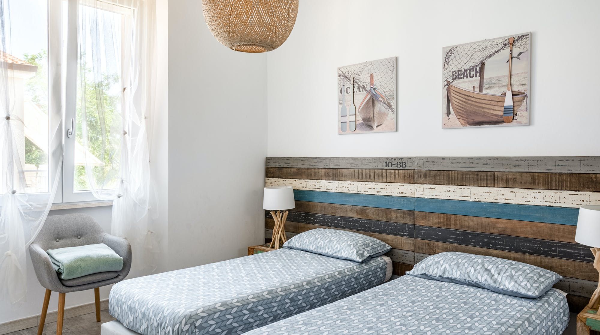 The private terrace is the best spot for a cold drink in the evening, with its lounger chair and wooden dining table in the shade. Step through the French doors into the open-plan living area where painted floorboards and driftwood sculptures are a reminder of your seaside locale. We love the nautical design touches and palette of sand and forest green. The sleek, dine-in kitchen has all you need to whip up breakfast, lunch and dinner and boxes brimming with toys lets you know this place is family-friendly. There’s also a vast garden, shared with one other home, with a kids’ playpark and barbecue area.