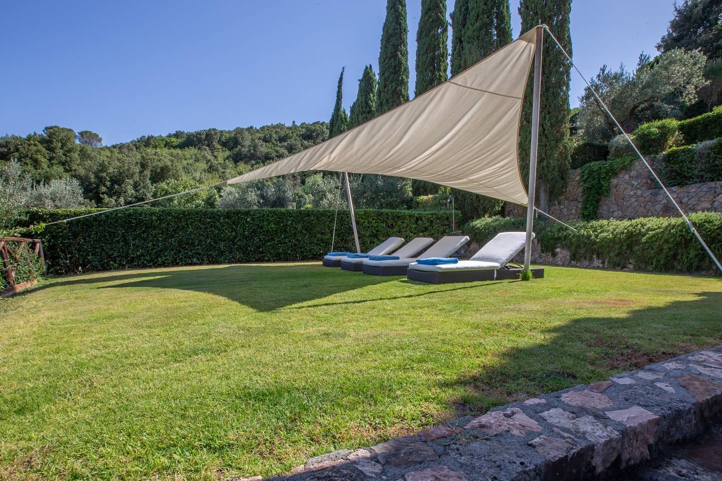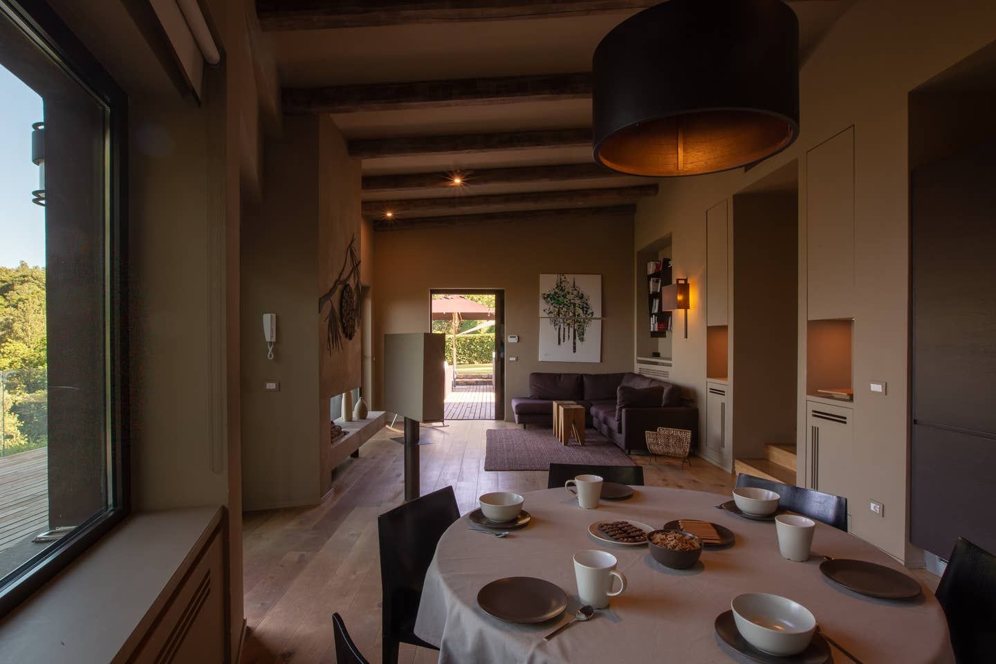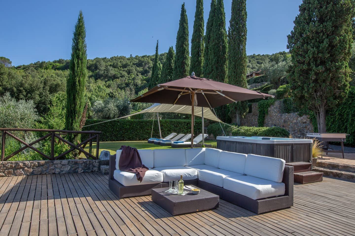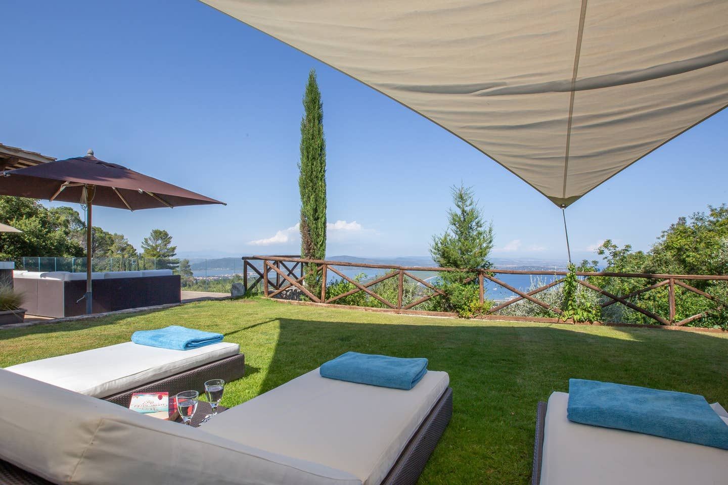 This beautiful villa is a dreamy holiday home in Italy. It’s on a hillside just ten minutes from Porto Ercole, within easy reach of the beaches of the Tuscan archipelago. Admire stunning views of the Bay of Orbetello and the valley from the terrace, where you can sunbathe and soak in the hot tub. A lush garden of plants and cypress trees adds to the tranquil vibe of this delightful villa. Inside, this modern and attractive home has large windows that bring the view inside.