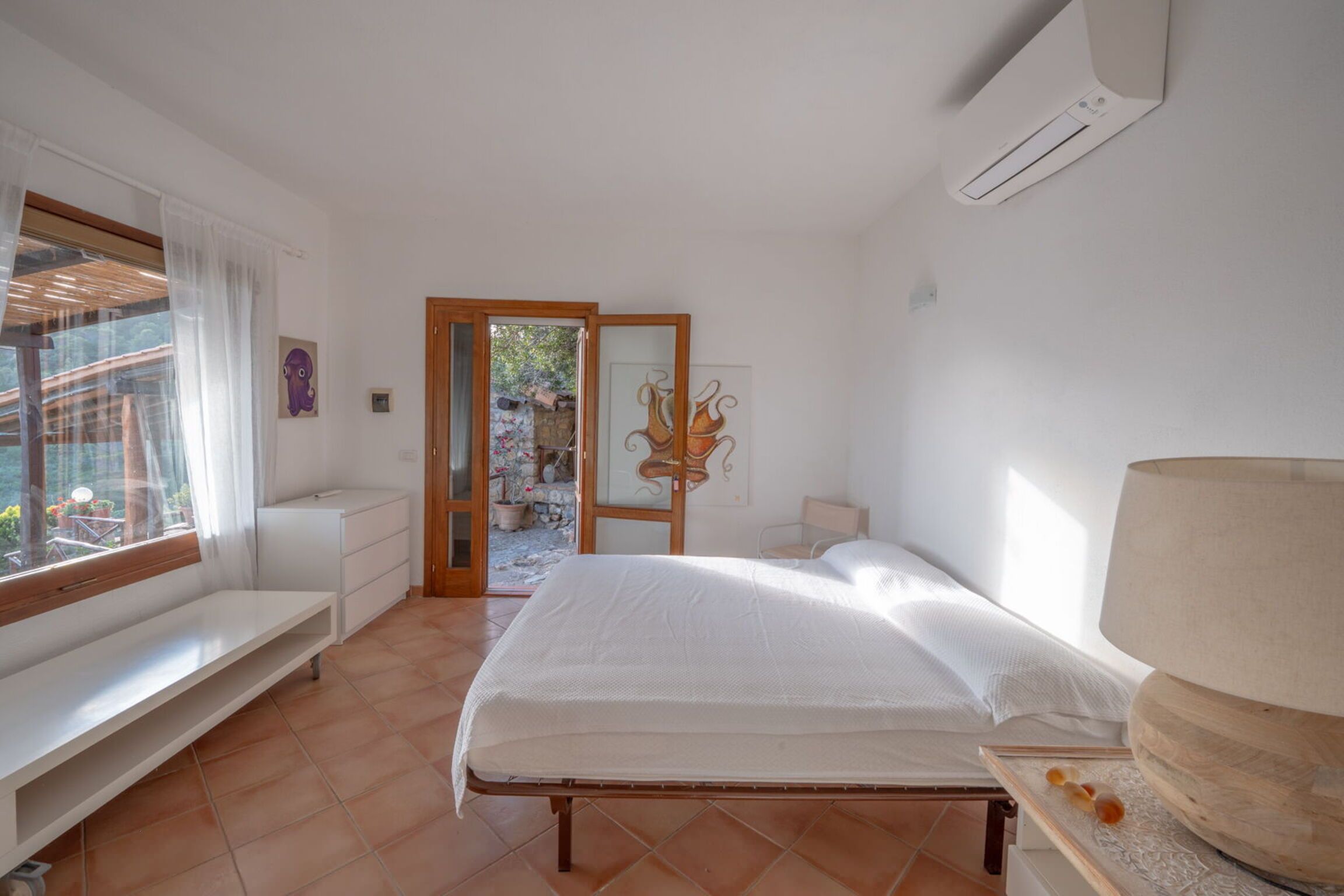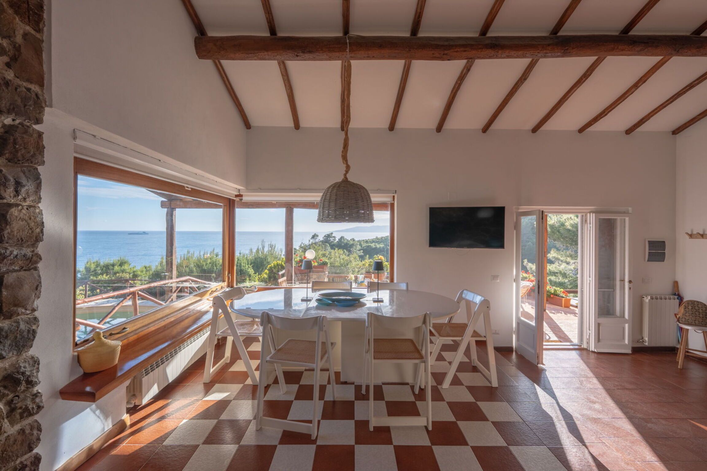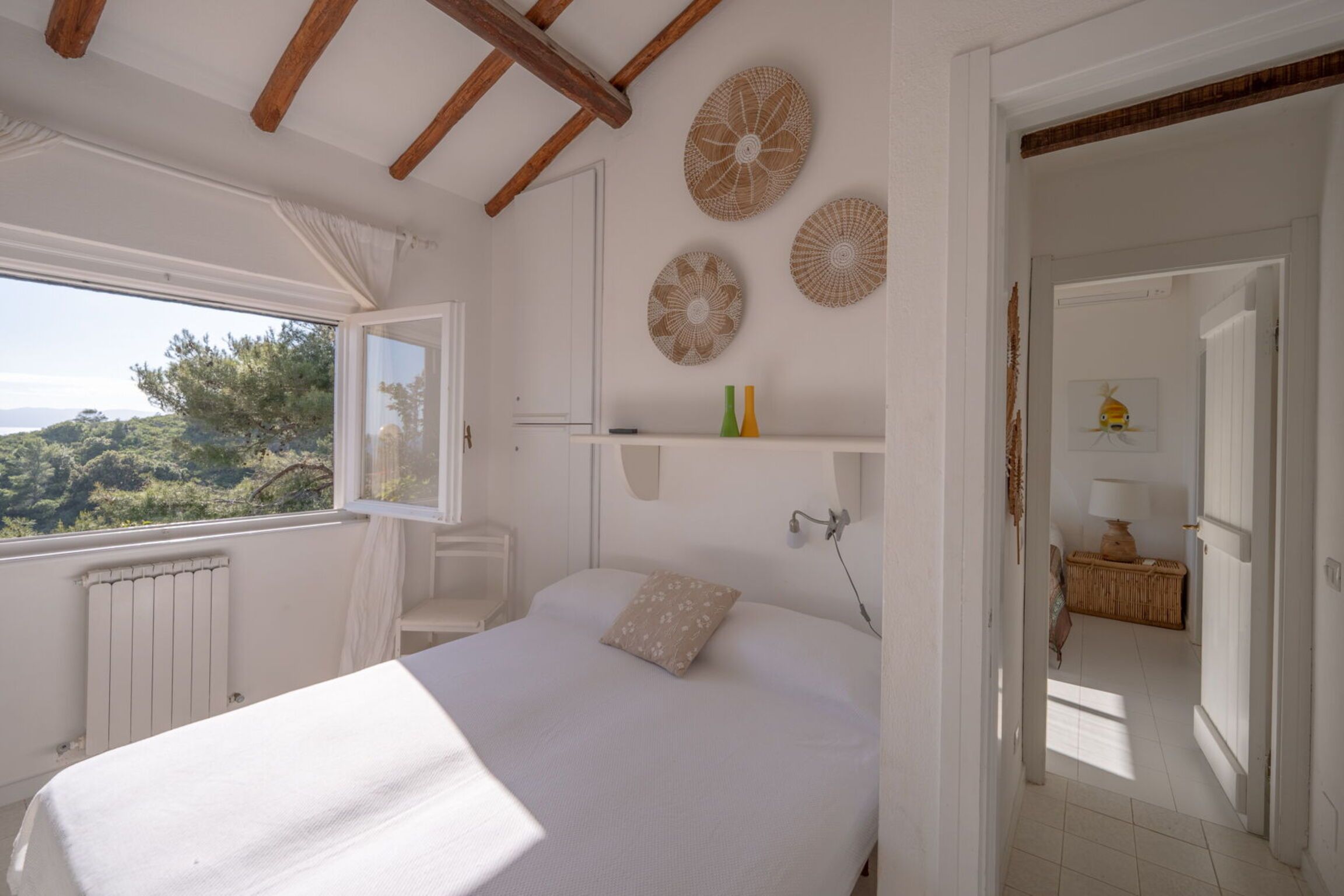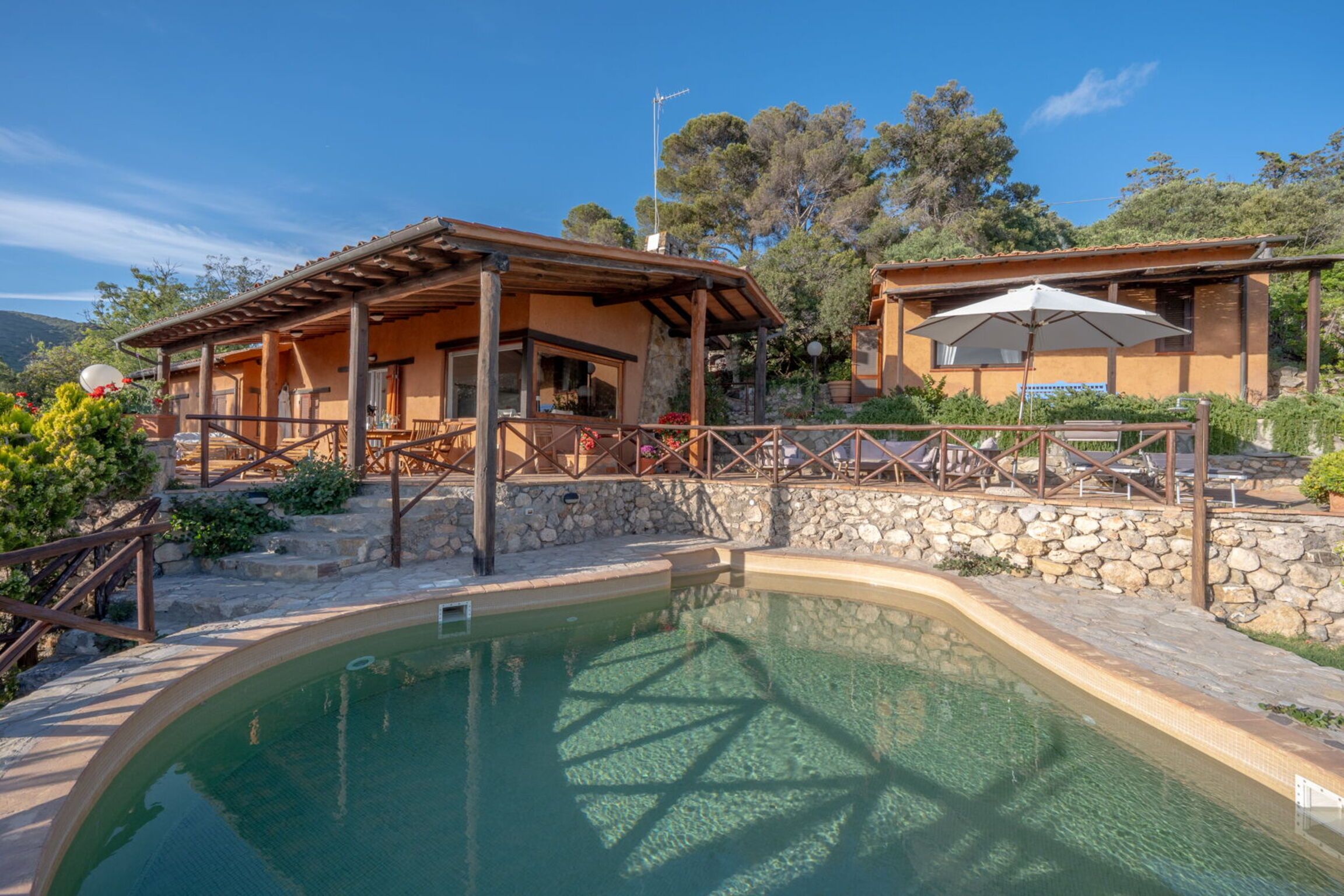Set within the private parkland of a multi-hectare estate, this home is perfect for a tranquil getaway. Porto Santo Stefano is a twenty-minute drive when you fancy a day out, or you can walk to Mar Morto Beach in less than ten minutes. However, you don’t need to leave the house to experience spectacular sea views – you can enjoy them from the terrace and pool. The grounds are a delight, featuring pergolas, a barbecue and dining area, and fruit trees. There are more vistas available indoors – we particularly love the outlook in the living area. The home is split between the main house and an annexe, so the layout is ideal for families and friends.