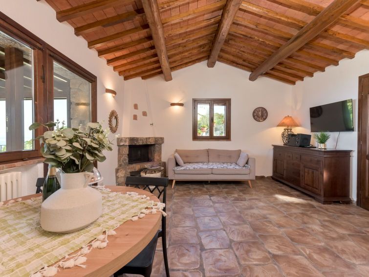 5-room house 100 m2 on 2 levels. Comfortable and cosy furnishings: living/dining room with open-hearth fireplace (only for decoration), dining table, TV and hi-fi system. Exit to the terrace. 1 room with 1 double bed (160 cm). 1 room with 1 double bed (160 cm), shower/WC. 1 room with 1 bed (80 cm), 1 double bed (160 cm), shower/bidet/WC.