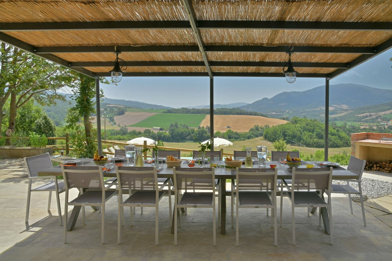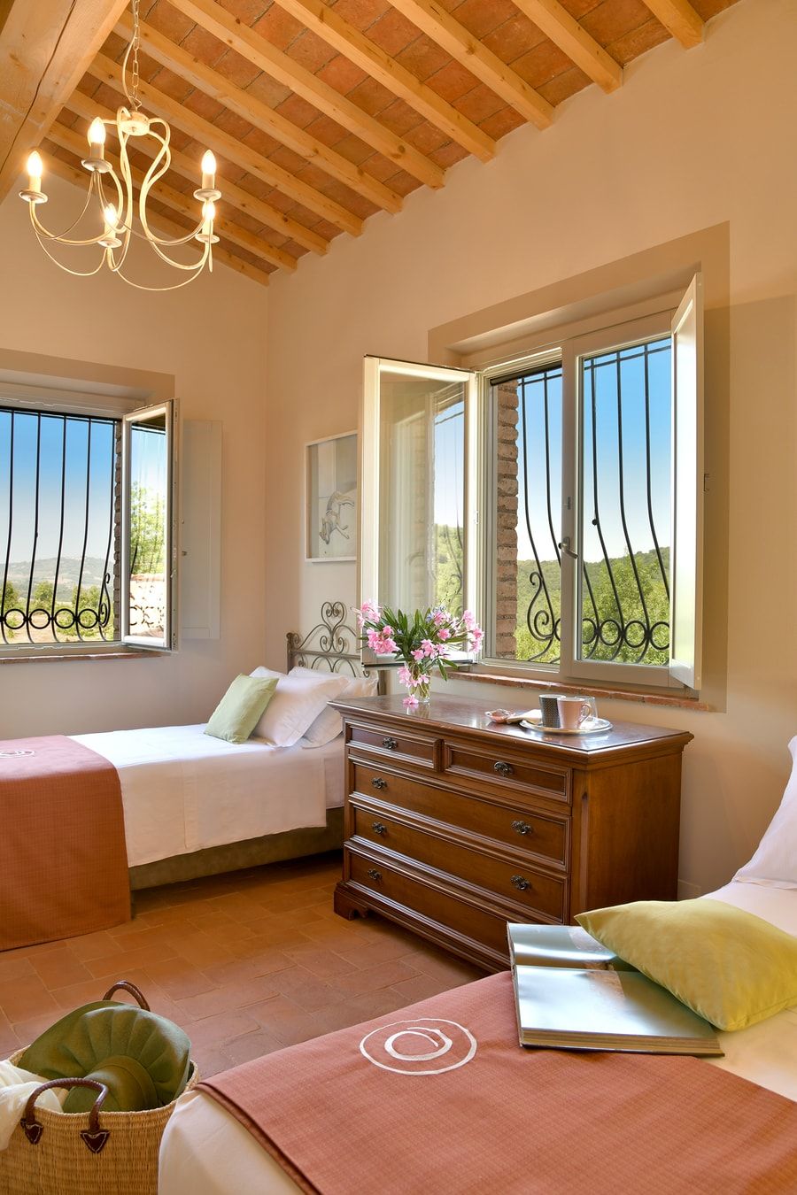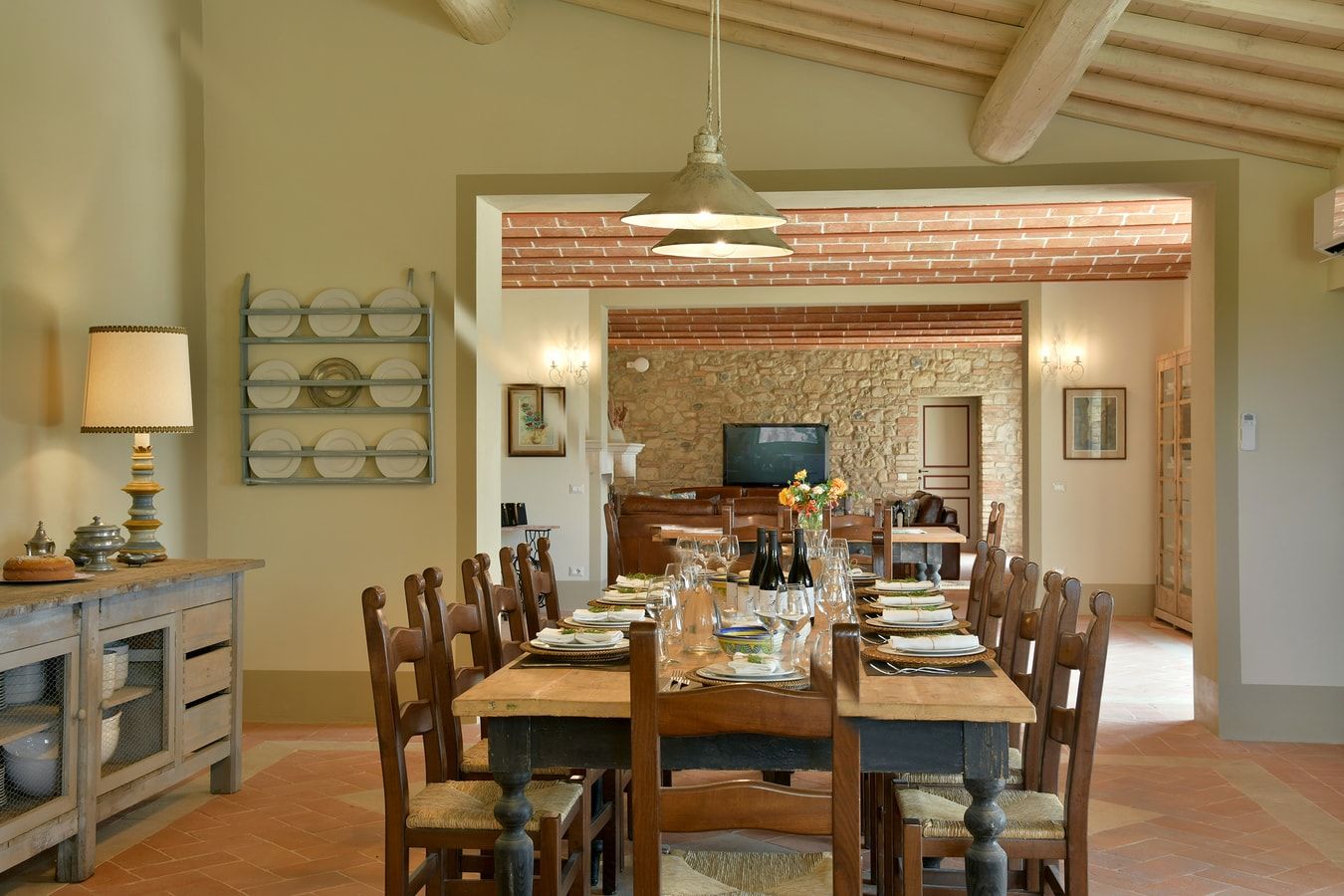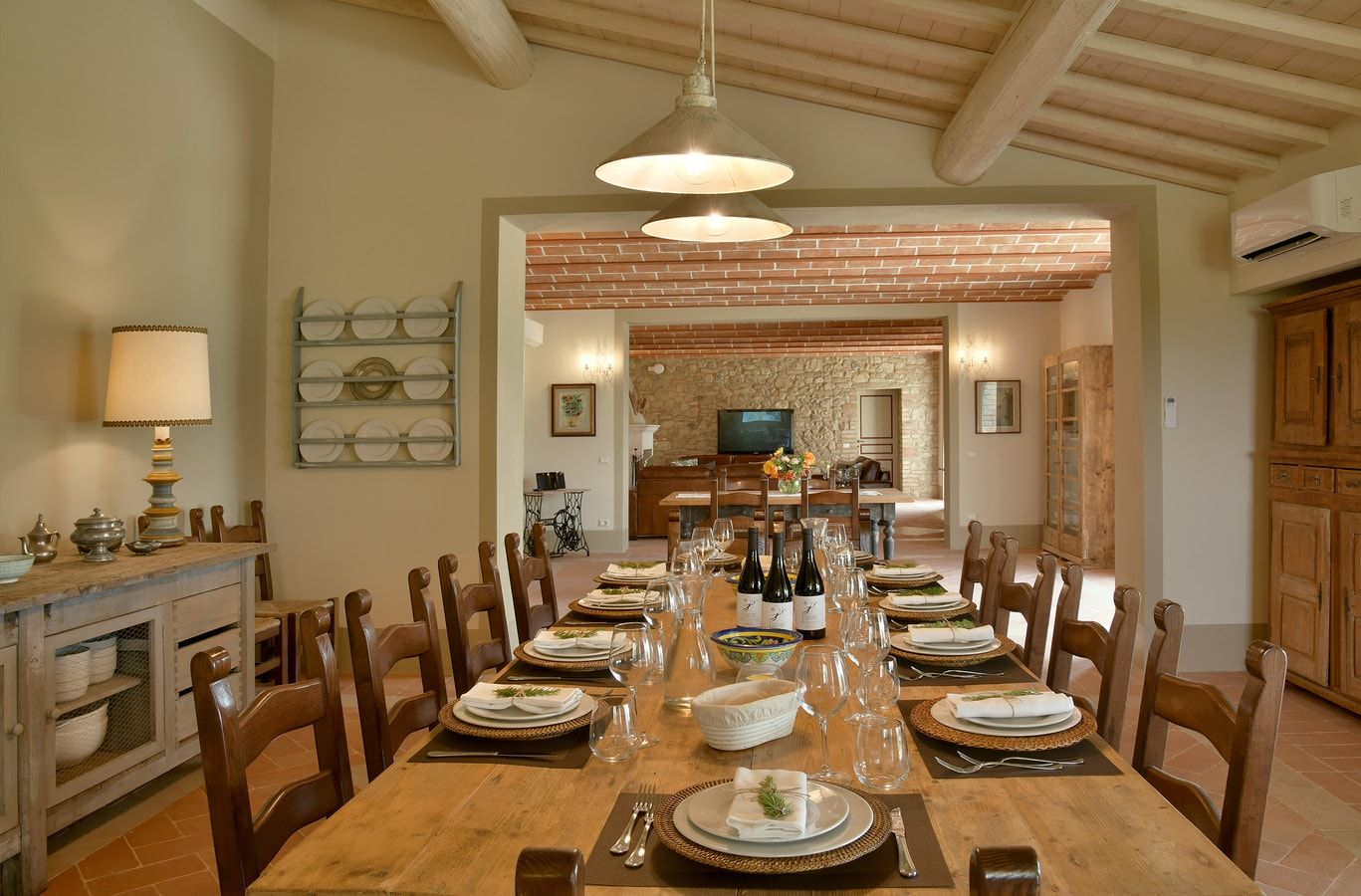 Perched on a hilltop within a 45-hectare estate of hazelnut groves, this rustic villa offers sweeping views across the Tuscan countryside. Situated over two floors, it's ideal for large groups or families, with six bedrooms and several flexible sleeping arrangements – including a large room on the ground floor with garden access and living space. Visit neighbouring medieval villages or the UNESCO World Heritage site before firing up the wood-burning pizza oven for some Italian alfresco dining. Feel like staying in? Start your day in the fitness centre or lounge by the infinity pool, then gather on the terrace for a balmy evening by the fire pit. You'll find everything you need here for a classic Tuscan getaway.