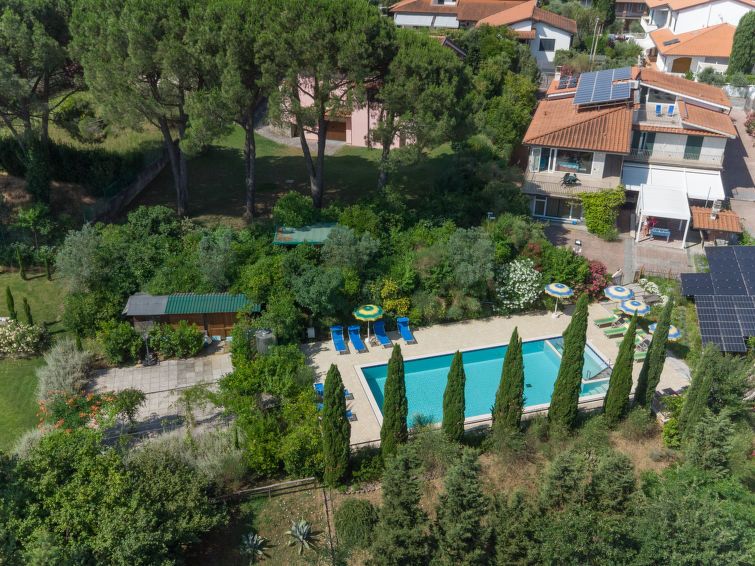 "La Rosa per 9 pax", 5-room semi-detached house 200 m2 on 2 levels, on the ground floor. Entrance hall. 2 double bedrooms, each room with shower/bidet/WC, digital TV and air conditioning. Kitchen (5 hot plates, oven, dishwasher, microwave, freezer) with dining table, digital TV and air conditioning.
