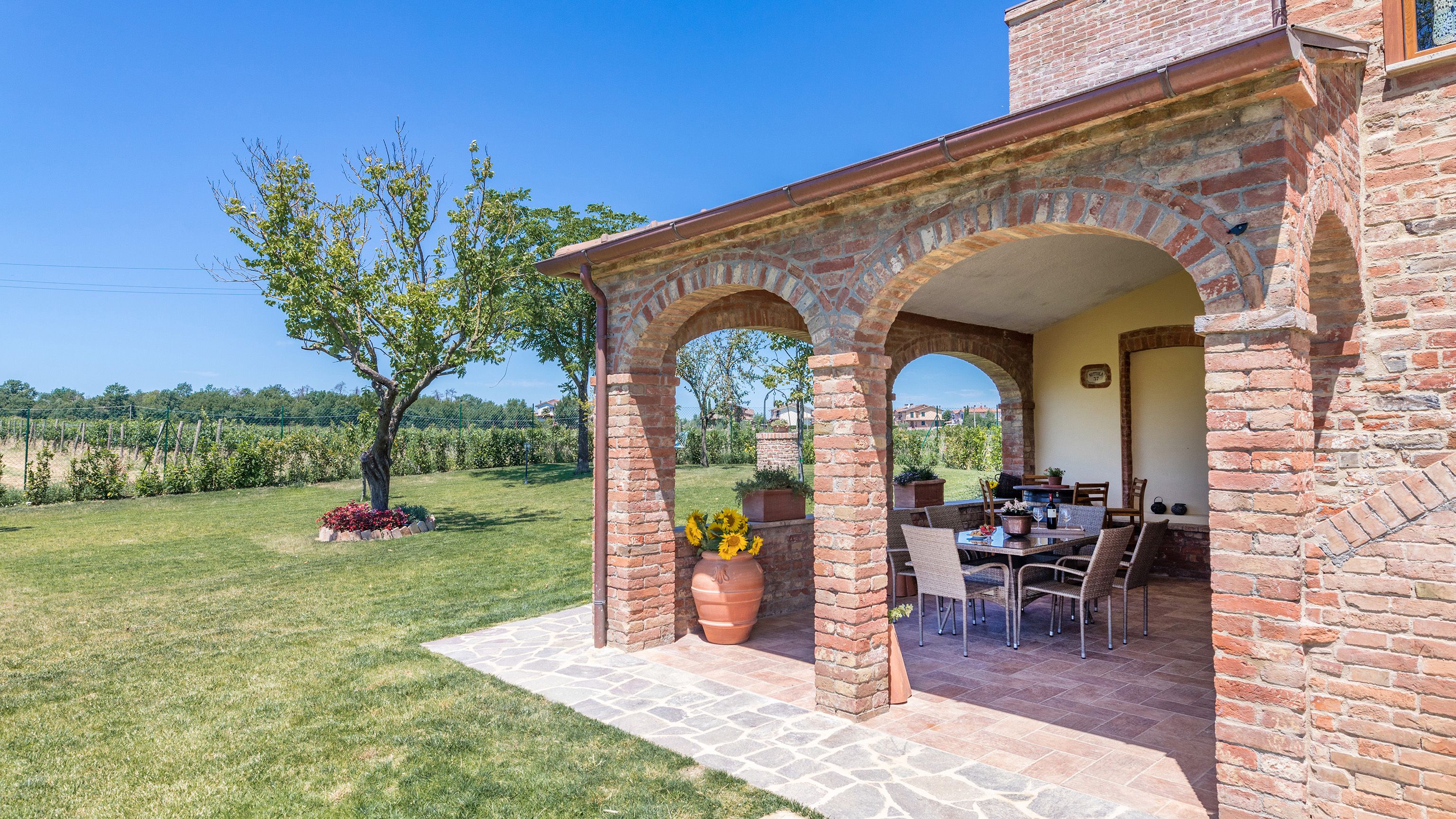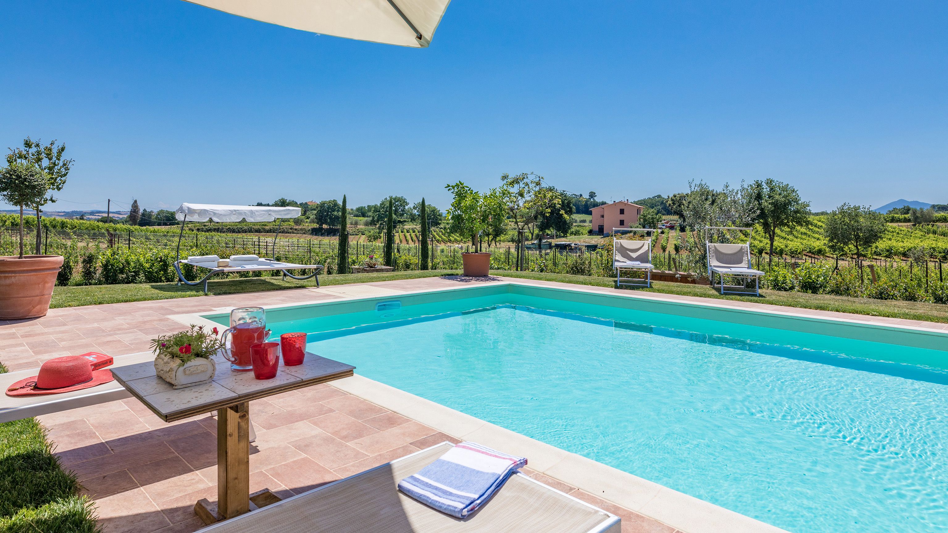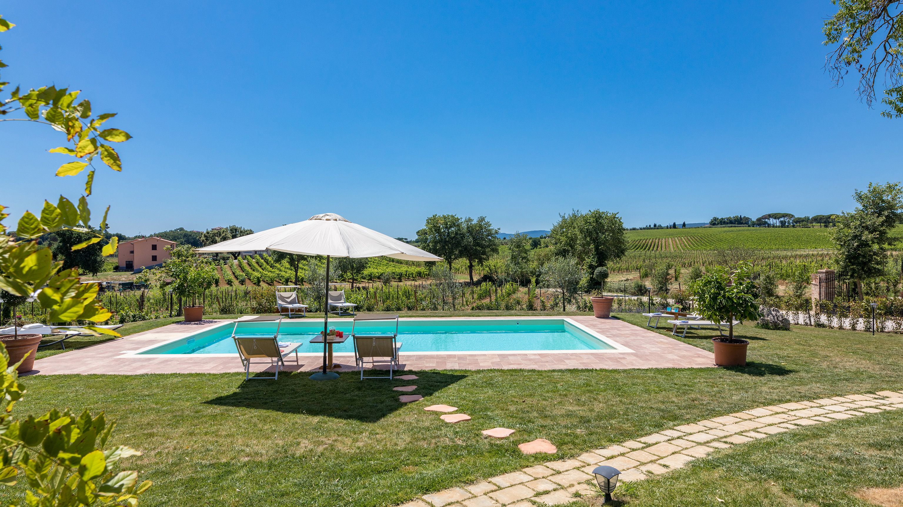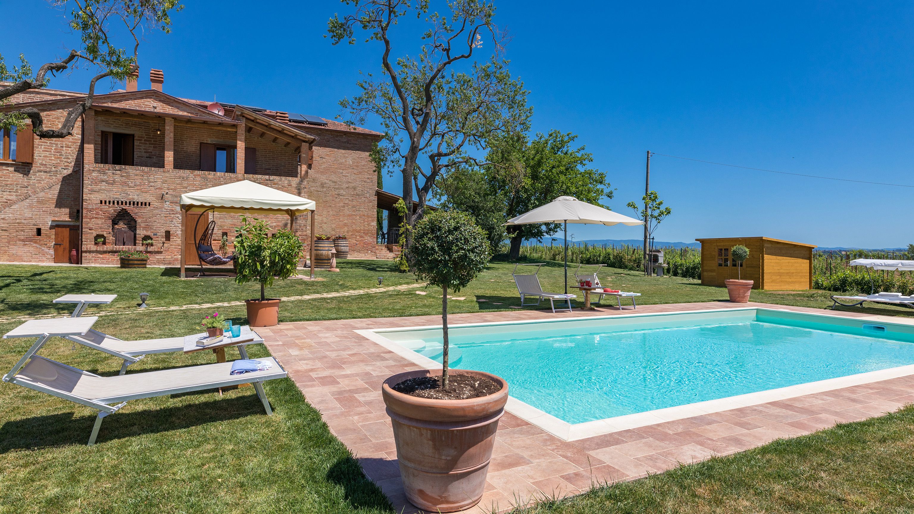 Standing proud in the Tuscan countryside, this terracotta-bricked villa is one to remember. What struck us most wasn’t the size of the villa, it wasn’t even the azure swimming pool, it was the 3000+ square feet of lush gardens that surrounds it.