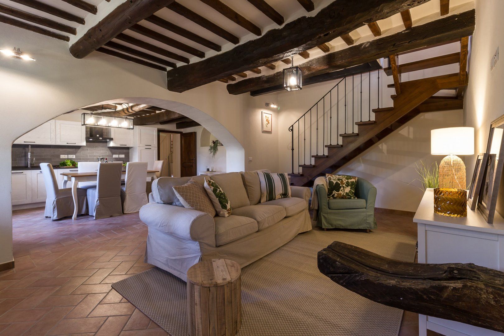 Inside, there are a pair of kitchens, dining rooms and living rooms, which offers an extra degree of flexibility if you're travelling in a big group. There are terracotta tiles and wooden ceiling beams throughout to remind you of the home's heritage, but contemporary kitchens and pristine bathrooms show you how much effort the host has gone to in order to bring the address up to date.