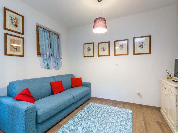 "Rio Del Sole", 2-room apartment 60 m2, on the ground floor. Comfortable and rustic furnishings: living/sleeping room with 1 double sofabed and satellite TV. Exit to the garden. 1 room with 1 x 2 bunk beds, 1 double bed. Open kitchen (oven, dishwasher, 4 induction hot plates, toaster, kettle, microwave, electric coffee machine).