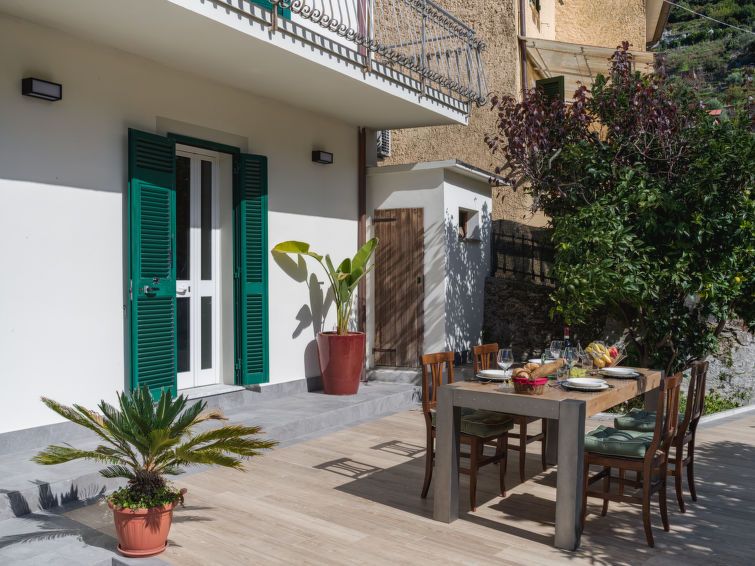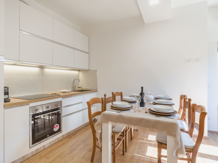 "Casa Gli Aranci", 5-room semi-detached house 84 m2 on 3 levels. Beautiful and cosy furnishings: dining room with dining table. Exit to the terrace. Upper floor: 1 room with 1 french bed (140 cm), shower/bidet/WC. Kitchen (oven, 1 induction hot plates, toaster, kettle, electric coffee machine) with dining table, TV and flat screen.