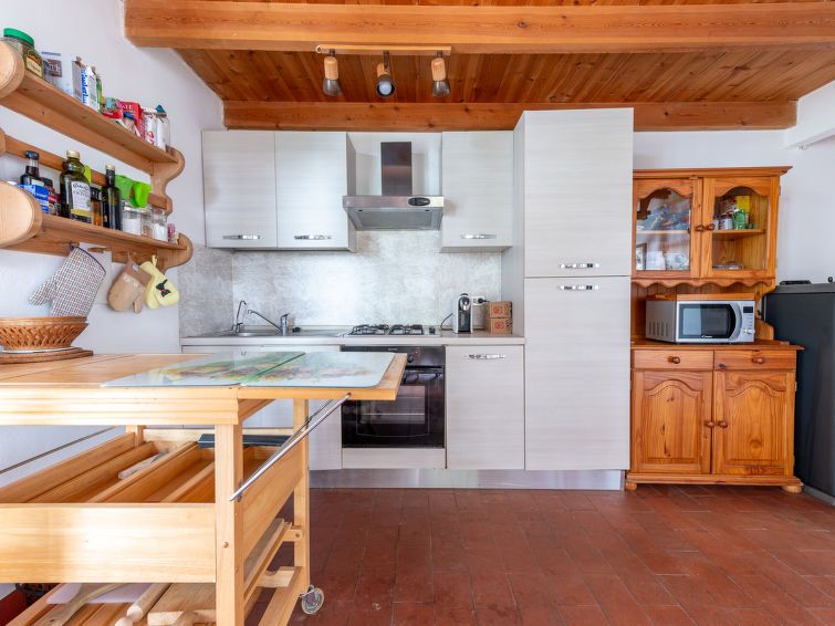 "Pescine 1", 2-room semi-detached house on 2 levels. Cosy furnishings: living/dining room with open-hearth fireplace, dining table, TV, wood-burning stove and air conditioning. Exit to the terrace. 1 room with 1 bed and 1 double bed (160 cm). Open kitchen (oven, 4 gas rings, microwave).