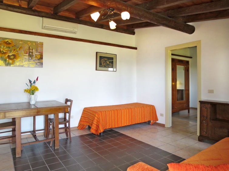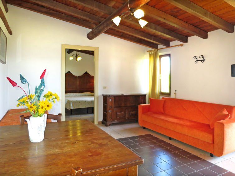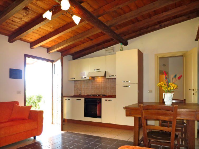 "Ginestre 11", 2-room terraced house 41 m2, on the ground floor. Simple and rustic furnishings: living/sleeping room with 1 bed (80 cm), 1 sofabed and dining table. Exit to the terrace. 1 double bedroom. Kitchenette (oven, 4 gas rings, kettle, freezer). Shower/WC. Air-conditioning, forced-air heating (extra).
