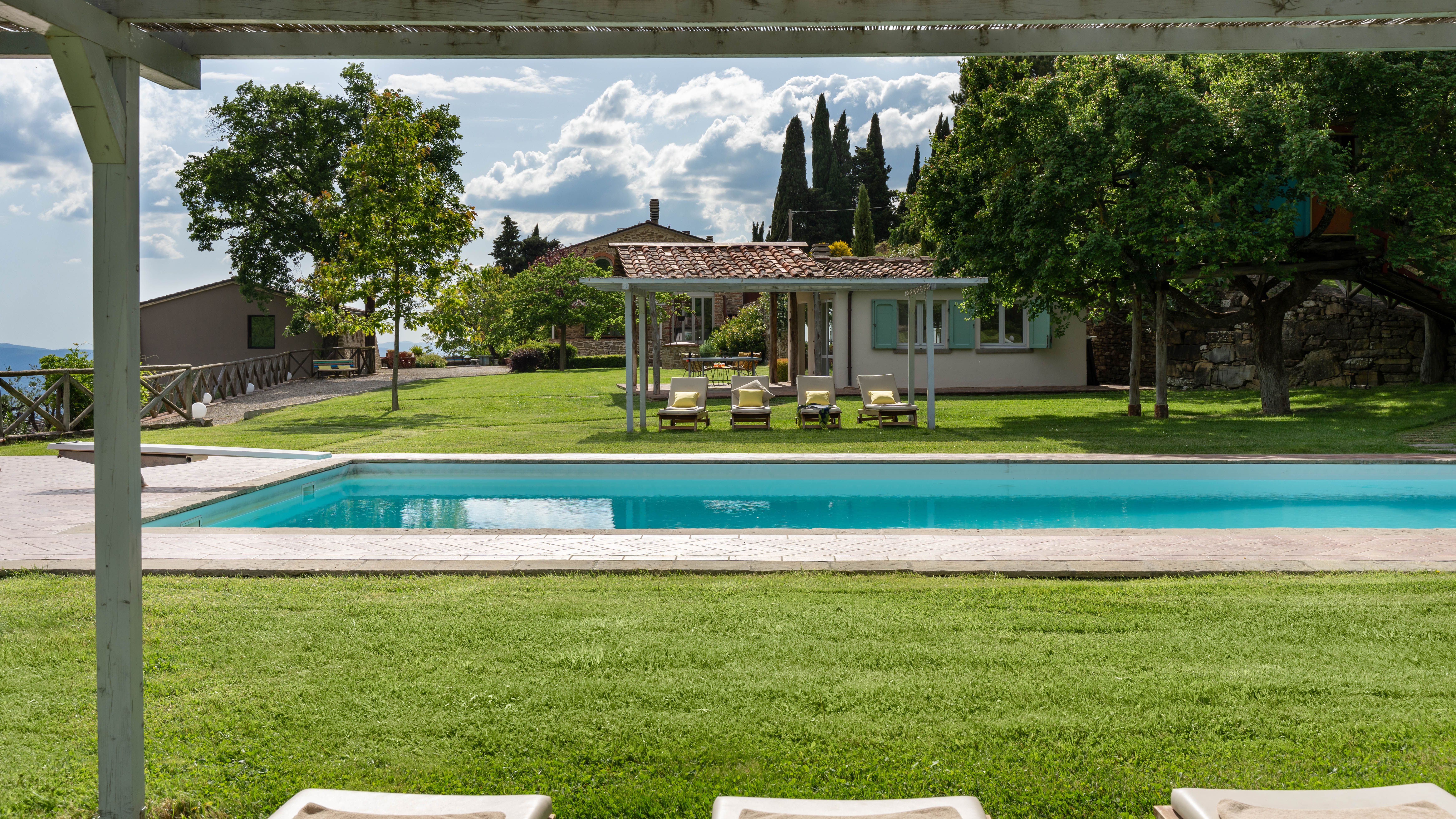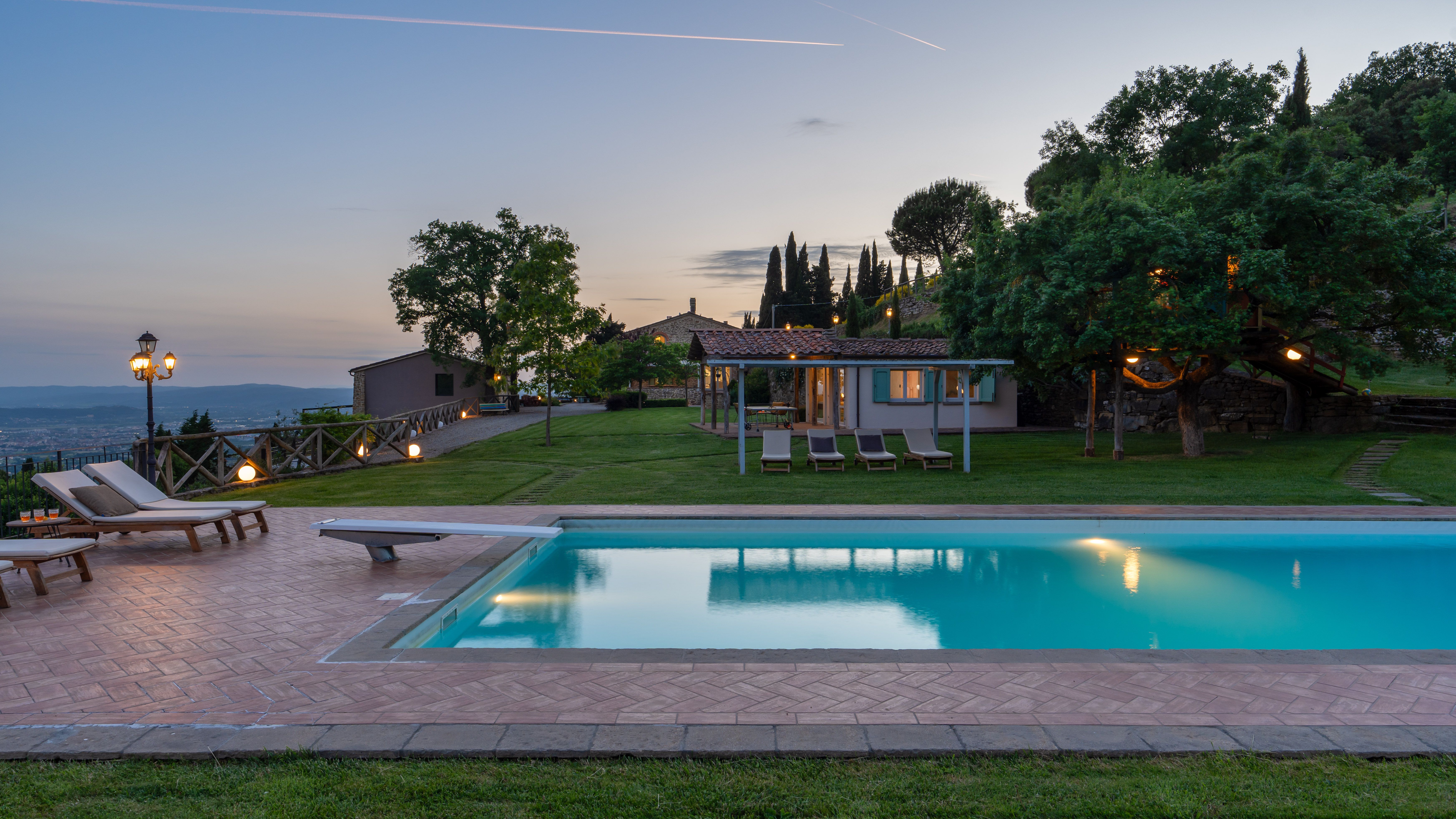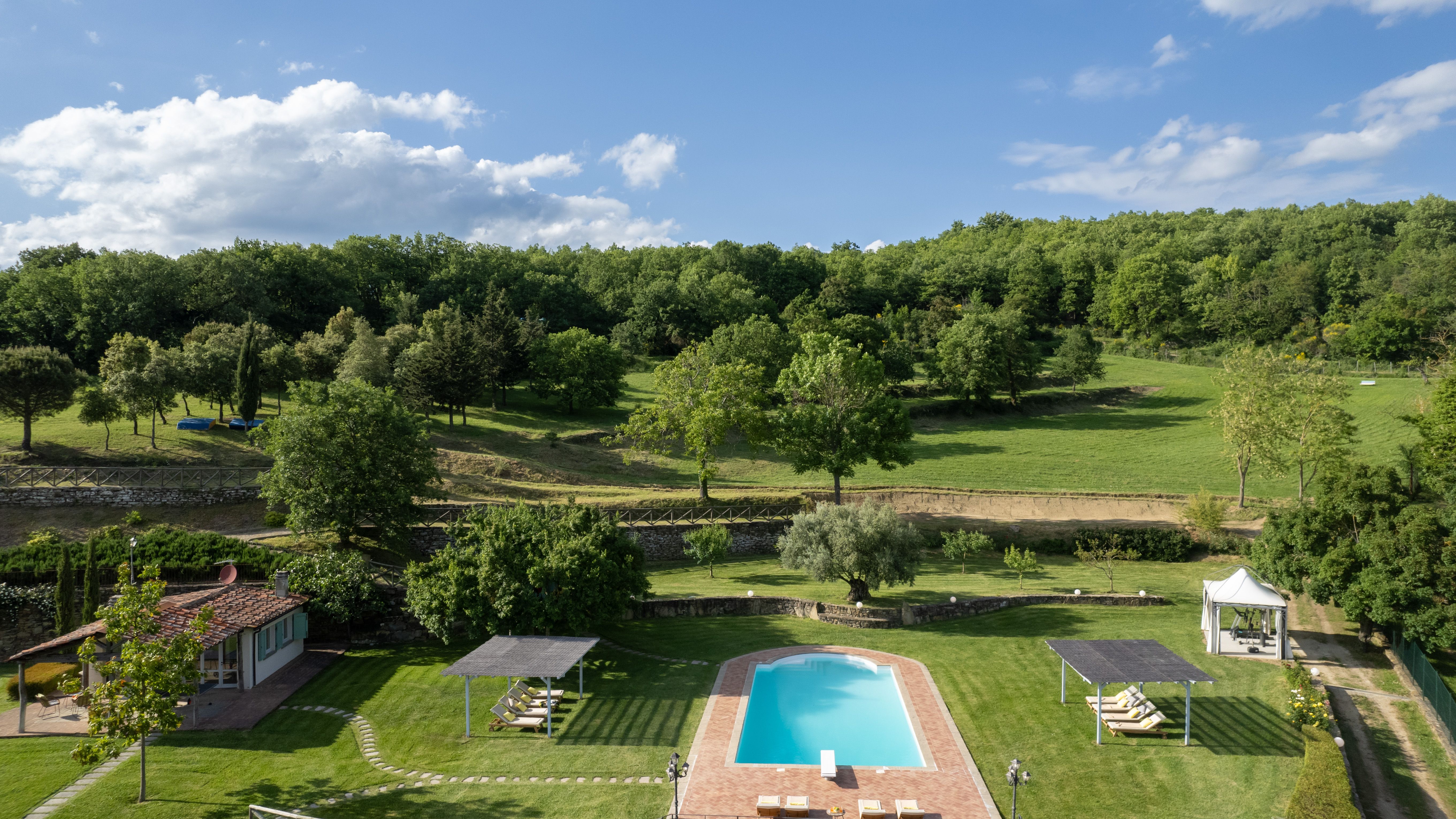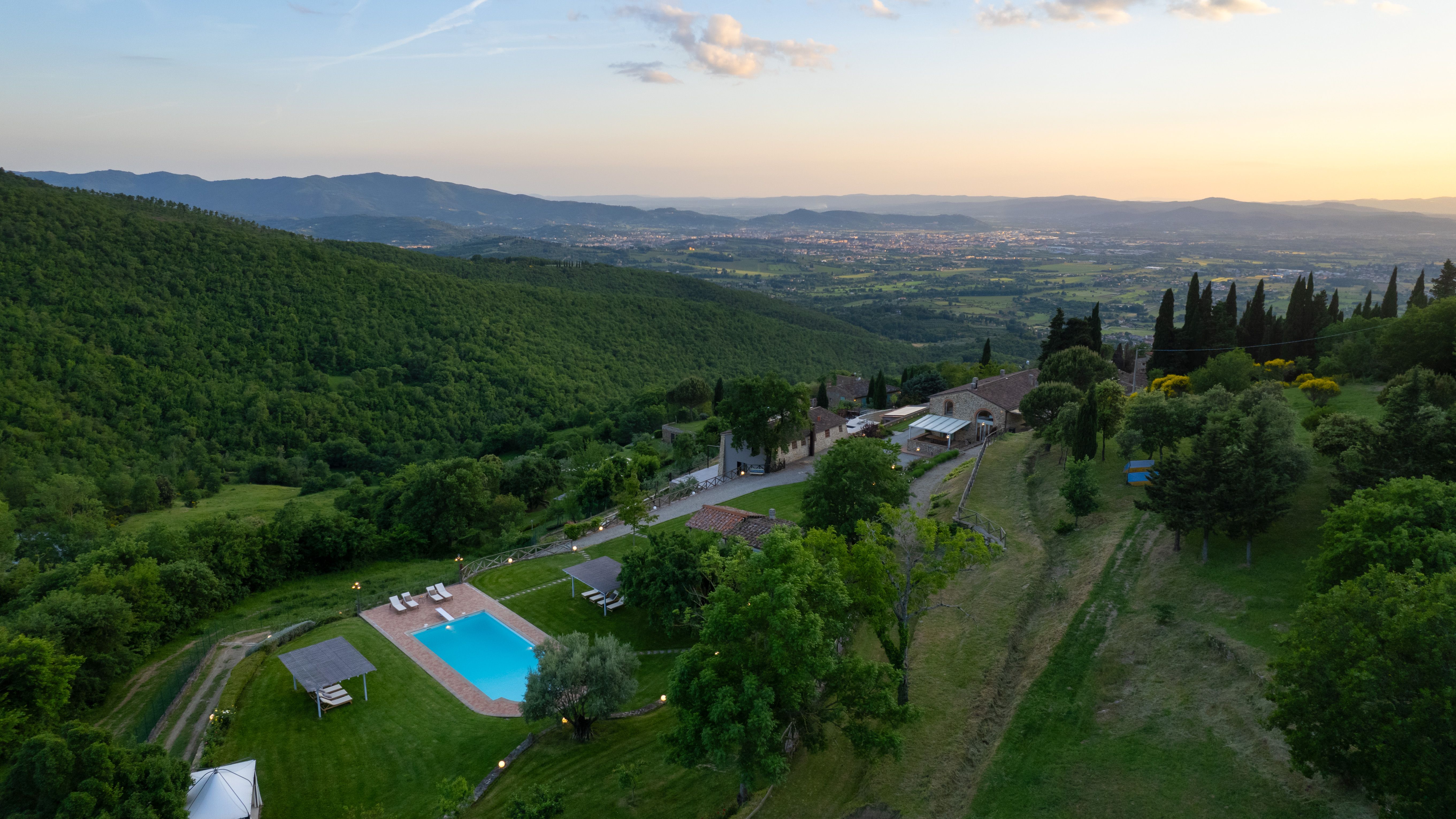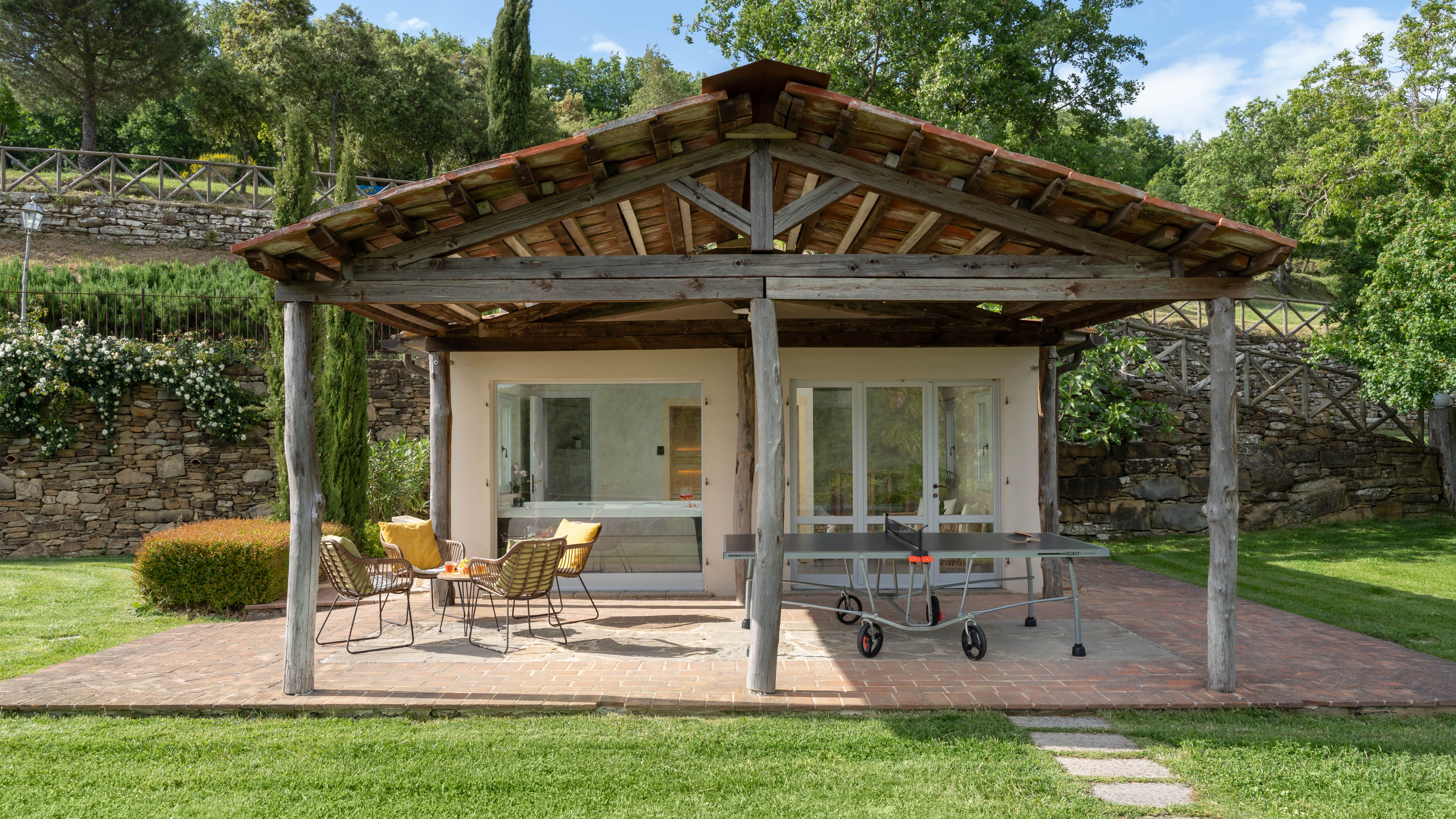 You’ll find this arresting home in the hills above Arezzo, boasting views of the Tuscan valley beneath it, as well as beautiful gardens. Set over several buildings, this large home includes a main farmhouse, two apartments, and an annexe. It’s ideal for large families or groups who want to spend a holiday together but still like a little privacy. The home has been designed to showcase the historic virtues of these ancient buildings – we were first taken by the classic stone walls and their attractive sage green shutters. Inside is a symphony of elegance. Neutral tones and natural textiles offset the original stone walls perfectly, while distressed wooden beams give the home a much softer, cosier atmosphere than you might first expect from its size. The main kitchen looks as though it was designed with professional chefs in mind, while in the two separate apartments, you’ll find smaller kitchens that pay homage to their humble farmhouse beginnings while still looking effortlessly chic – think Aga-style ovens, glass fronted cabinets, and vintage dining tables. The bedrooms ooze relaxation, with modern furniture, gauzy textiles, and clever lighting making for a boutique hotel experience. And that’s before we even get to this home’s outdoor areas. Covering several hectares, the gardens back onto a wood where guests can roam and play, while back in the garden you’ll not only find a children’s playground, ping pong table, and hot tub, but a Roman-style pool surrounded by sun loungers, a glorious view of the countryside below, and even a diving board.