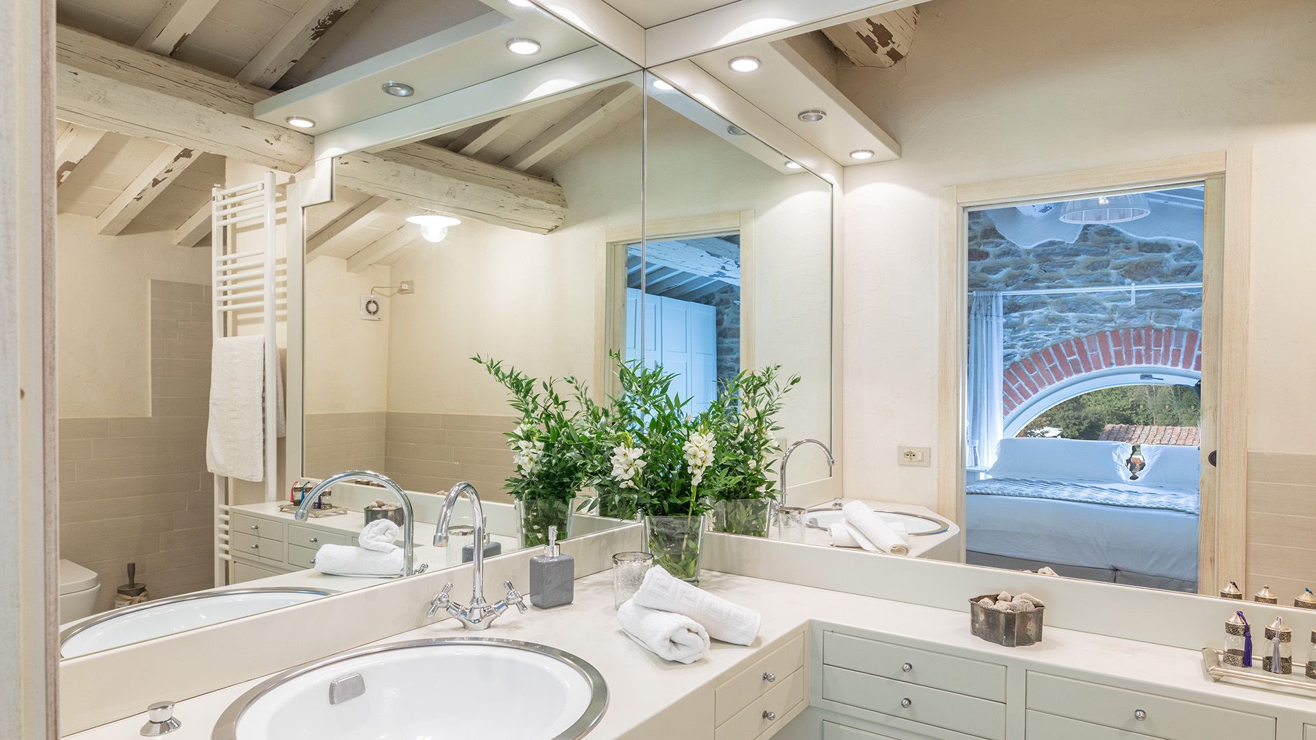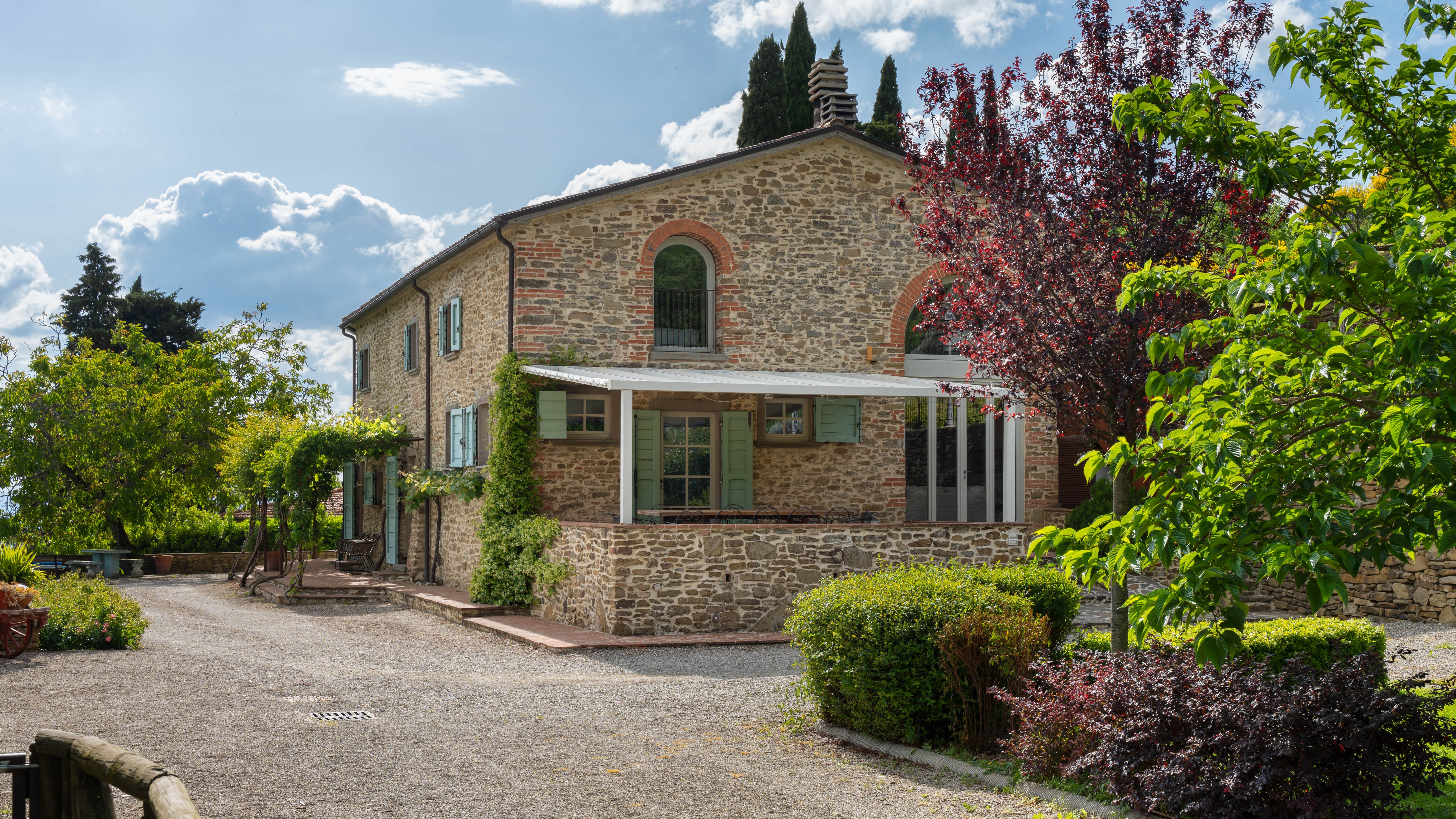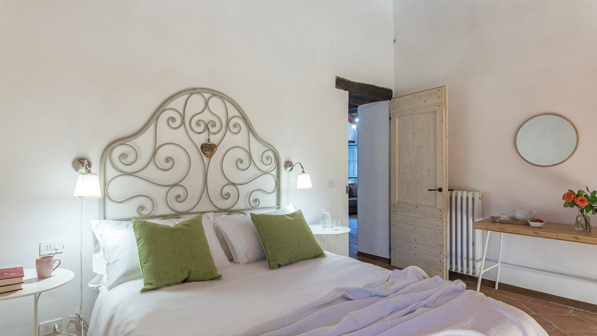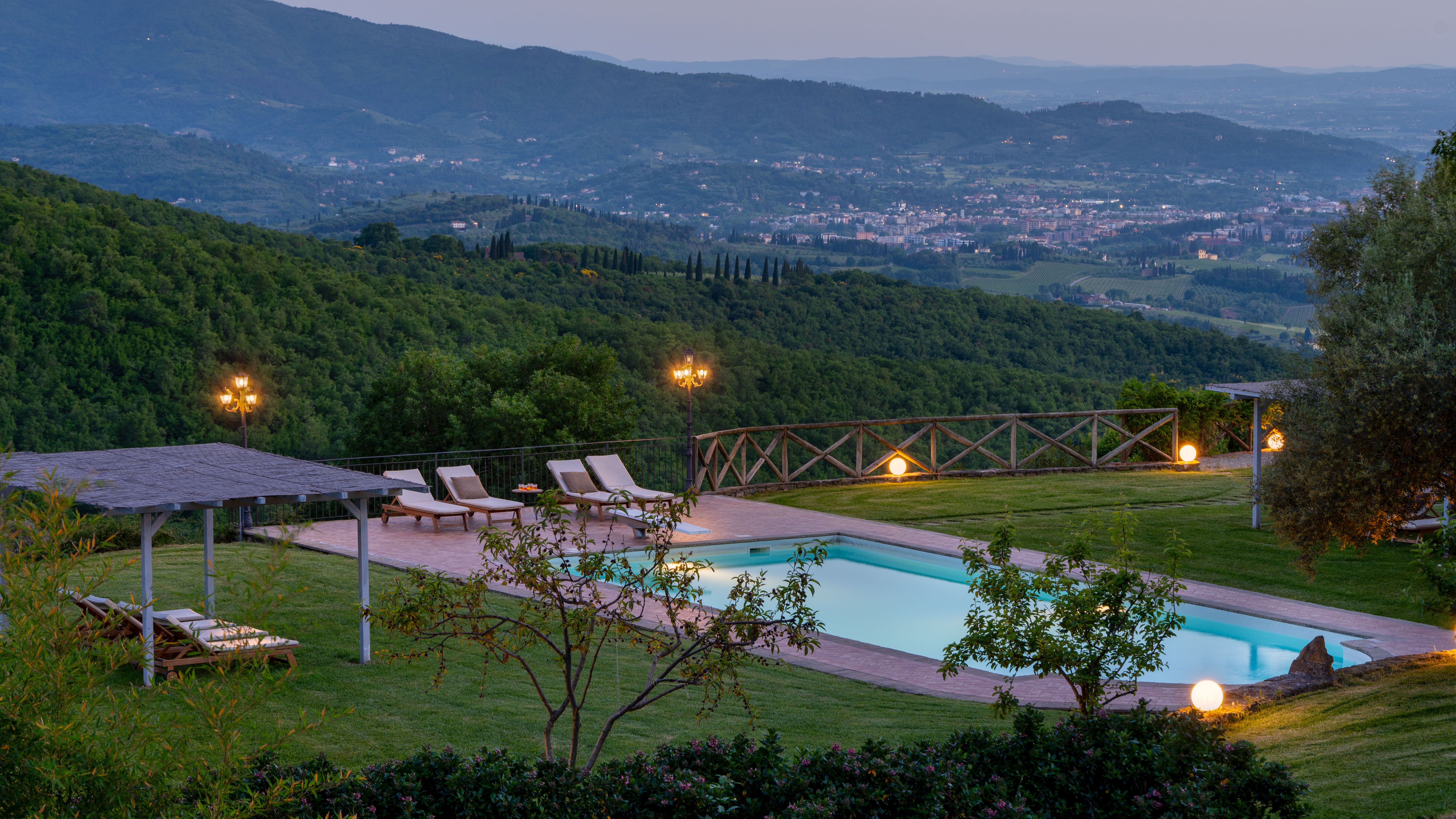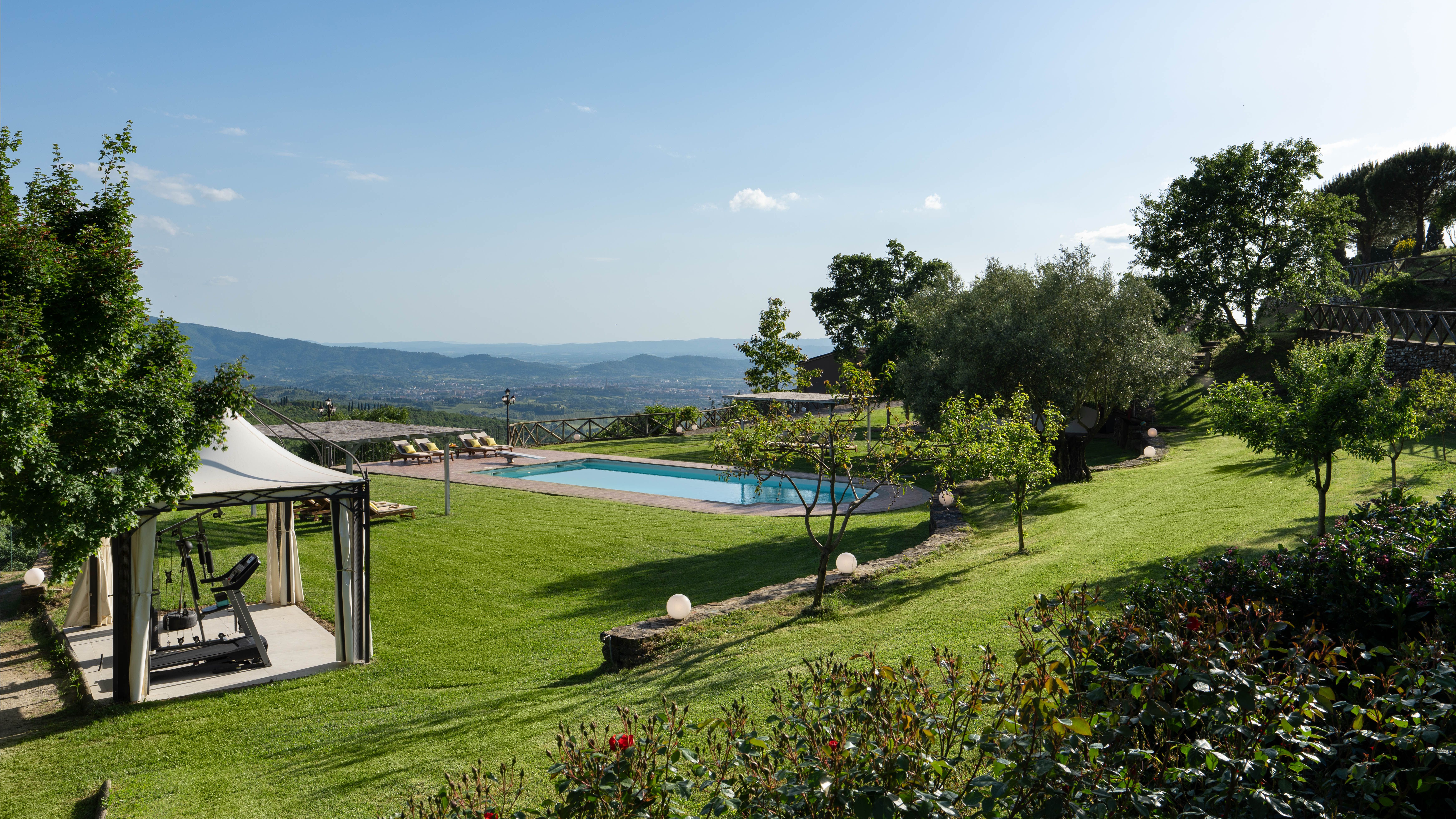 You’ll find this arresting home in the hills above Arezzo, boasting views of the Tuscan valley beneath it, as well as beautiful gardens. Set over several buildings, this large home includes a main farmhouse, two apartments, and an annexe. It’s ideal for large families or groups who want to spend a holiday together but still like a little privacy. The home has been designed to showcase the historic virtues of these ancient buildings – we were first taken by the classic stone walls and their attractive sage green shutters. Inside is a symphony of elegance. Neutral tones and natural textiles offset the original stone walls perfectly, while distressed wooden beams give the home a much softer, cosier atmosphere than you might first expect from its size. The main kitchen looks as though it was designed with professional chefs in mind, while in the two separate apartments, you’ll find smaller kitchens that pay homage to their humble farmhouse beginnings while still looking effortlessly chic – think Aga-style ovens, glass fronted cabinets, and vintage dining tables. The bedrooms ooze relaxation, with modern furniture, gauzy textiles, and clever lighting making for a boutique hotel experience. And that’s before we even get to this home’s outdoor areas. Covering several hectares, the gardens back onto a wood where guests can roam and play, while back in the garden you’ll not only find a children’s playground, ping pong table, and hot tub, but a Roman-style pool surrounded by sun loungers, a glorious view of the countryside below, and even a diving board.