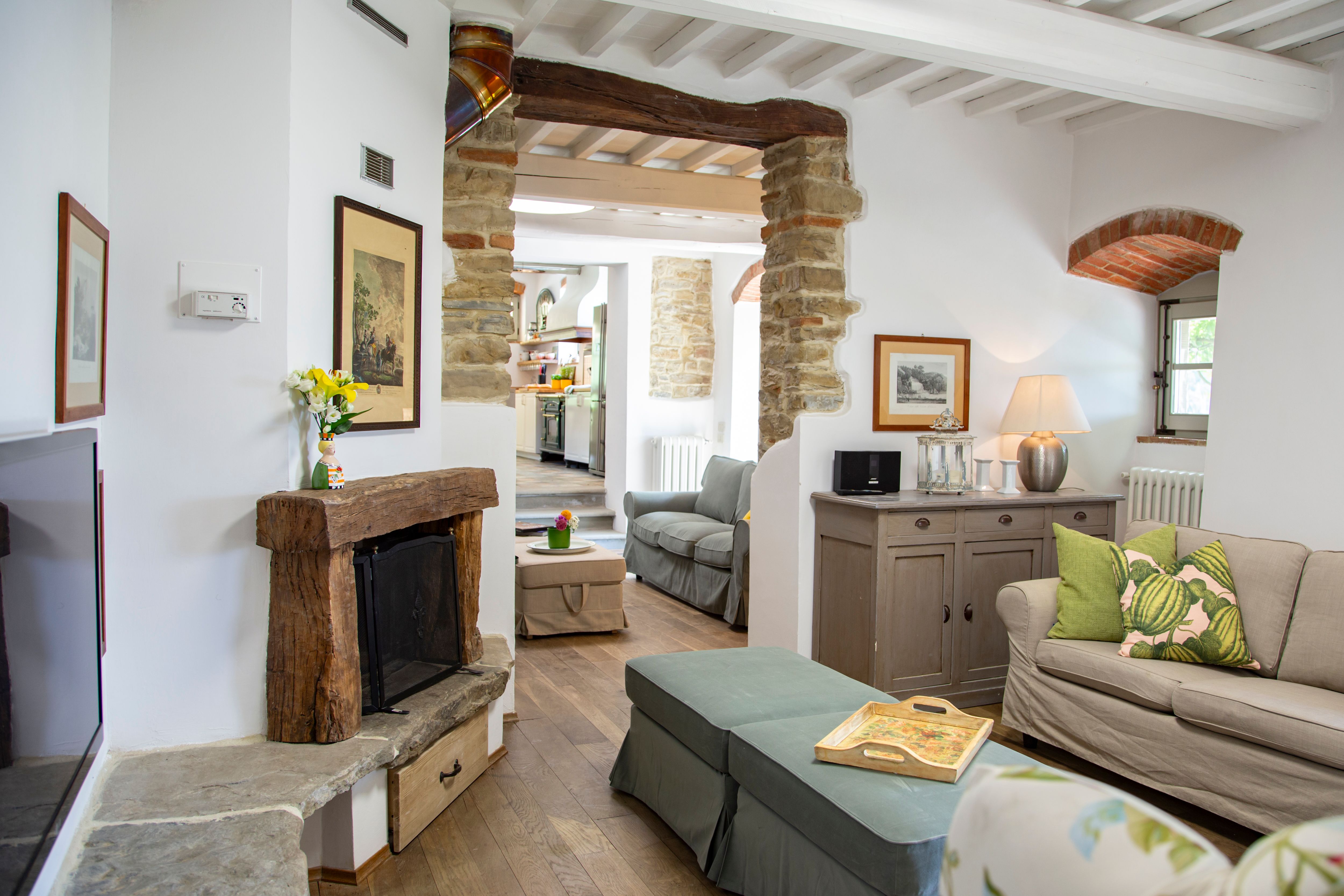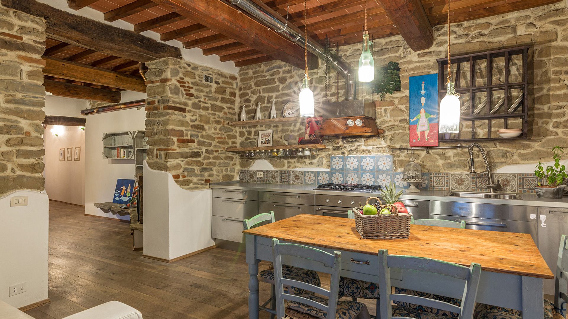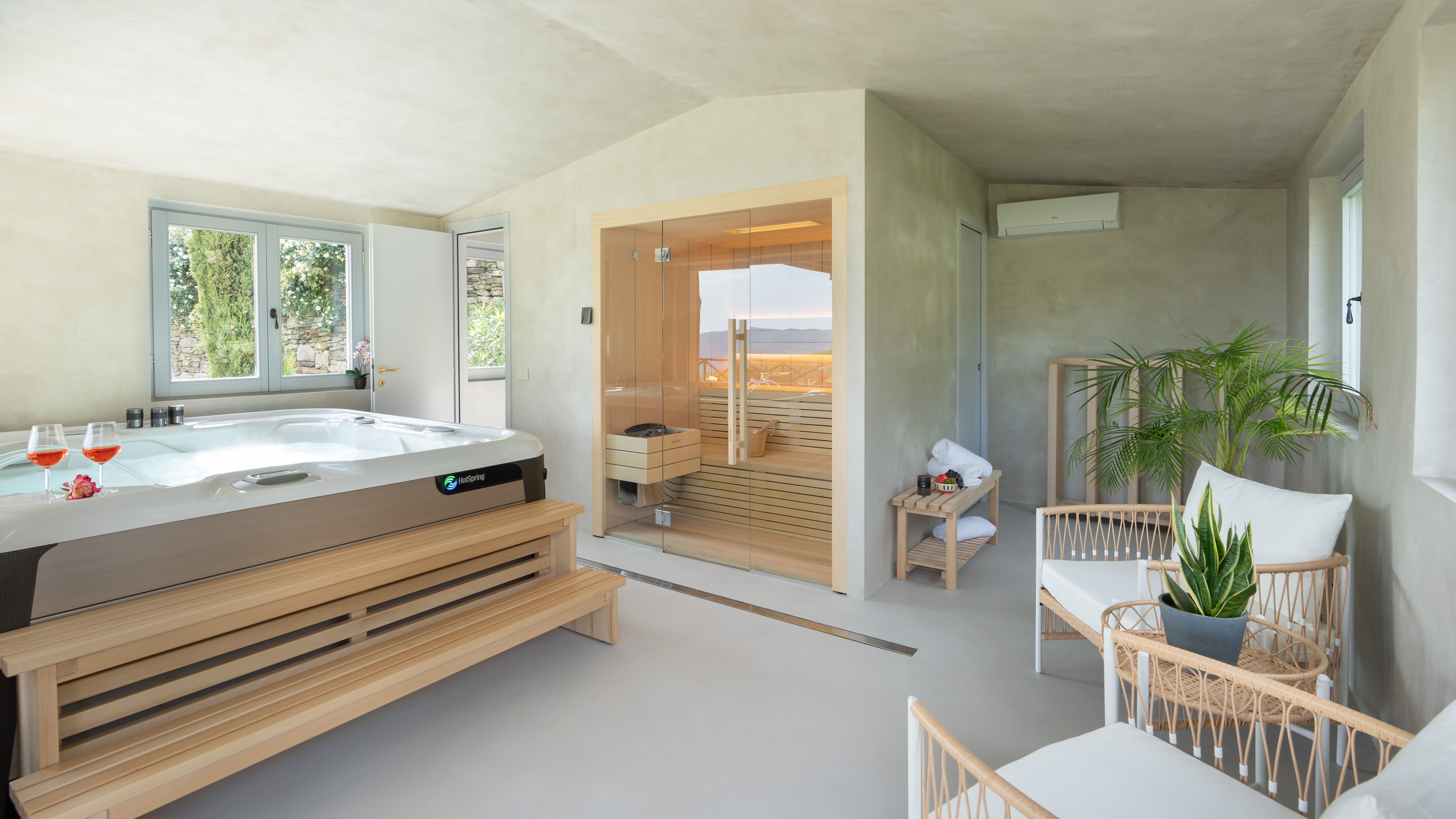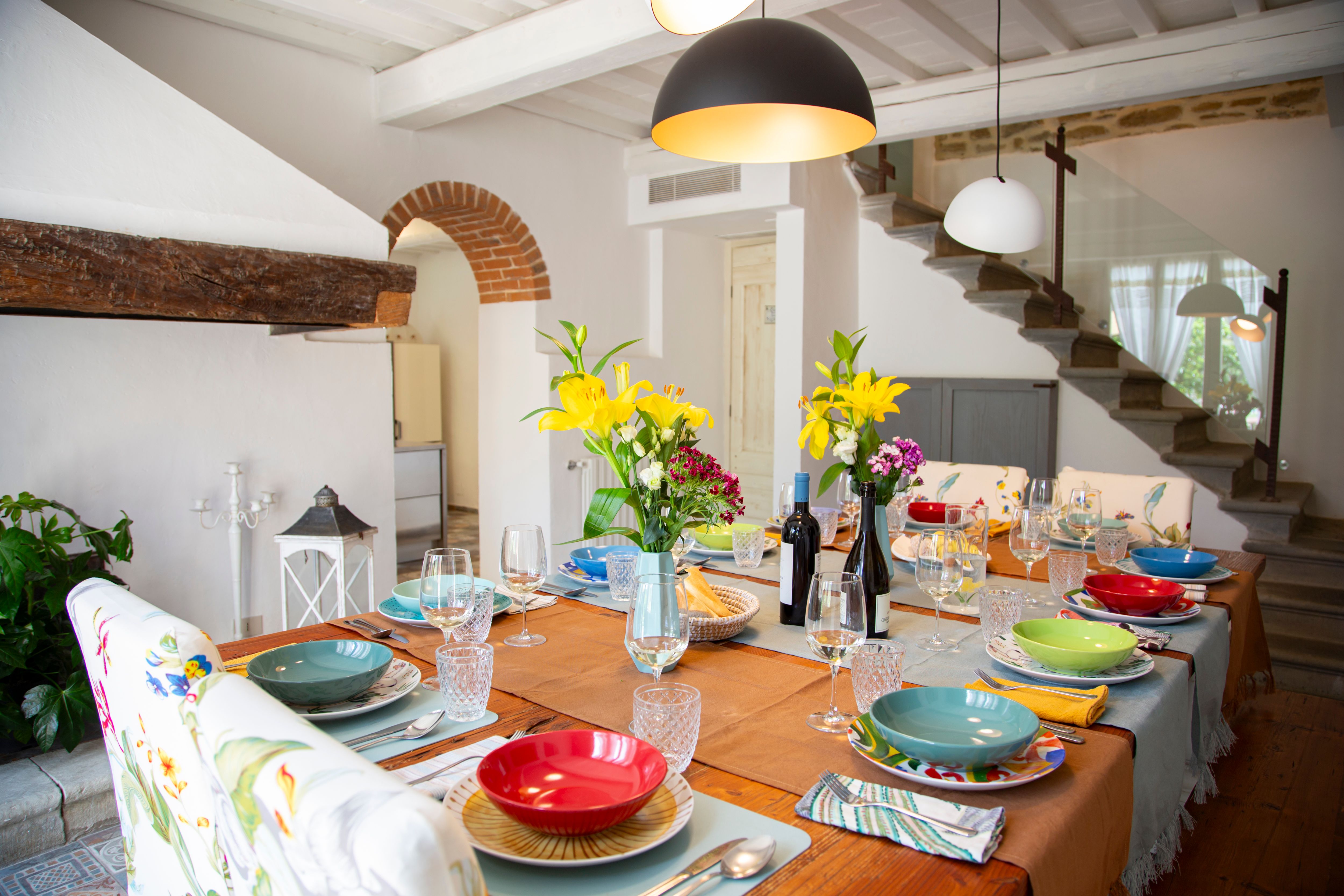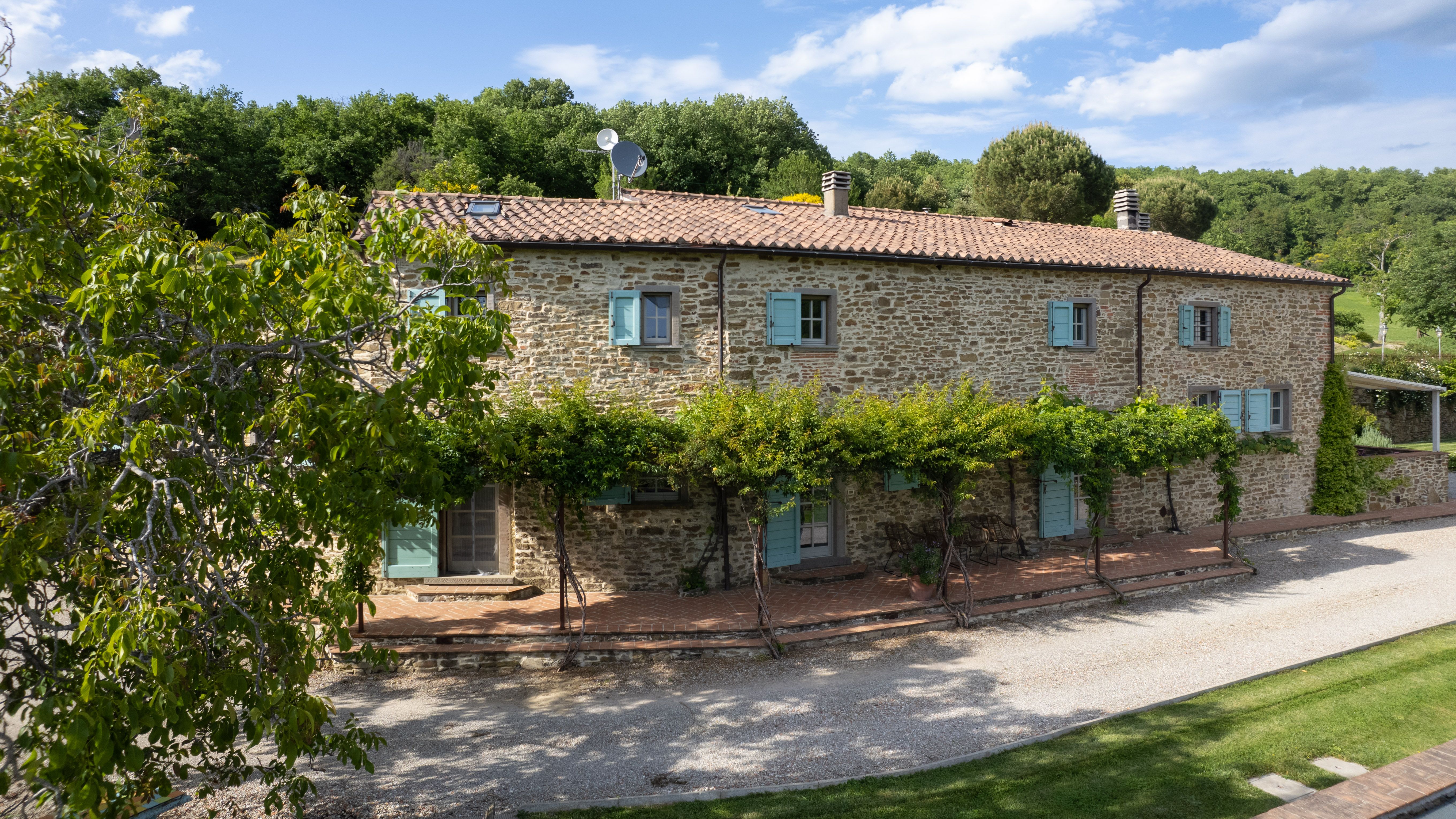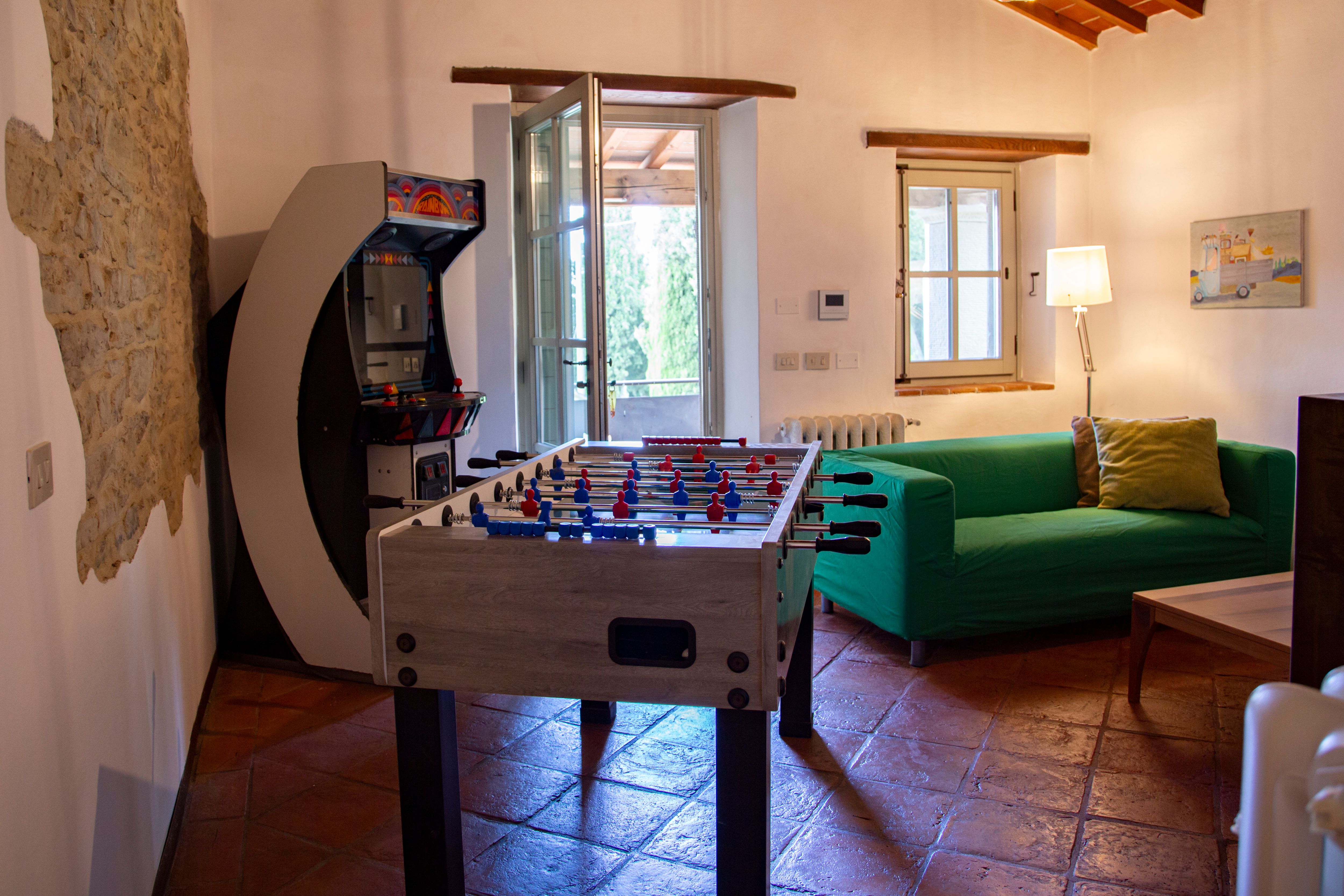 You’ll find this arresting home in the hills above Arezzo, boasting views of the Tuscan valley beneath it, as well as beautiful gardens. Set over several buildings, this large home includes a main farmhouse, two apartments, and an annexe. It’s ideal for large families or groups who want to spend a holiday together but still like a little privacy. The home has been designed to showcase the historic virtues of these ancient buildings – we were first taken by the classic stone walls and their attractive sage green shutters. Inside is a symphony of elegance. Neutral tones and natural textiles offset the original stone walls perfectly, while distressed wooden beams give the home a much softer, cosier atmosphere than you might first expect from its size. The main kitchen looks as though it was designed with professional chefs in mind, while in the two separate apartments, you’ll find smaller kitchens that pay homage to their humble farmhouse beginnings while still looking effortlessly chic – think Aga-style ovens, glass fronted cabinets, and vintage dining tables. The bedrooms ooze relaxation, with modern furniture, gauzy textiles, and clever lighting making for a boutique hotel experience. And that’s before we even get to this home’s outdoor areas. Covering several hectares, the gardens back onto a wood where guests can roam and play, while back in the garden you’ll not only find a children’s playground, ping pong table, and hot tub, but a Roman-style pool surrounded by sun loungers, a glorious view of the countryside below, and even a diving board.