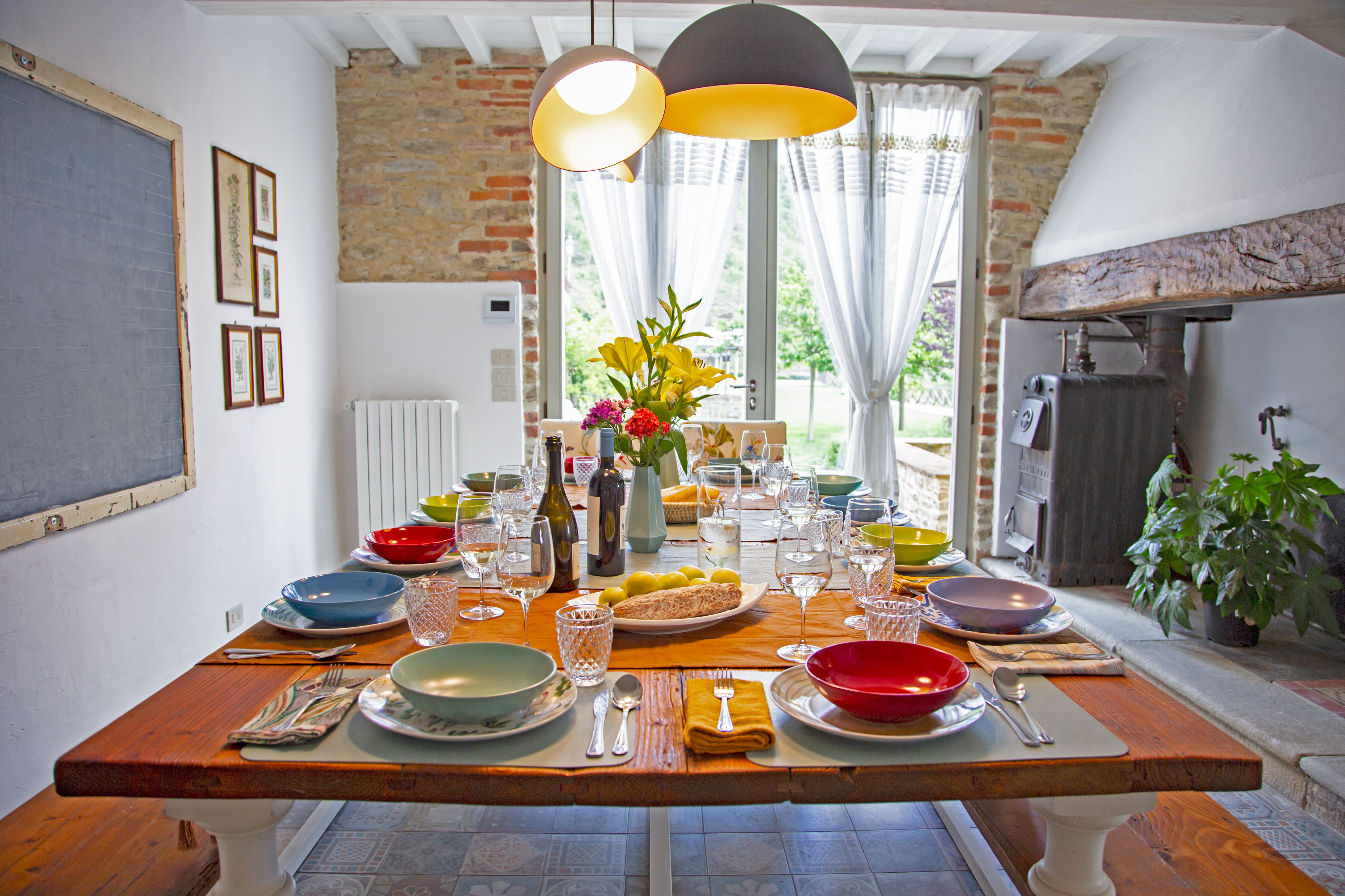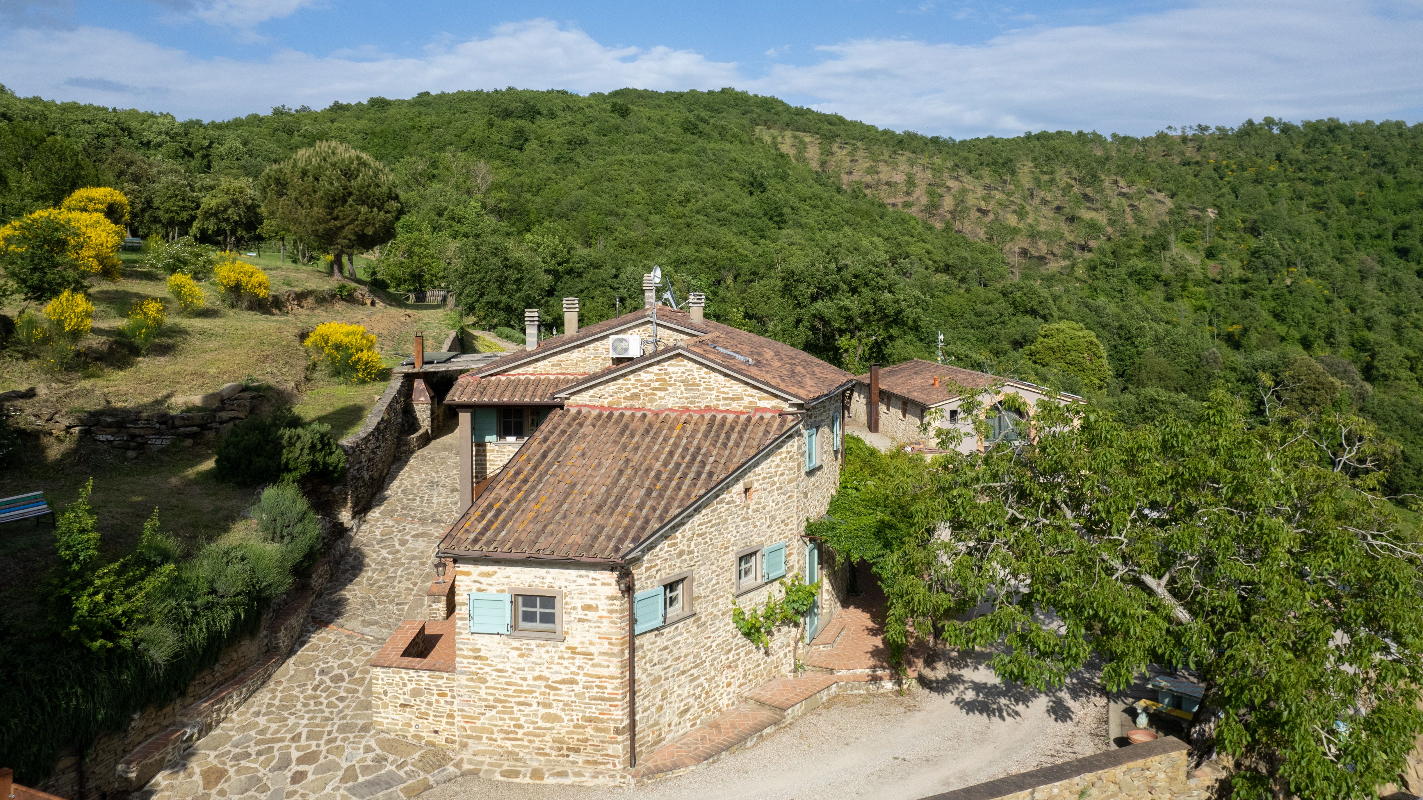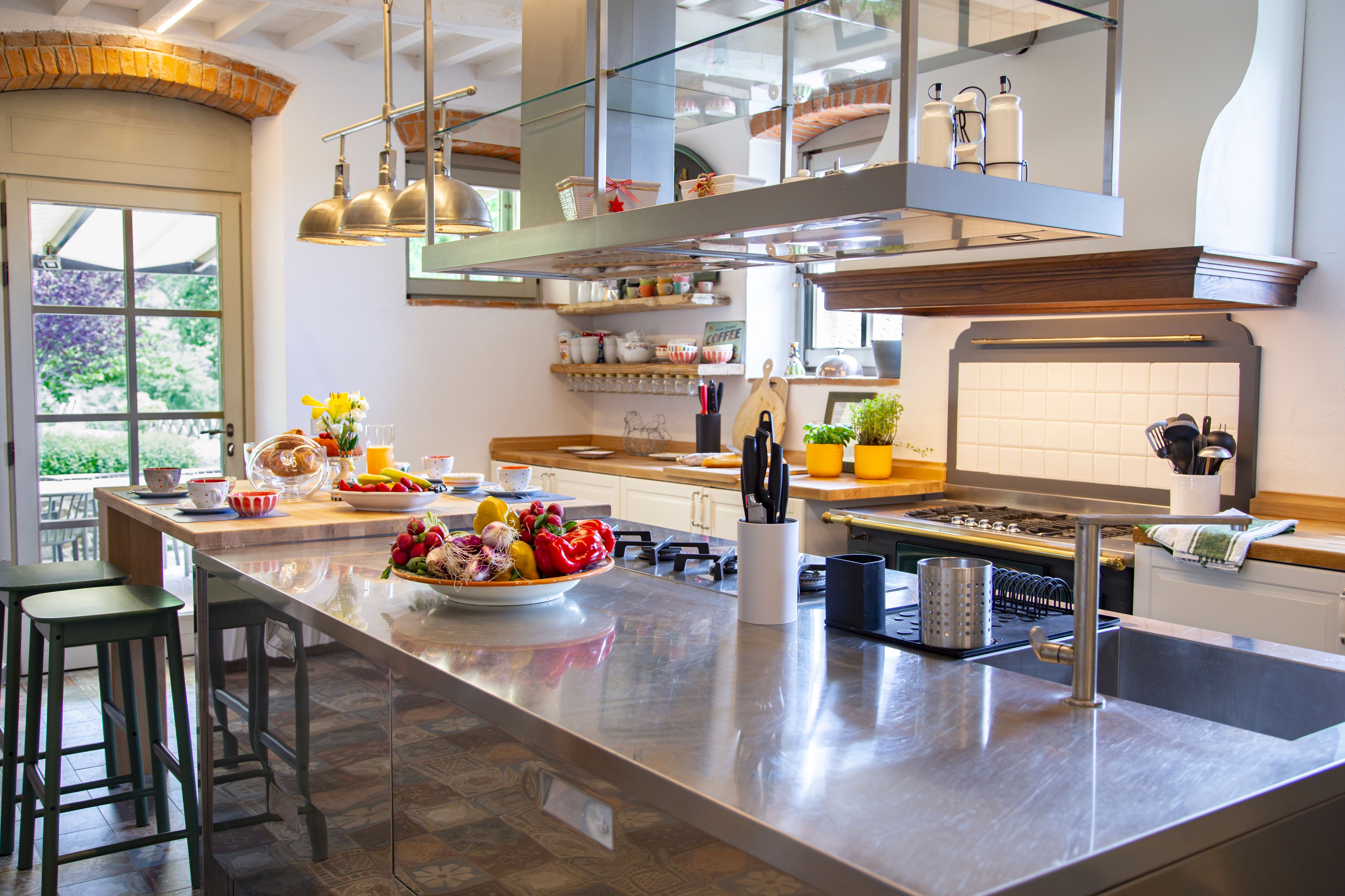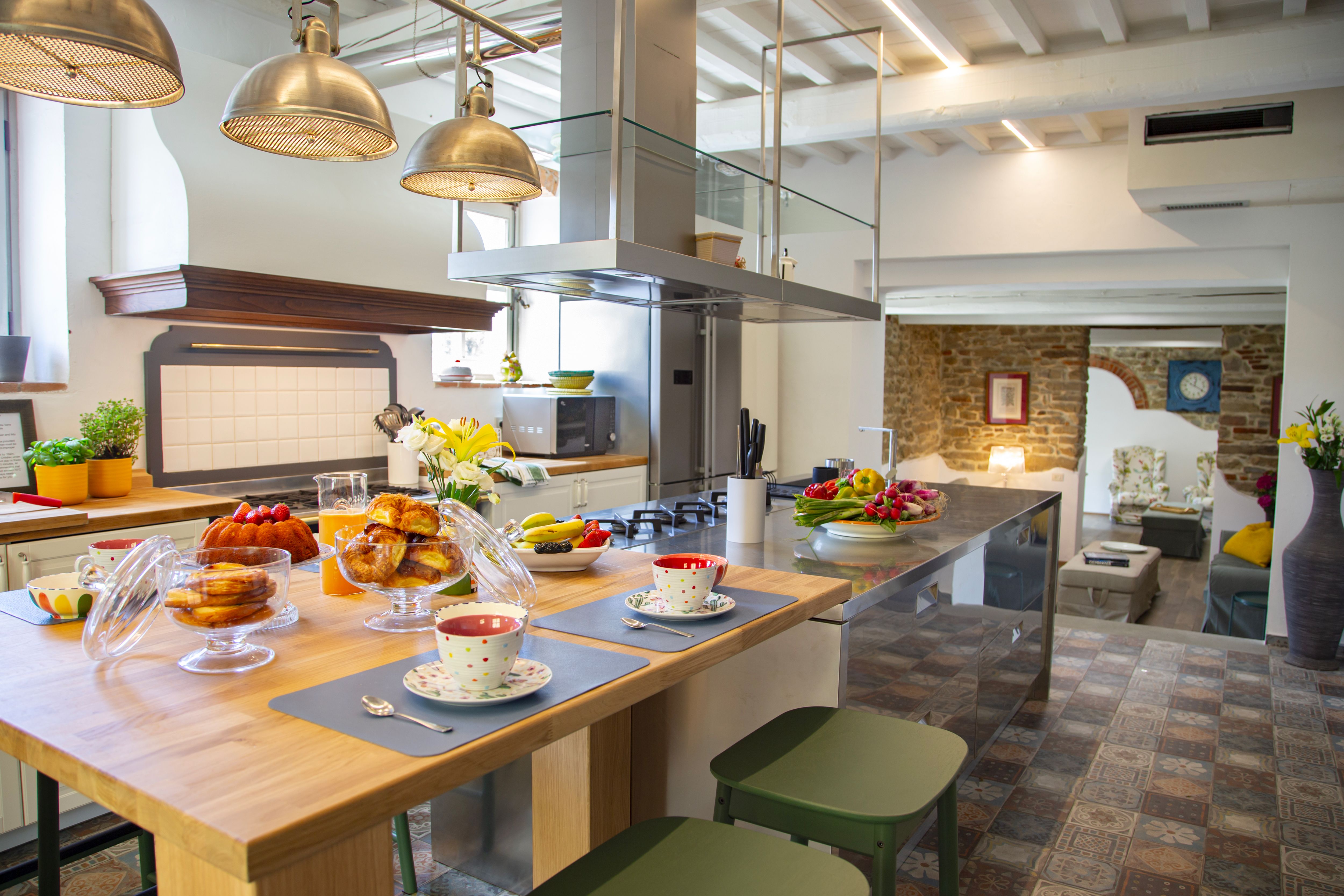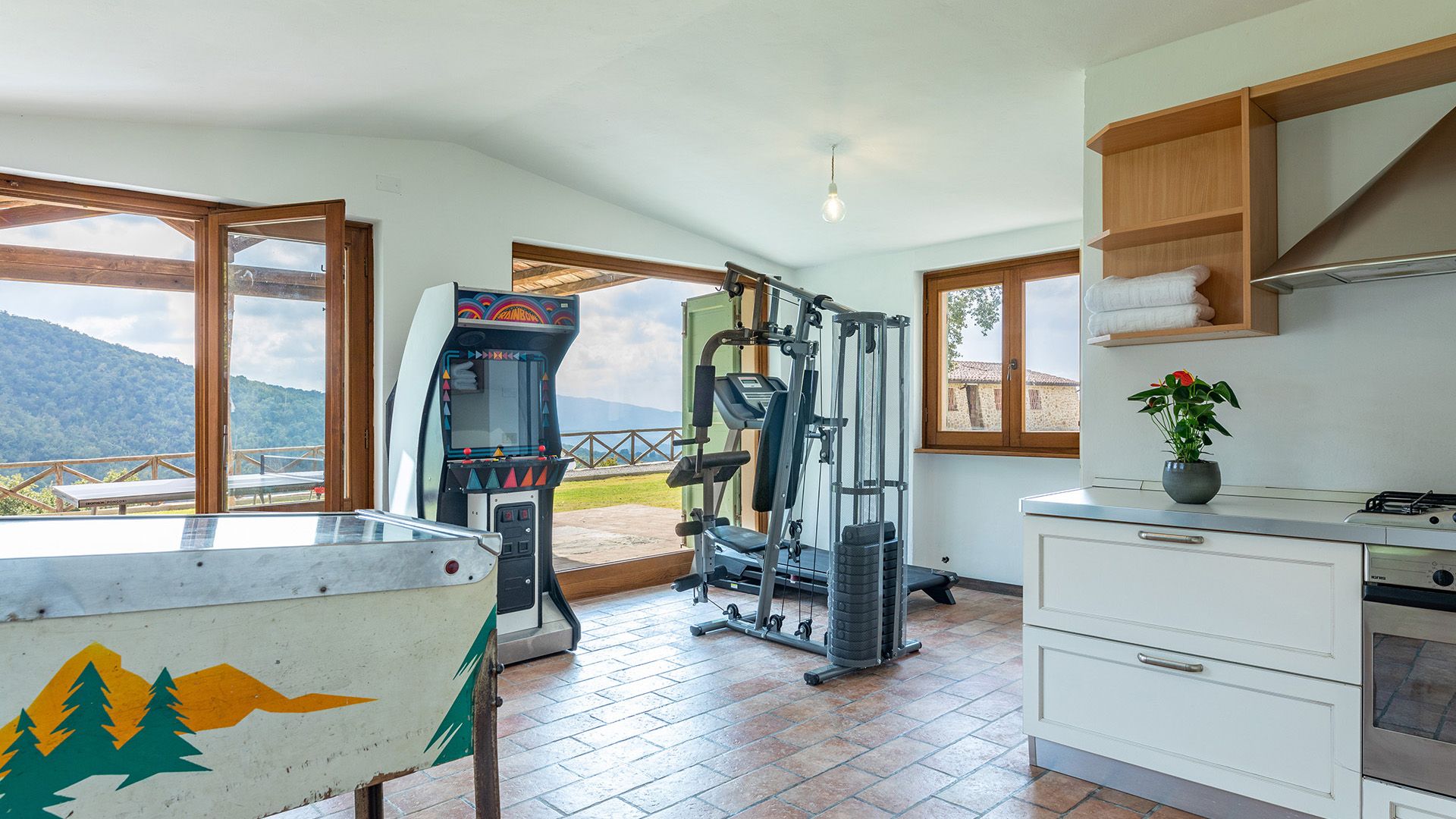 You’ll find this arresting home in the hills above Arezzo, boasting views of the Tuscan valley beneath it, as well as beautiful gardens. Set over several buildings, this large home includes a main farmhouse, two apartments, and an annexe. It’s ideal for large families or groups who want to spend a holiday together but still like a little privacy. The home has been designed to showcase the historic virtues of these ancient buildings – we were first taken by the classic stone walls and their attractive sage green shutters. Inside is a symphony of elegance. Neutral tones and natural textiles offset the original stone walls perfectly, while distressed wooden beams give the home a much softer, cosier atmosphere than you might first expect from its size. The main kitchen looks as though it was designed with professional chefs in mind, while in the two separate apartments, you’ll find smaller kitchens that pay homage to their humble farmhouse beginnings while still looking effortlessly chic – think Aga-style ovens, glass fronted cabinets, and vintage dining tables. The bedrooms ooze relaxation, with modern furniture, gauzy textiles, and clever lighting making for a boutique hotel experience. And that’s before we even get to this home’s outdoor areas. Covering several hectares, the gardens back onto a wood where guests can roam and play, while back in the garden you’ll not only find a children’s playground, ping pong table, and hot tub, but a Roman-style pool surrounded by sun loungers, a glorious view of the countryside below, and even a diving board.
