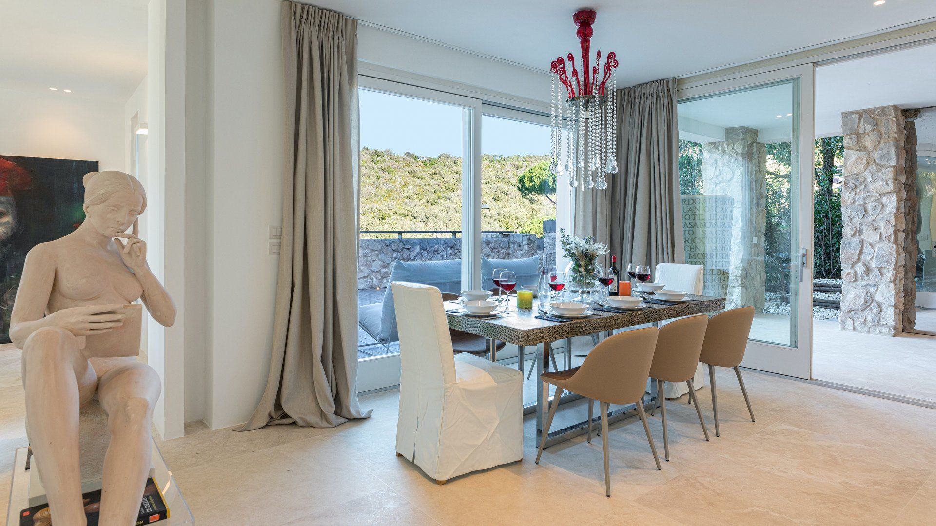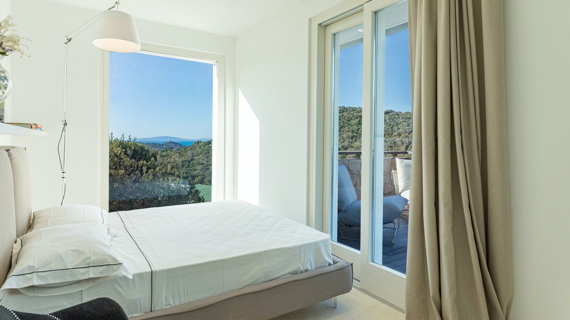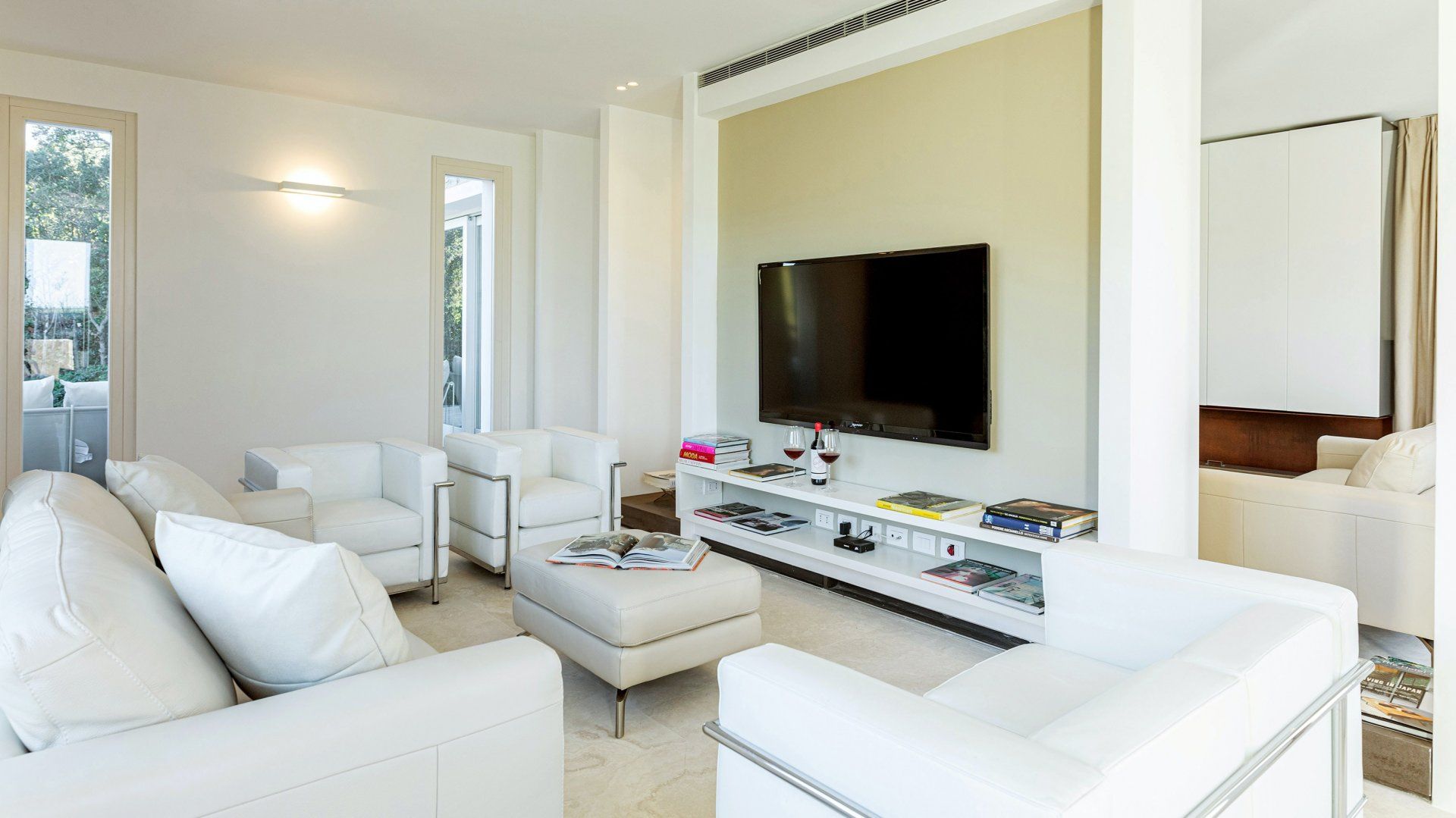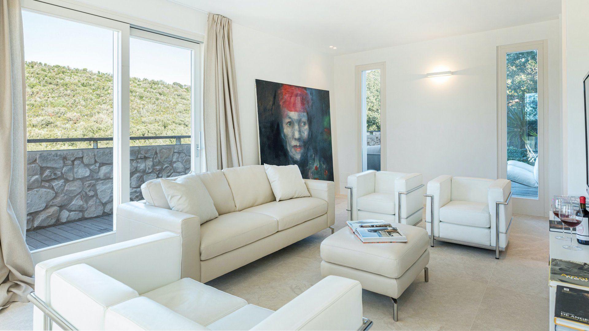 Whitewashed and modern with unbroken views of rolling hills, this villa is the perfect gathering place for a family or group of friends looking to unwind in style. Inside, it’s all glass walls and minimalist spaces, while the outside area is a fanfare of colour with evergreen shrubs and blooming flowerbeds.