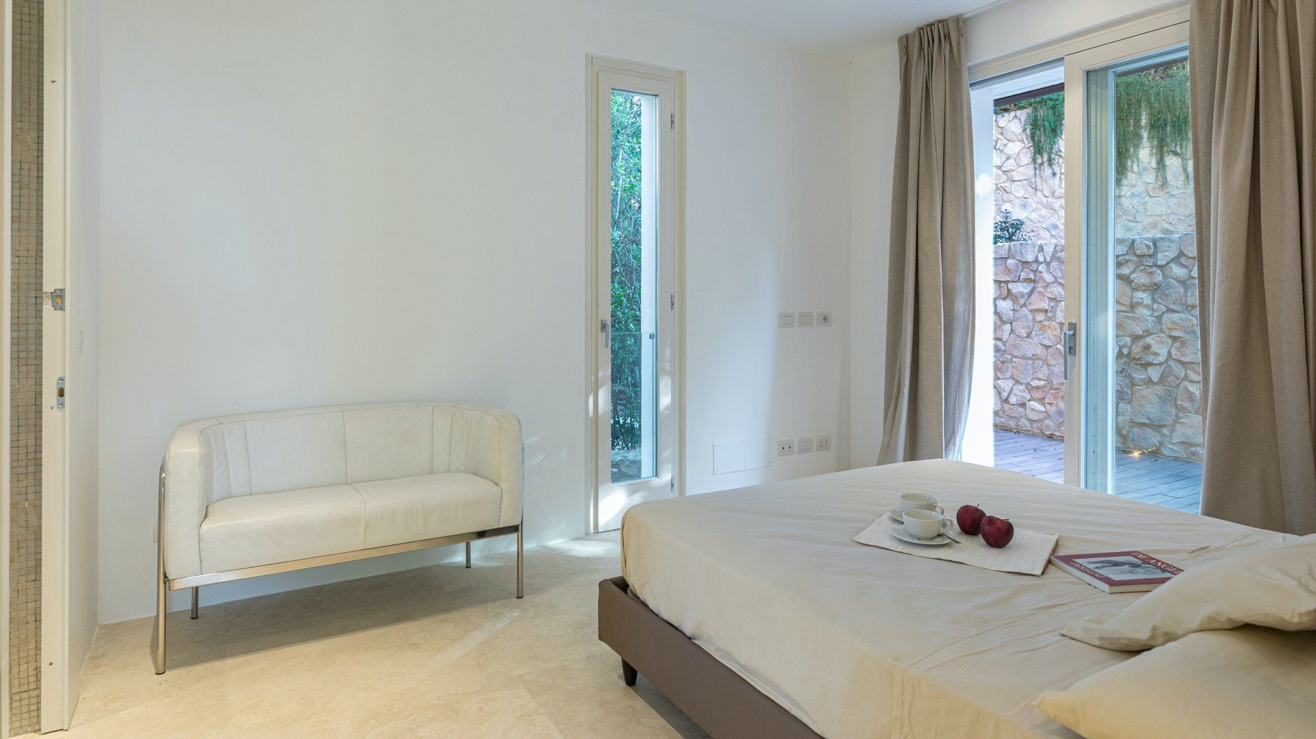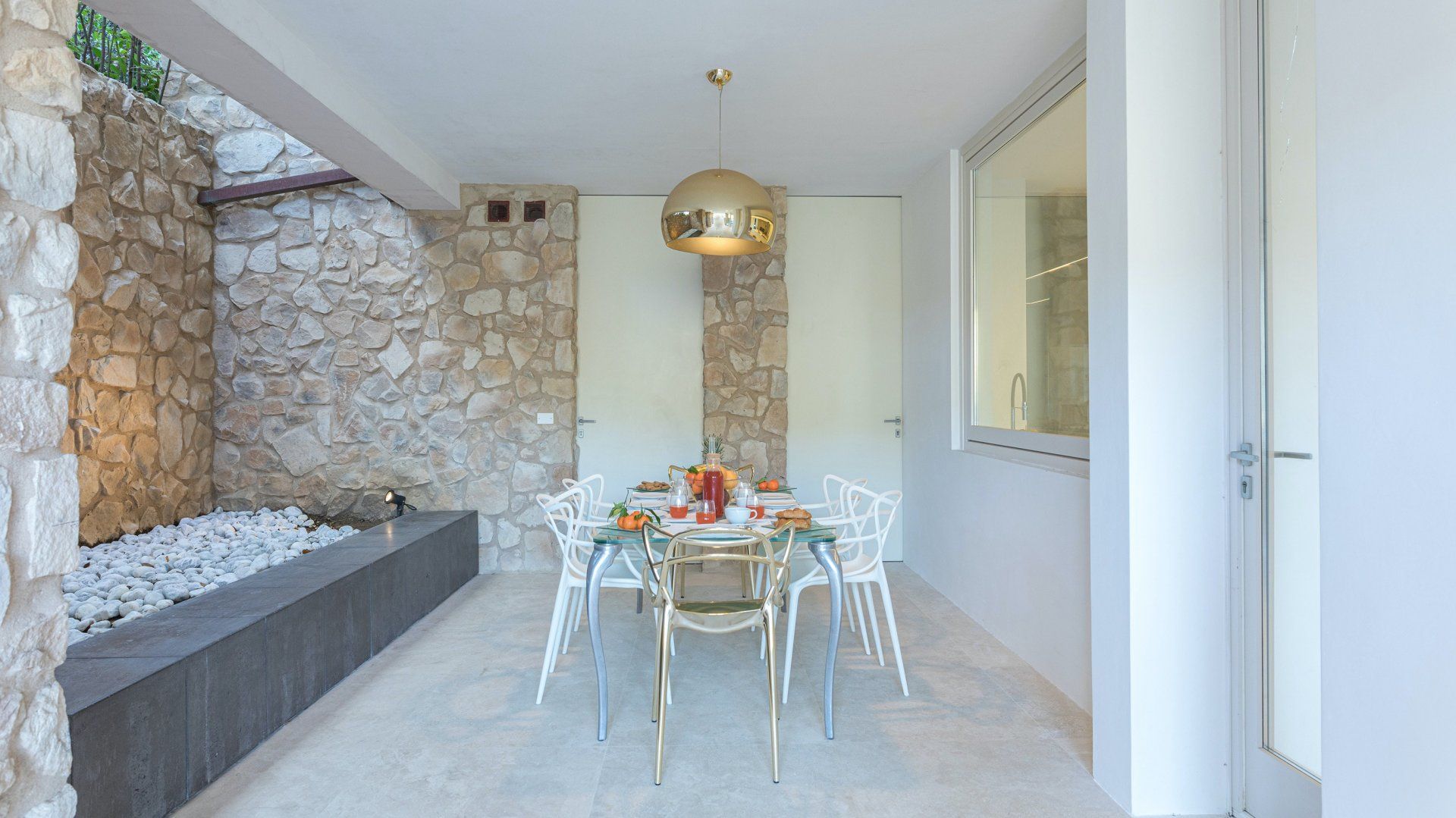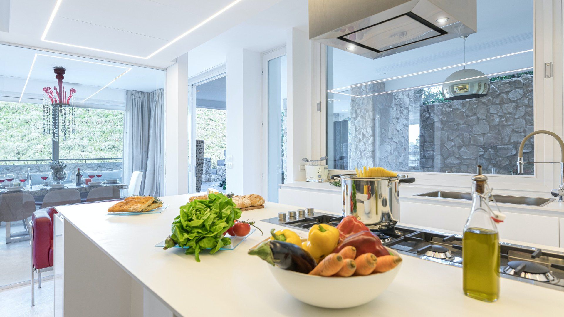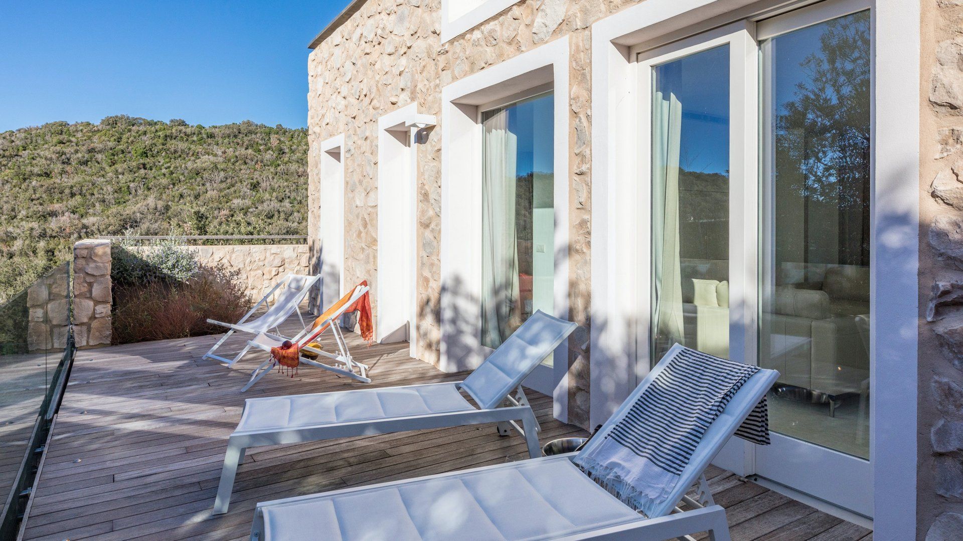 Whitewashed and modern with unbroken views of rolling hills, this villa is the perfect gathering place for a family or group of friends looking to unwind in style. Inside, it’s all glass walls and minimalist spaces, while the outside area is a fanfare of colour with evergreen shrubs and blooming flowerbeds.
