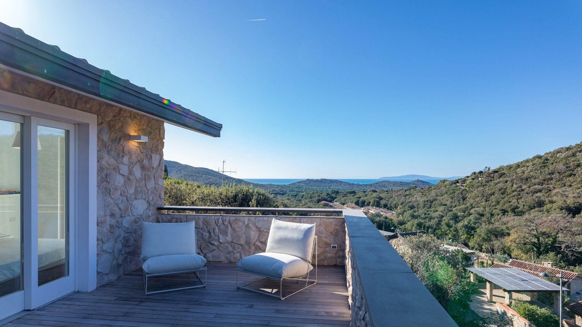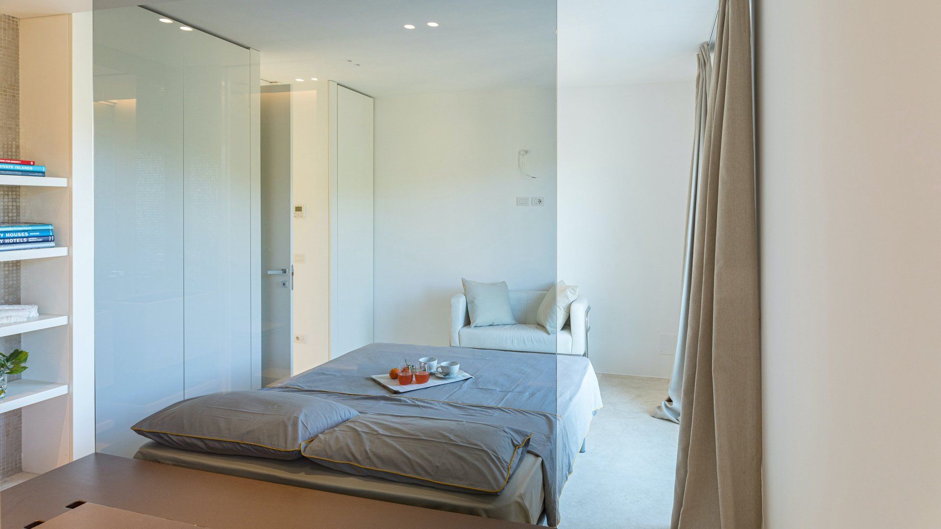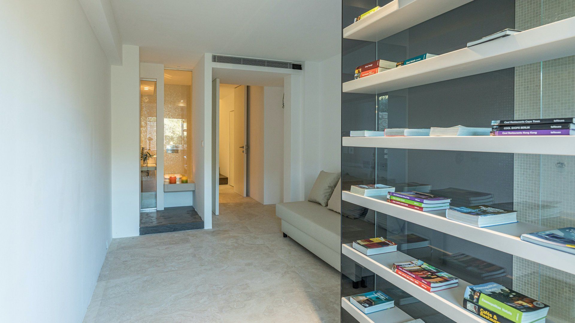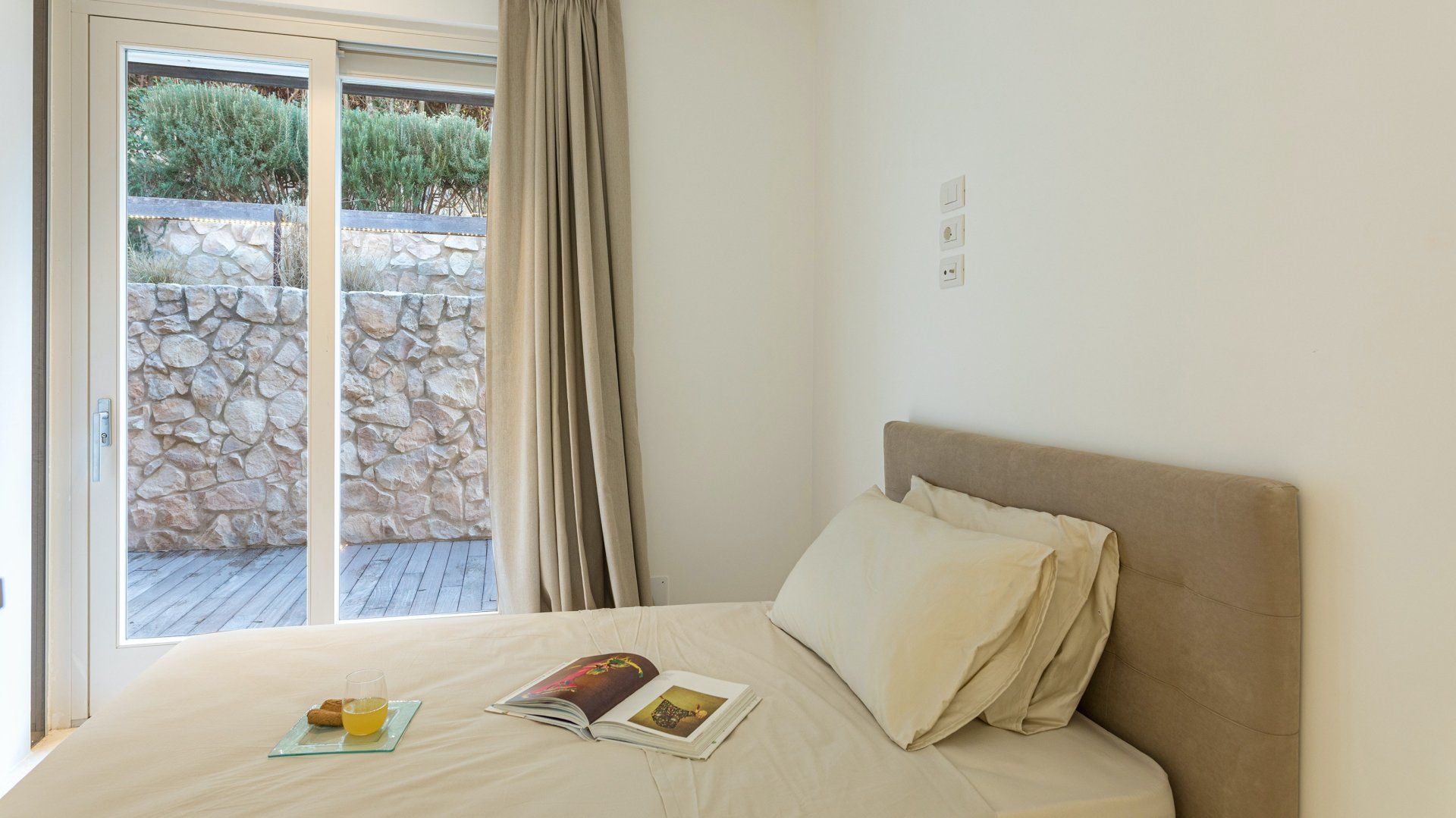 Whitewashed and modern with unbroken views of rolling hills, this villa is the perfect gathering place for a family or group of friends looking to unwind in style. Inside, it’s all glass walls and minimalist spaces, while the outside area is a fanfare of colour with evergreen shrubs and blooming flowerbeds.
