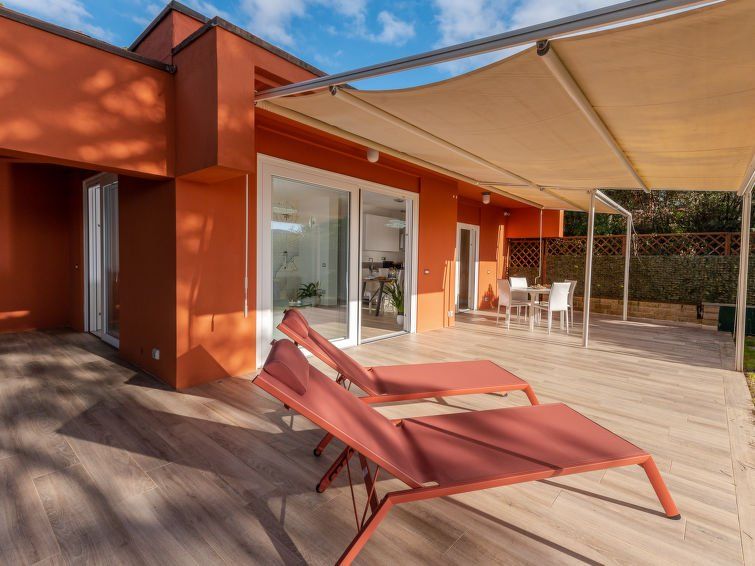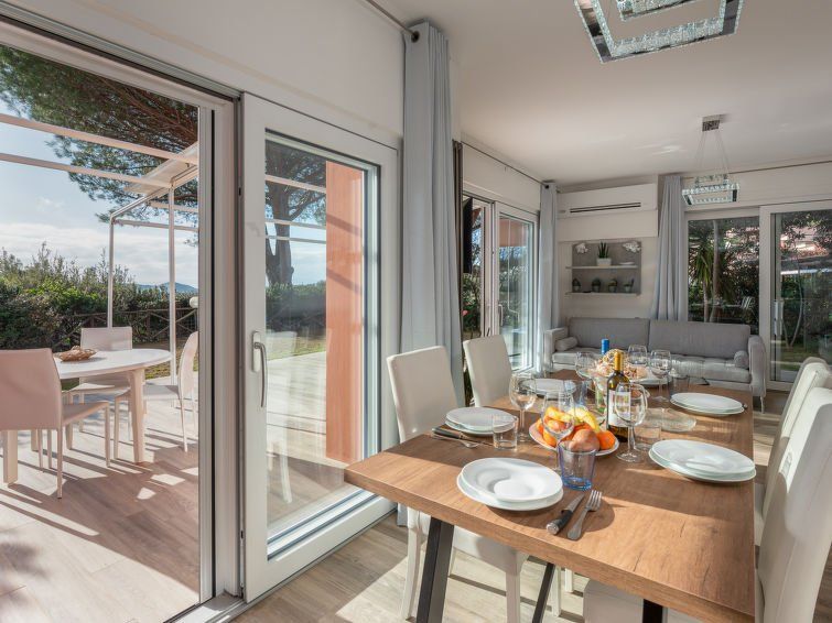"Villa Marzia Mare & Golf", 5-room house 120 m2. Spacious and bright, fully renovated in 2022, very modern and stylish furnishings: living/dining room with panoramic window with TV (flat screen), air conditioning. Exit to the garden, to the terrace. 2 double bedrooms, each room with TV (flat screen), air conditioning.