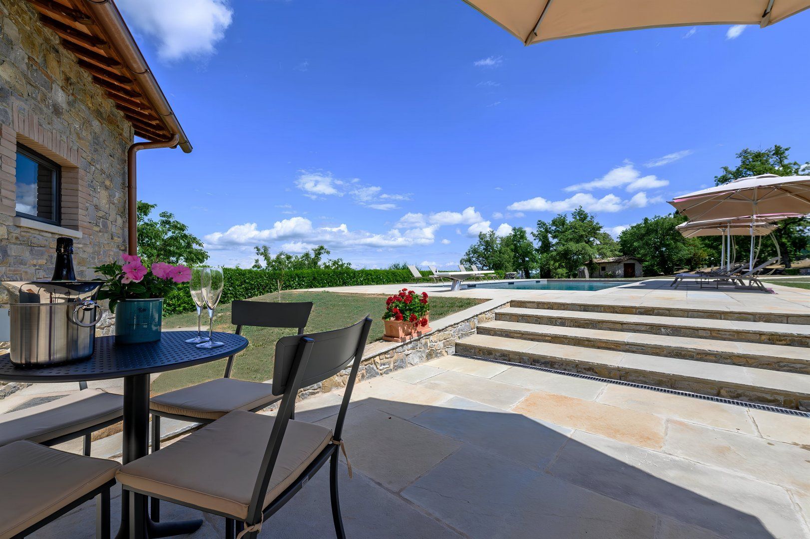 *The swimming pool is a fifty-metre walk from the villa. It is for seasonal use from May to October, weather permitting. There is a pool house with an additional shower room and an honesty bar. Guests can help themselves and pay upon checkout.