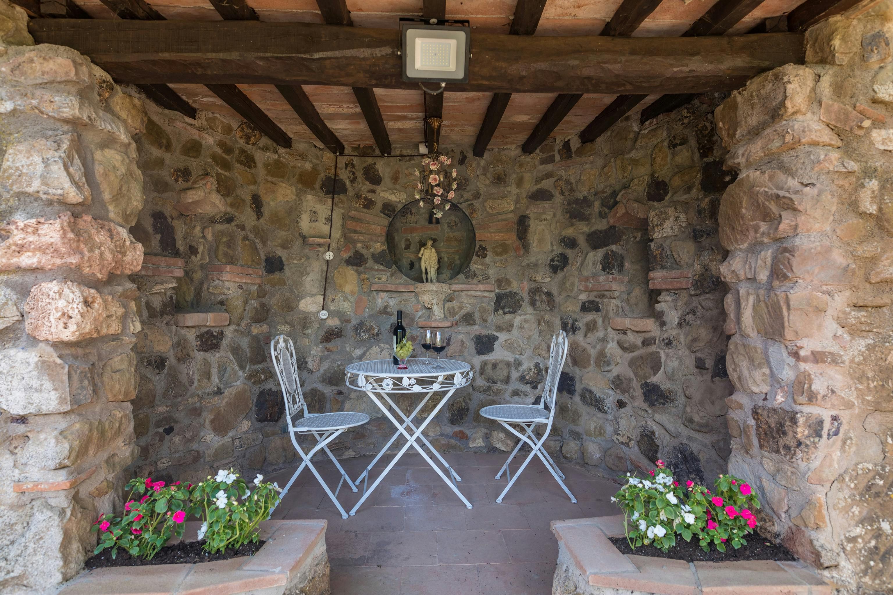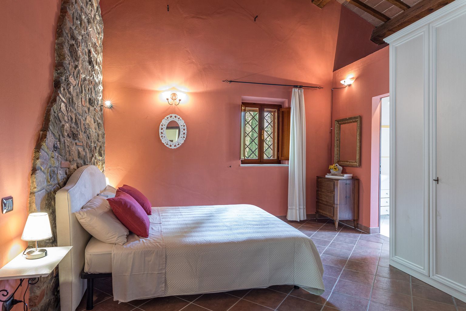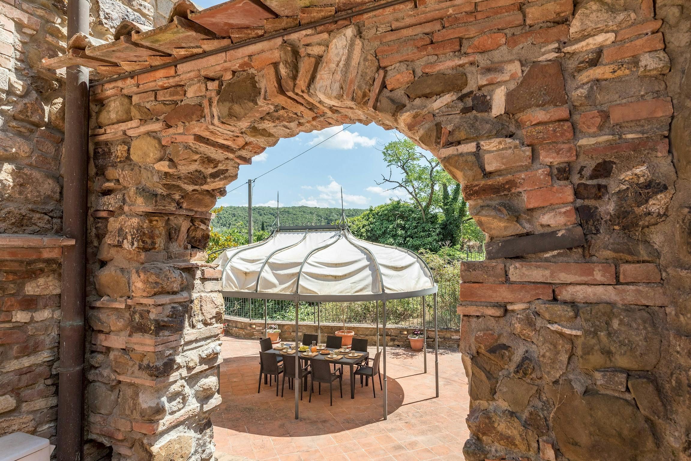 This traditional Tuscan farmhouse is the perfect place to relax and enjoy the Italian countryside. Located just a few kilometres from the thermal springs of Rapolano Terme, the house is surrounded by vineyards and olive groves, with a lush garden of cypresses, olive trees, and rose bushes. There’s a private pool and a delightful alfresco dining space in the shade of a gazebo. The house boasts preserved original features including stone walls and beamed ceilings. The main bedroom is equipped with a double bed and two additional single beds on a mezzanine floor, which is ideal for parents to share with their children.