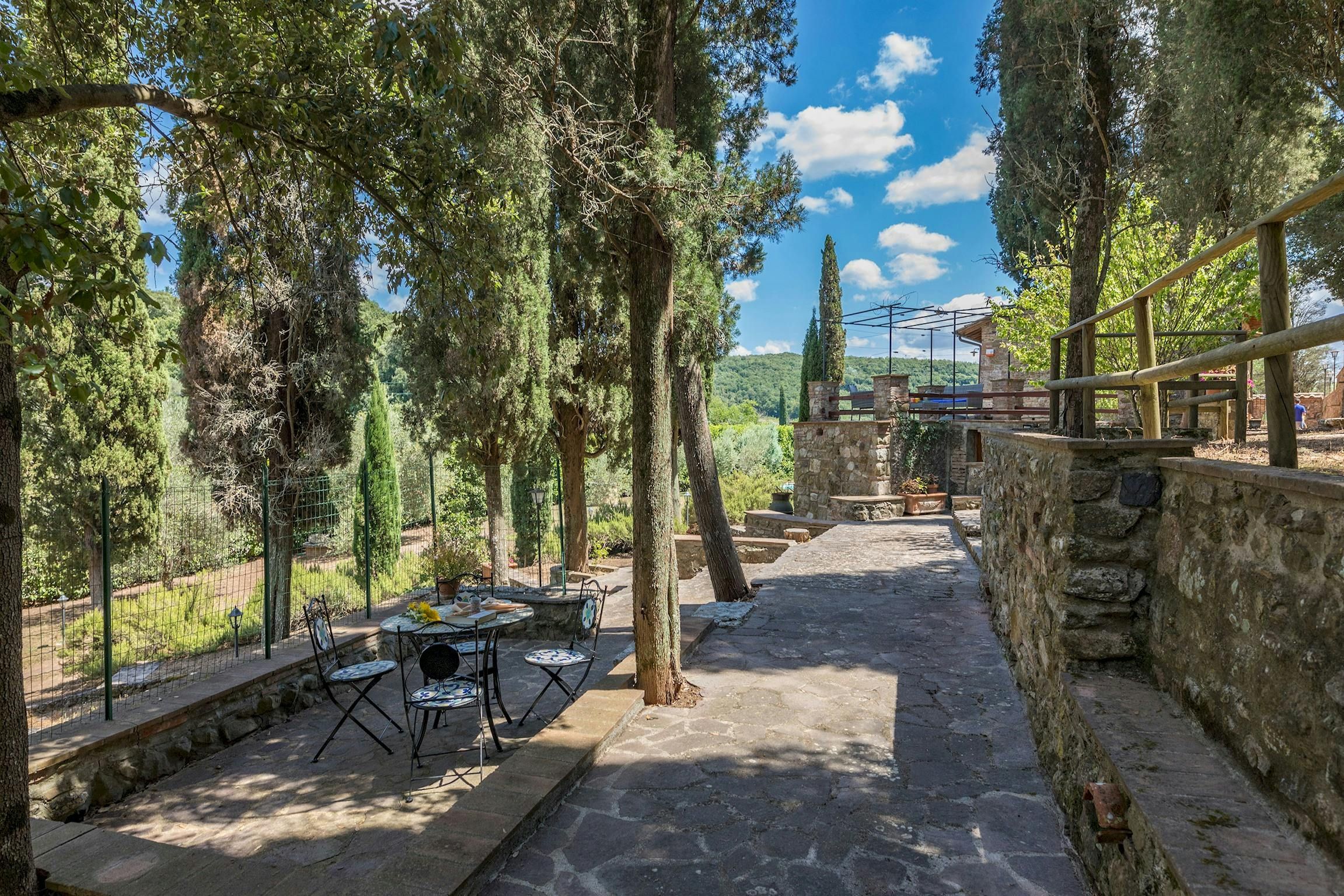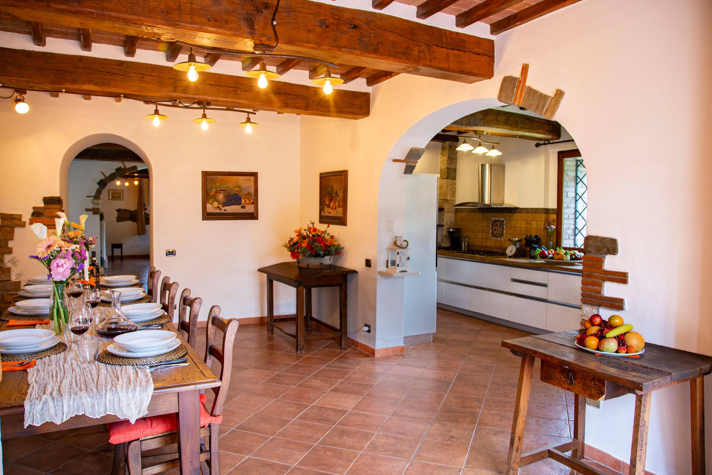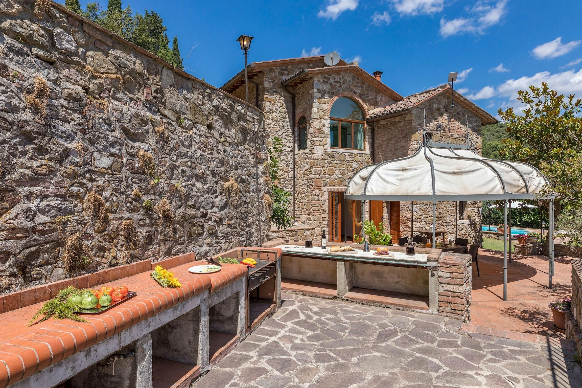 This traditional Tuscan farmhouse is the perfect place to relax and enjoy the Italian countryside. Located just a few kilometres from the thermal springs of Rapolano Terme, the house is surrounded by vineyards and olive groves, with a lush garden of cypresses, olive trees, and rose bushes. There’s a private pool and a delightful alfresco dining space in the shade of a gazebo. The house boasts preserved original features including stone walls and beamed ceilings. The main bedroom is equipped with a double bed and two additional single beds on a mezzanine floor, which is ideal for parents to share with their children.