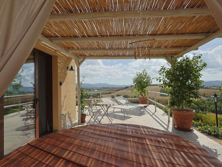 "Poggio Piero 1", 2-room terraced house on the ground floor. Bright, comfortable and modern furnishings: living/dining room with panoramic window with dining table and TV. Exit to the terrace. 1 double bedroom. Open kitchen (oven, dishwasher, 4 induction hot plates, microwave, electric coffee machine).