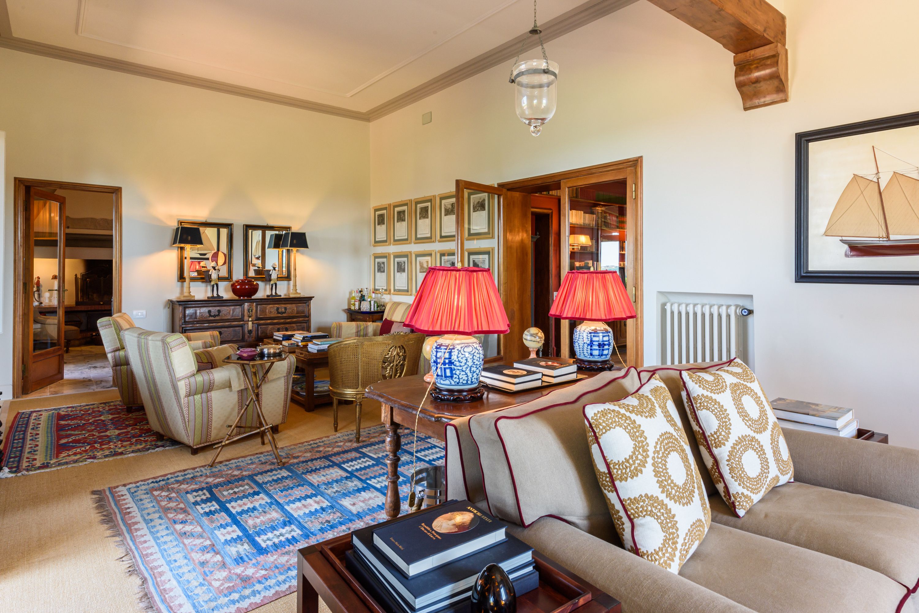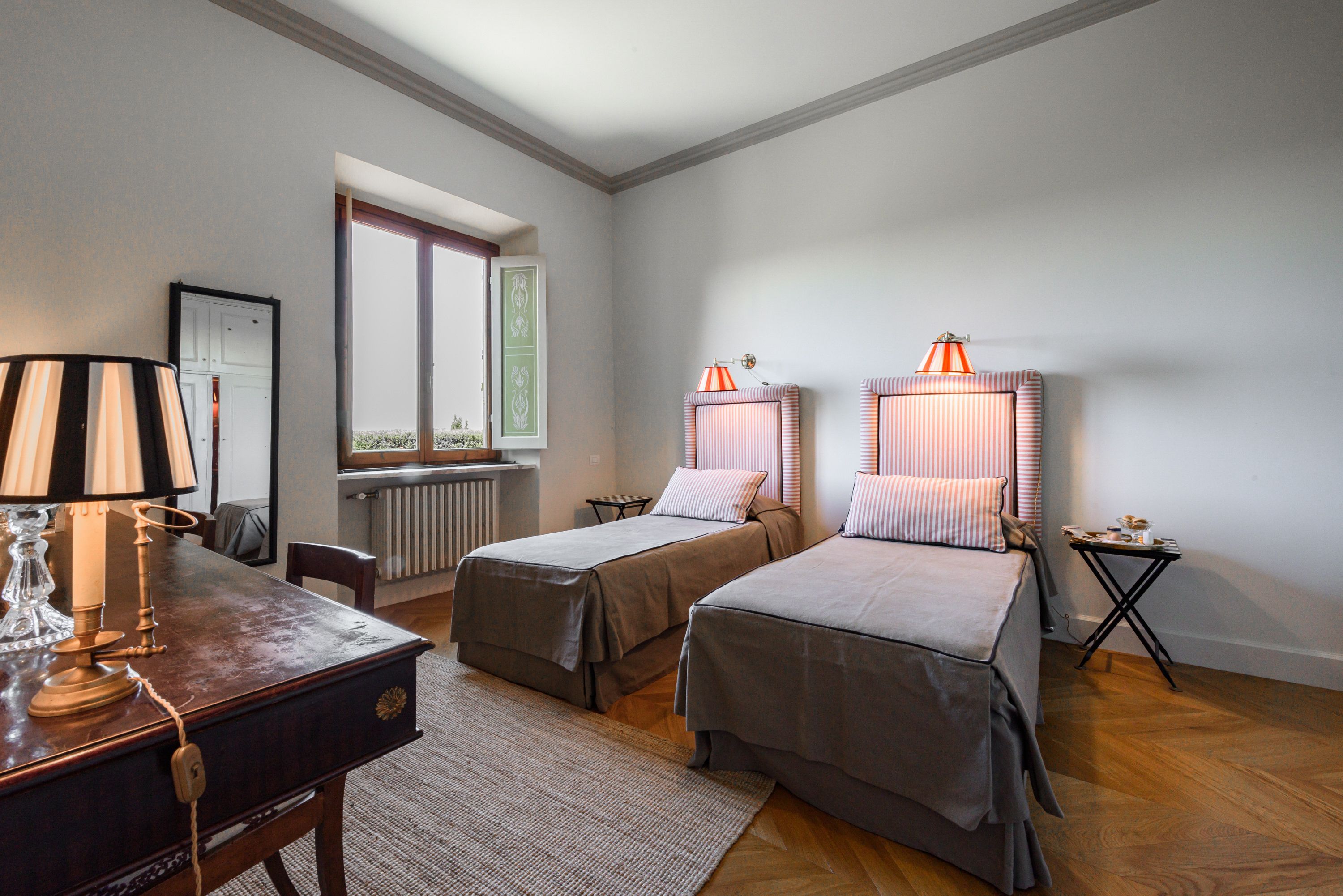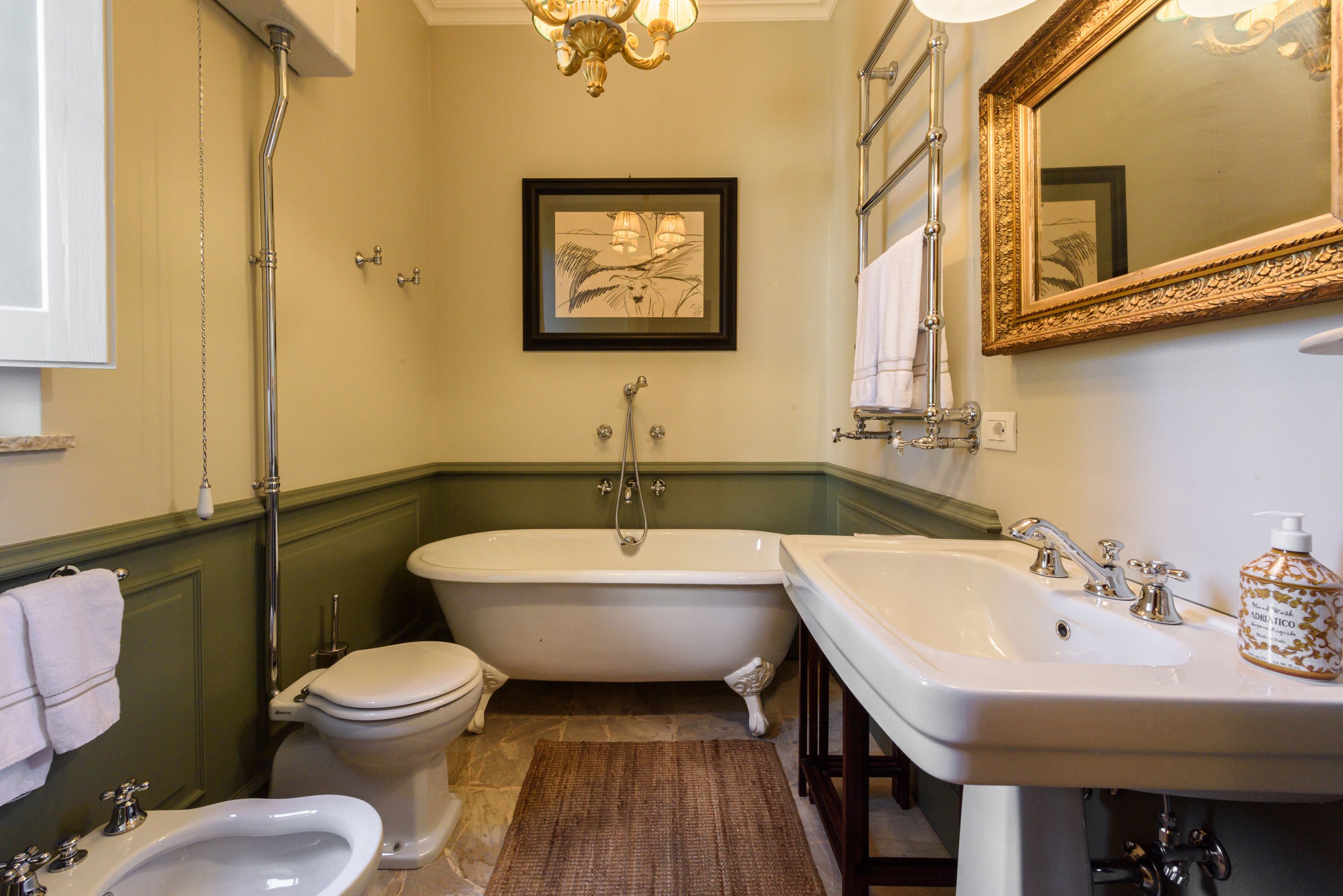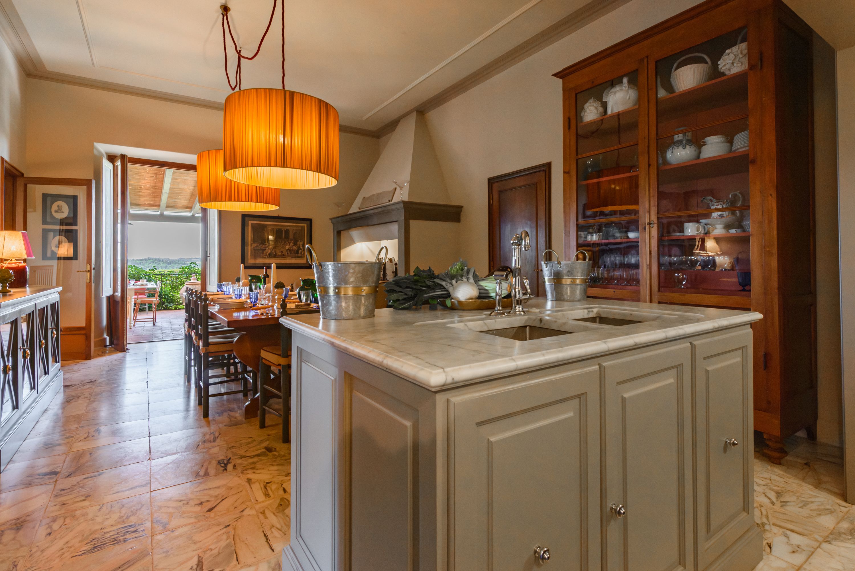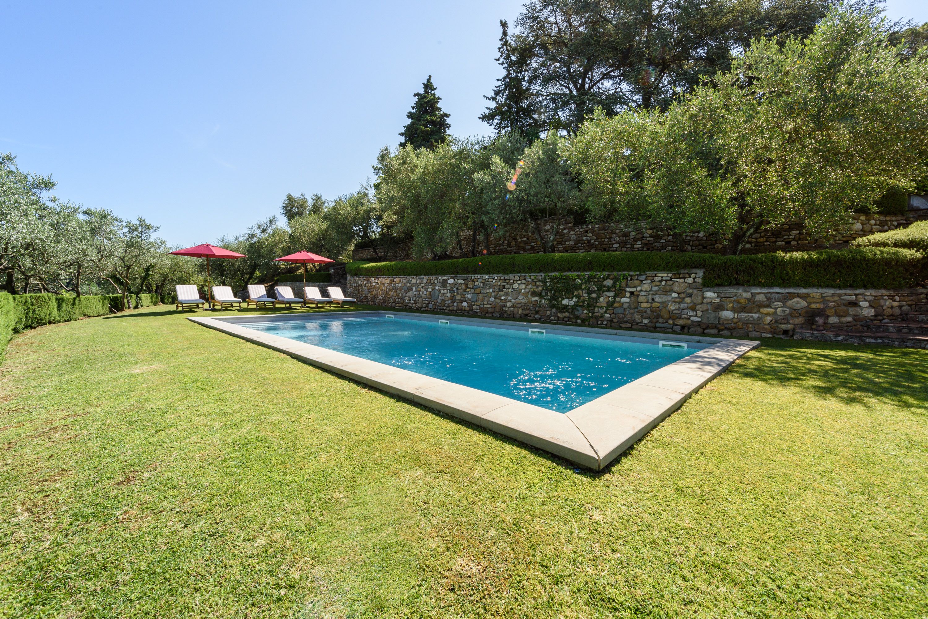 Up in the Chianti hills, this villa is surrounded by olive groves and vineyards. The setting is idyllic Tuscan countryside, yet it’s only 1km into the charming town of San Casciano Val di Pesa, whose narrow streets have a handful of traditional restaurants, shops and pavement cafés. The villa stands proud atop terraced gardens where stone steps lead to a turquoise pool at the bottom. The shaded back terrace houses multiple seating areas, from comfy outdoor sofas to a long, country-style dining table, all overlooking the Pesa river valley, between the cities of Florence and Siena. Inside you’ll find a selection of lounges for the whole group to spread out – a library brimming with books and a classy living room with traditional Italian sofas and darkwood dressers. The kitchen is a combination of modern and Tuscan traditional with an original open hearth still at the heart of the room. Bedrooms are furnished with antique wardrobes and some of the bathrooms have claw-footed bathtubs for a soak at the end of the day.