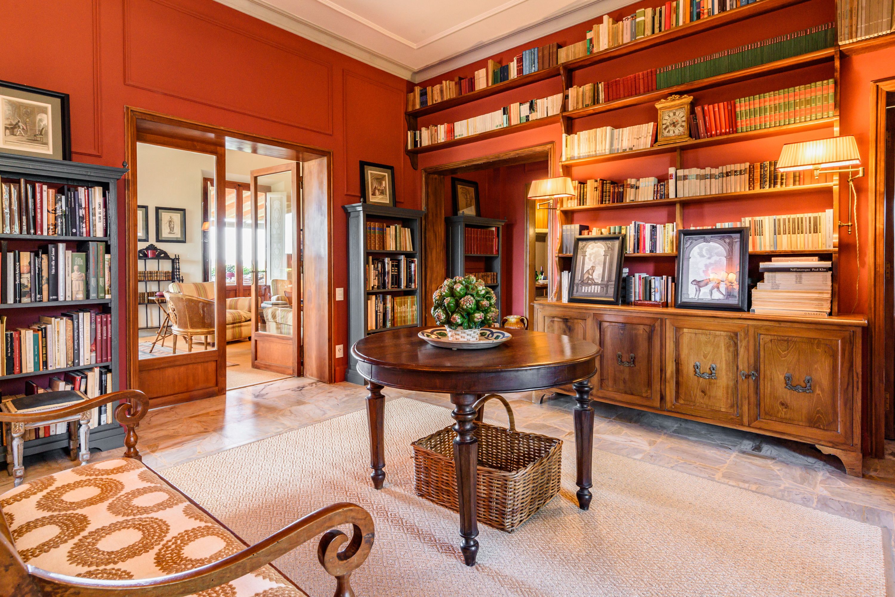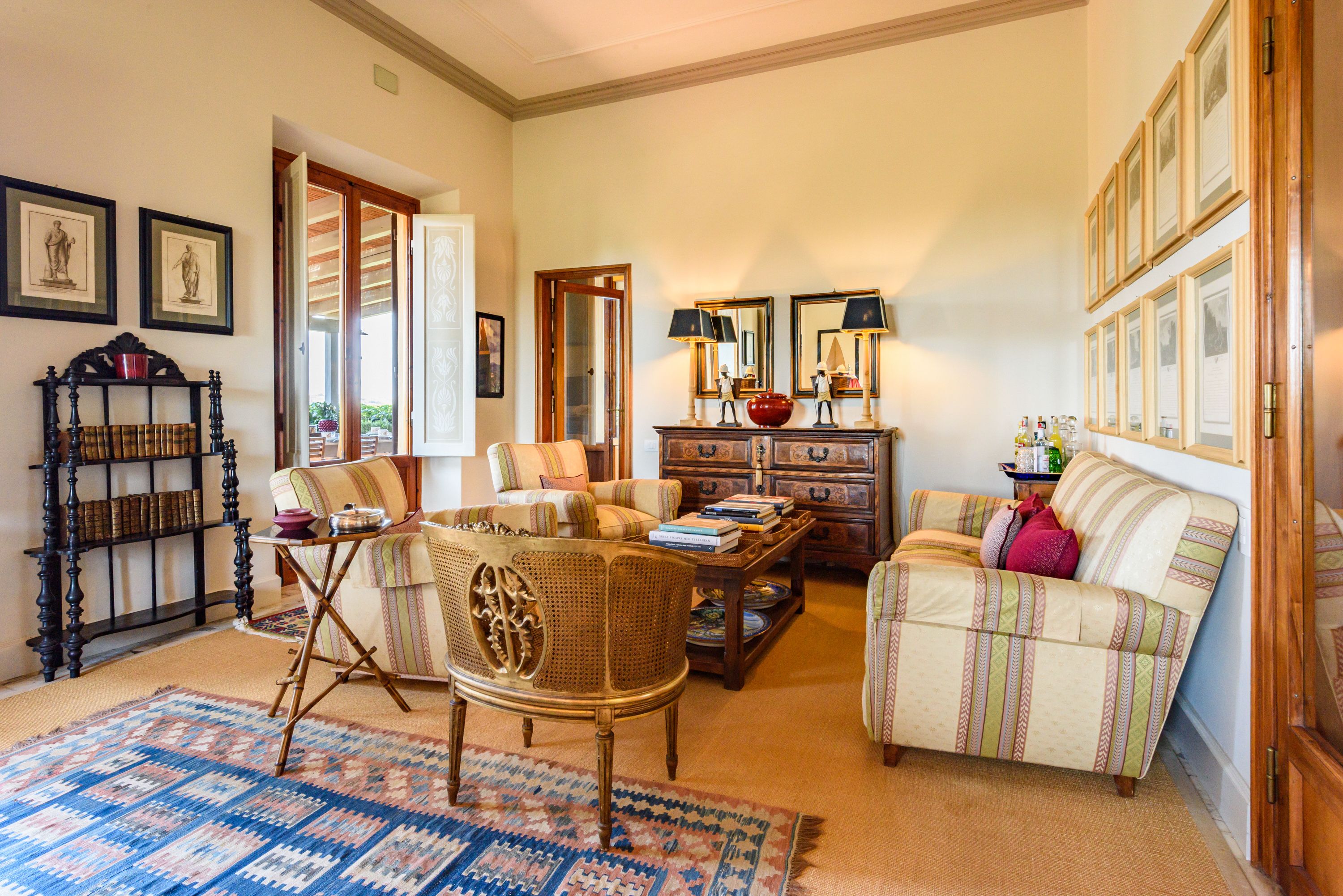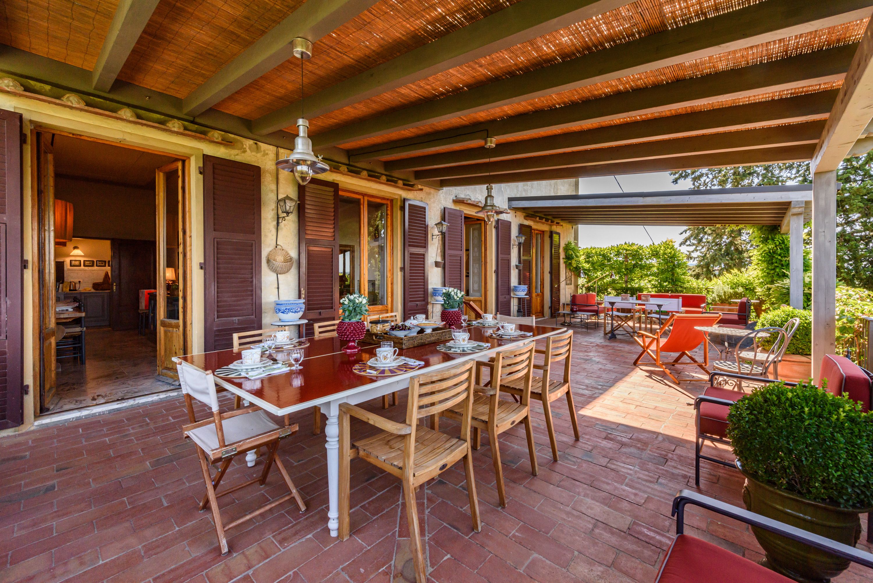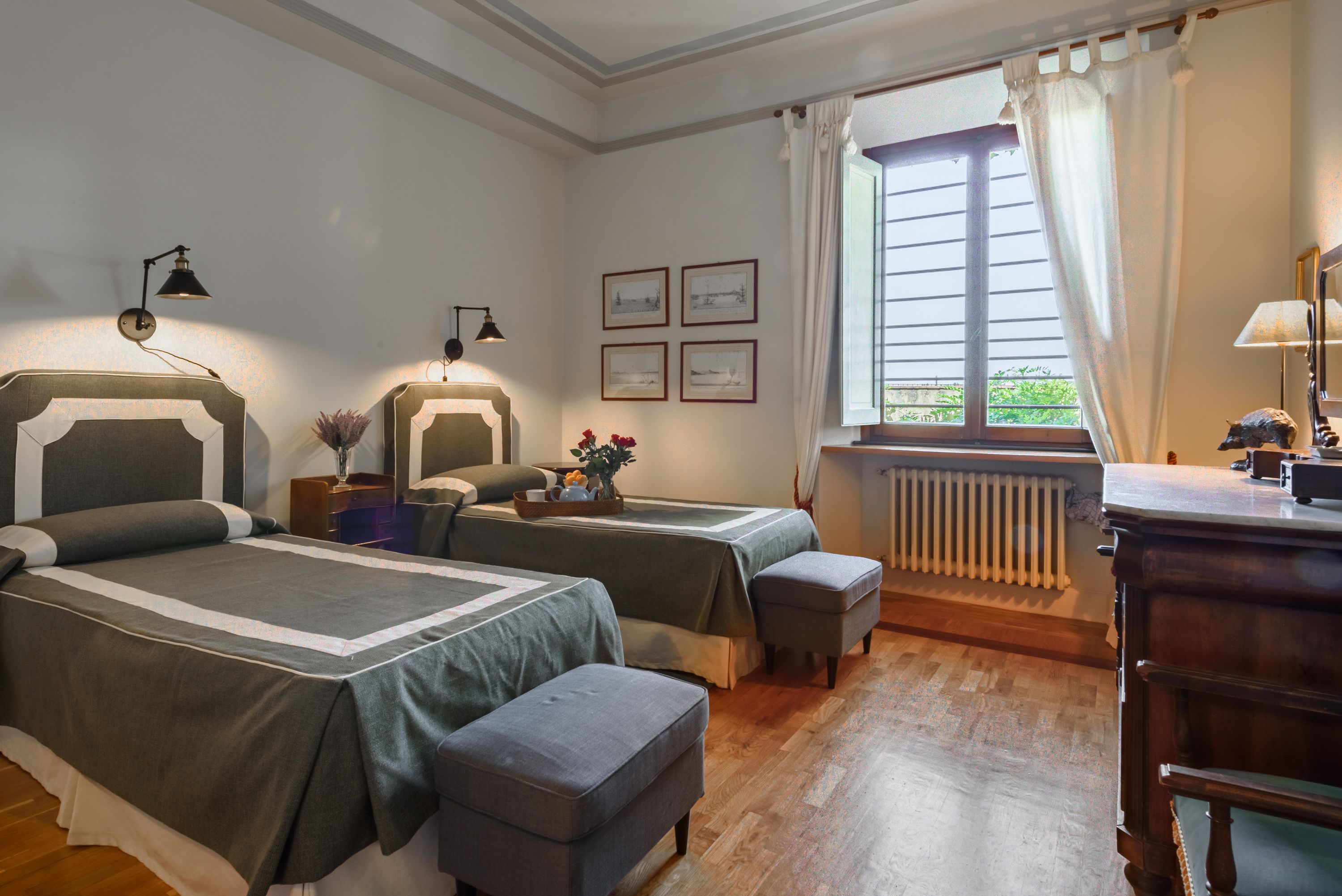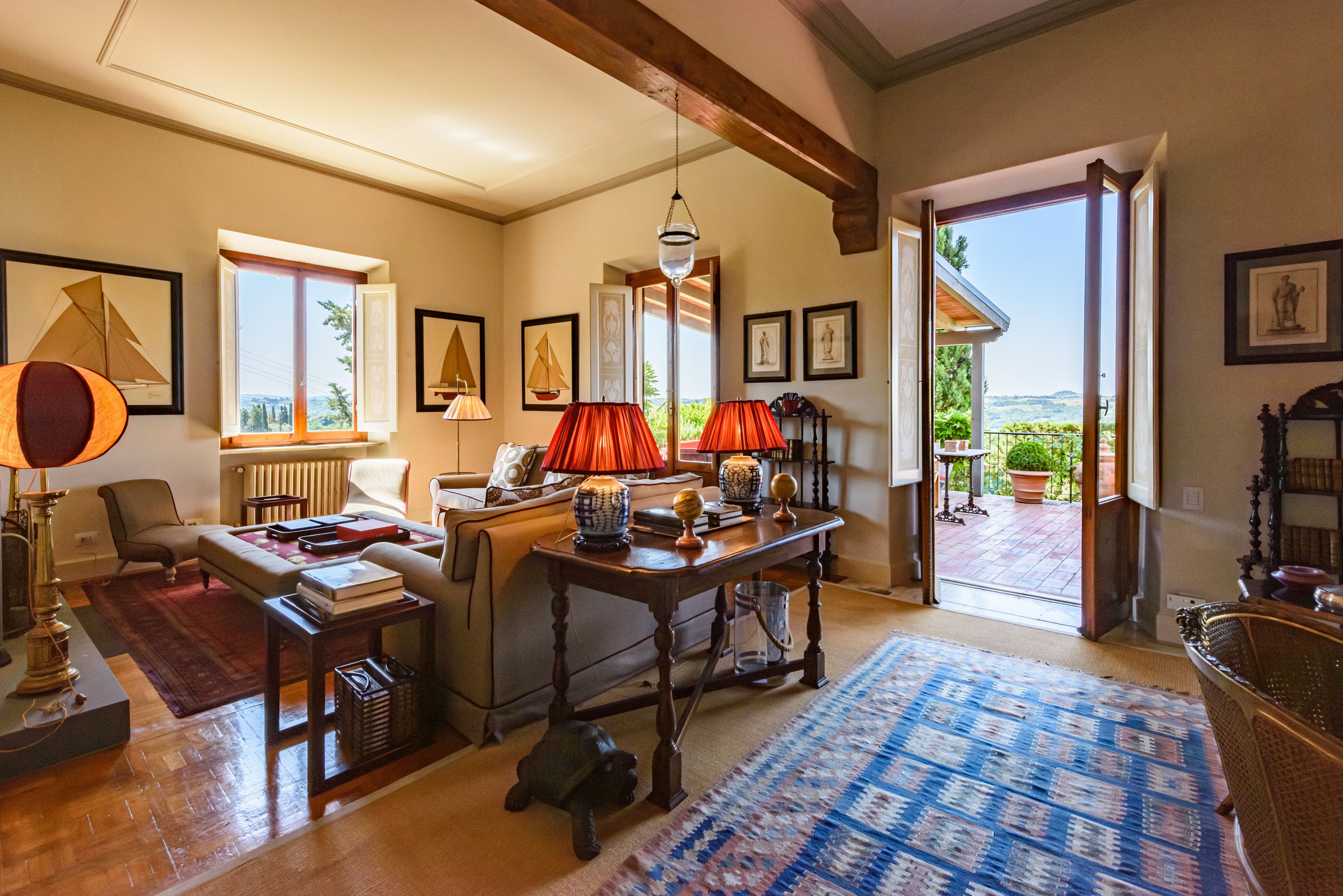 Up in the Chianti hills, this villa is surrounded by olive groves and vineyards. The setting is idyllic Tuscan countryside, yet it’s only 1km into the charming town of San Casciano Val di Pesa, whose narrow streets have a handful of traditional restaurants, shops and pavement cafés. The villa stands proud atop terraced gardens where stone steps lead to a turquoise pool at the bottom. The shaded back terrace houses multiple seating areas, from comfy outdoor sofas to a long, country-style dining table, all overlooking the Pesa river valley, between the cities of Florence and Siena. Inside you’ll find a selection of lounges for the whole group to spread out – a library brimming with books and a classy living room with traditional Italian sofas and darkwood dressers. The kitchen is a combination of modern and Tuscan traditional with an original open hearth still at the heart of the room. Bedrooms are furnished with antique wardrobes and some of the bathrooms have claw-footed bathtubs for a soak at the end of the day.