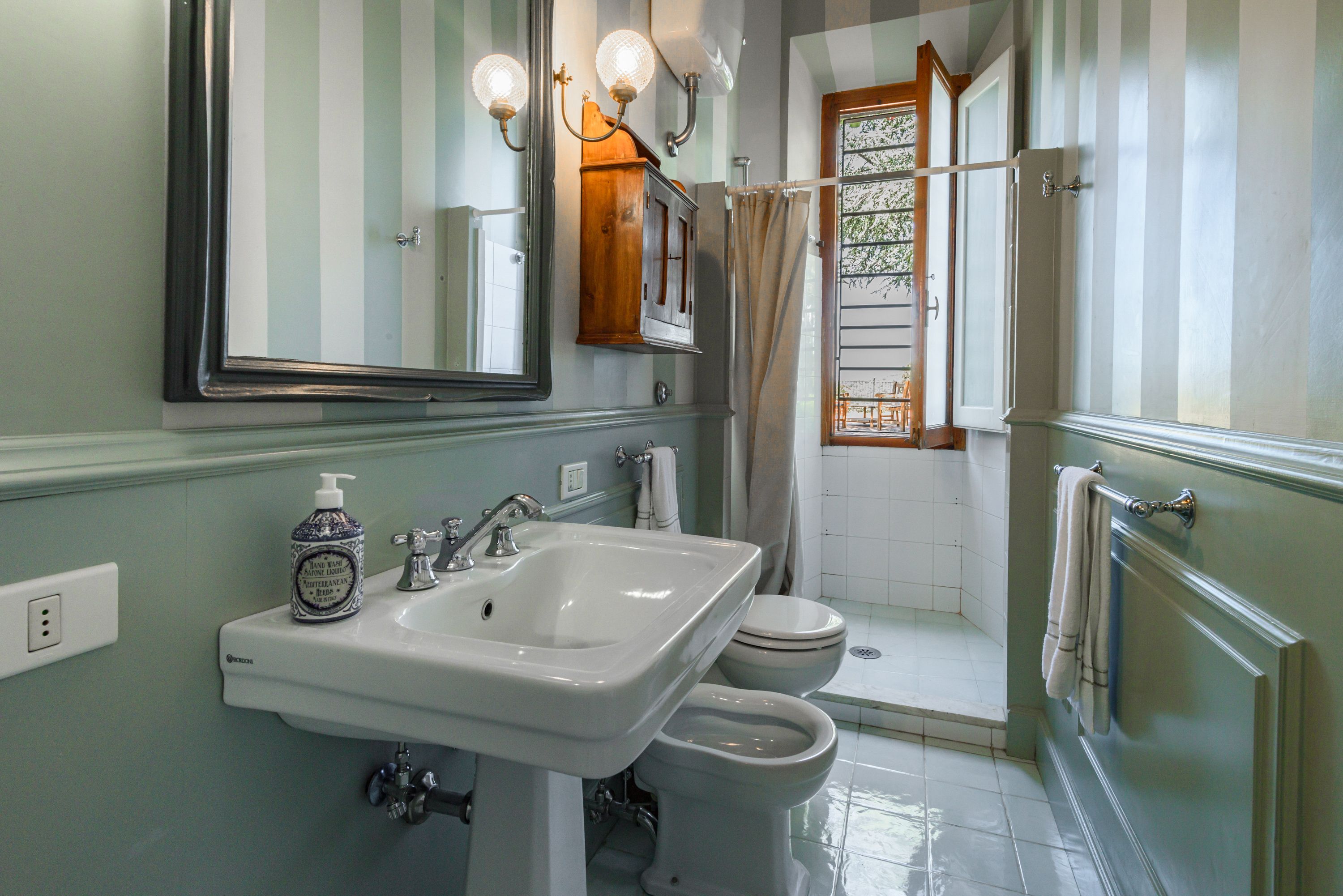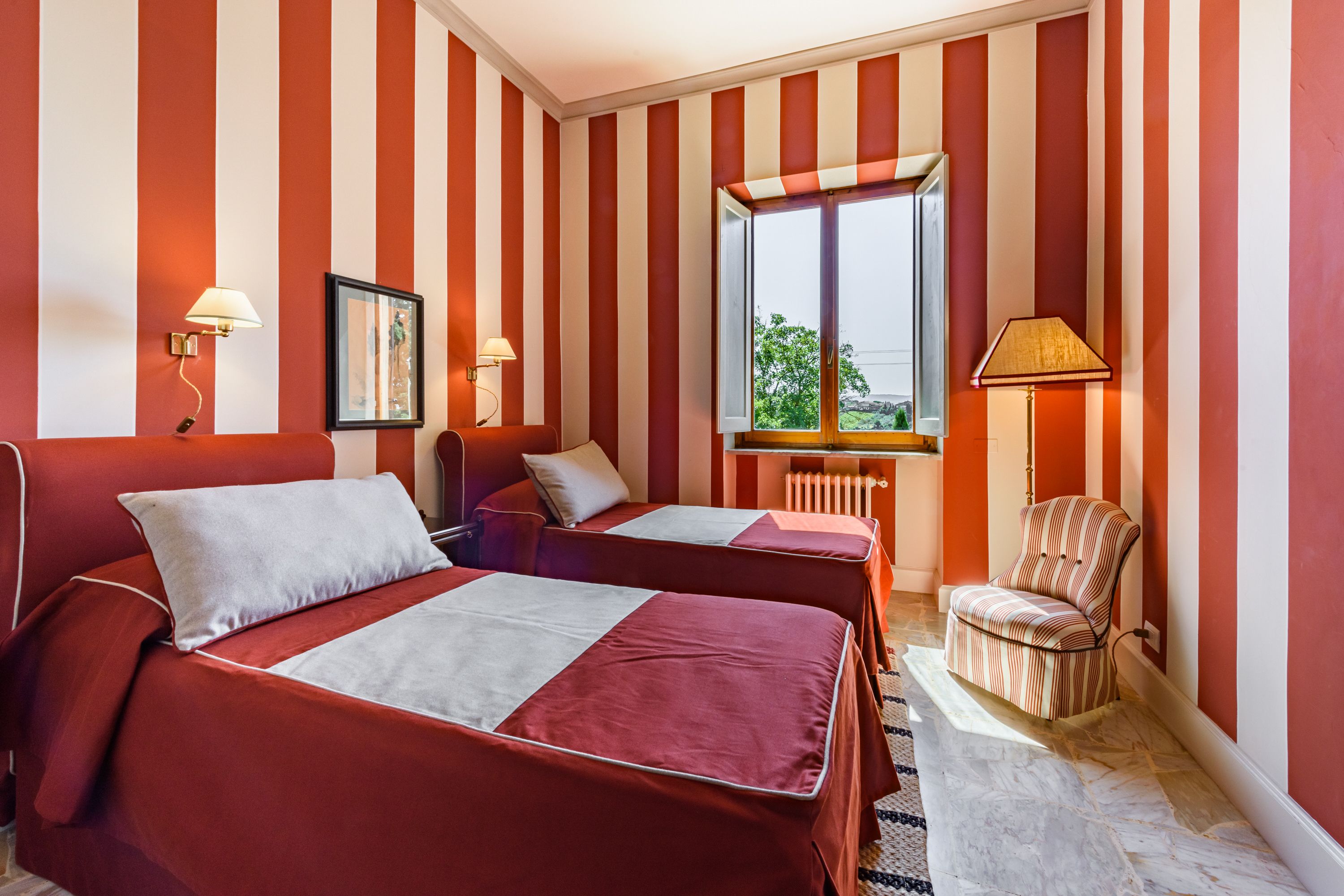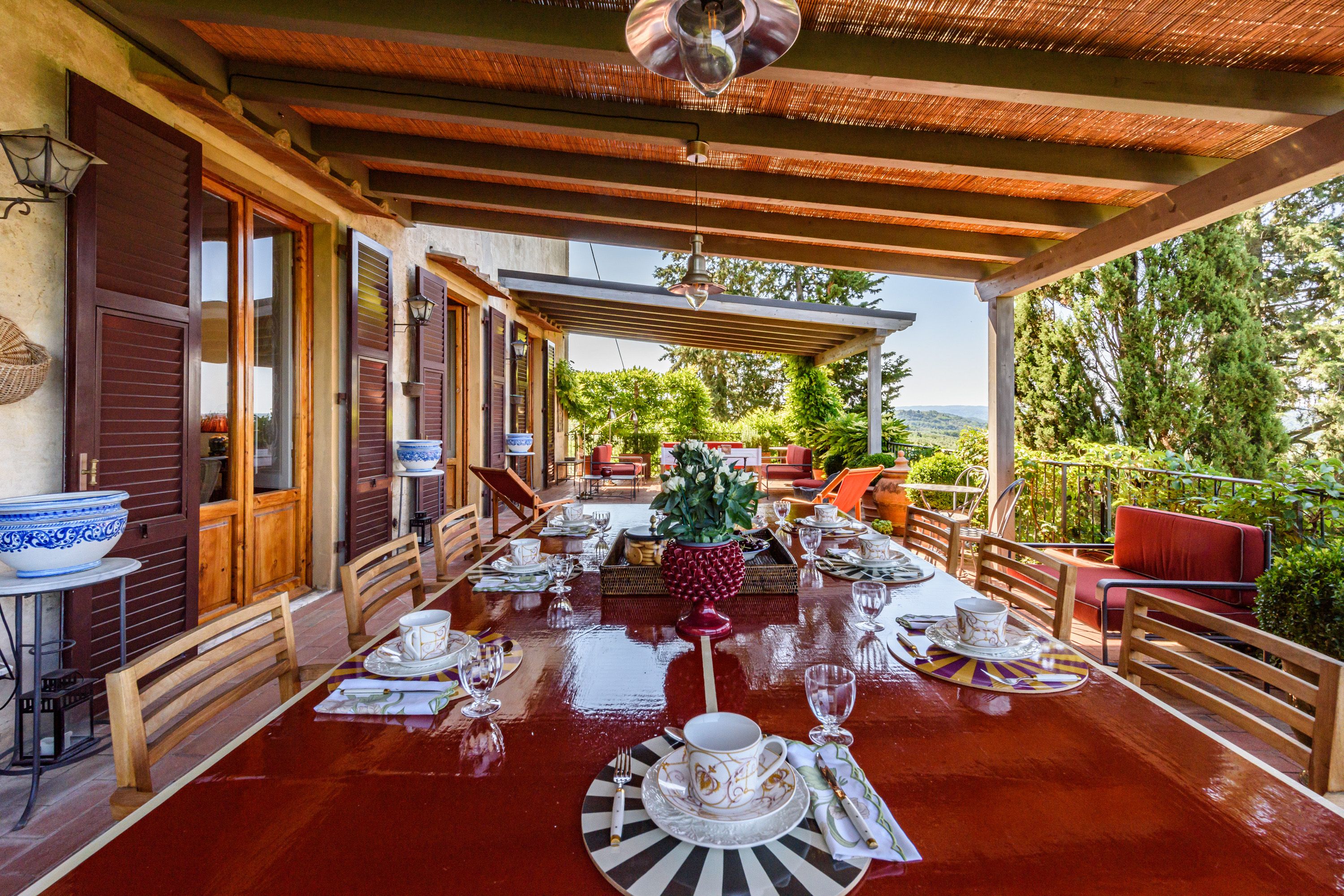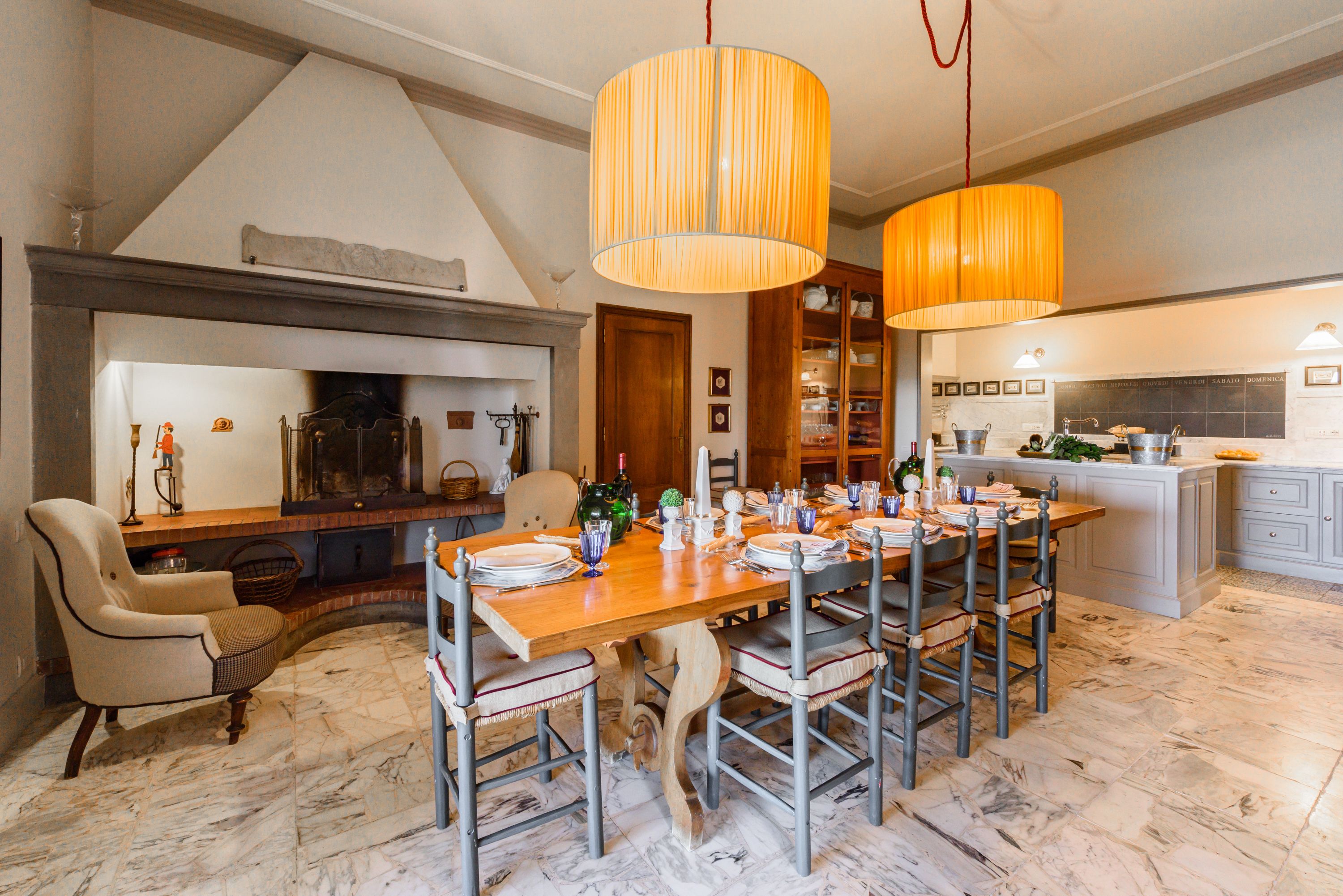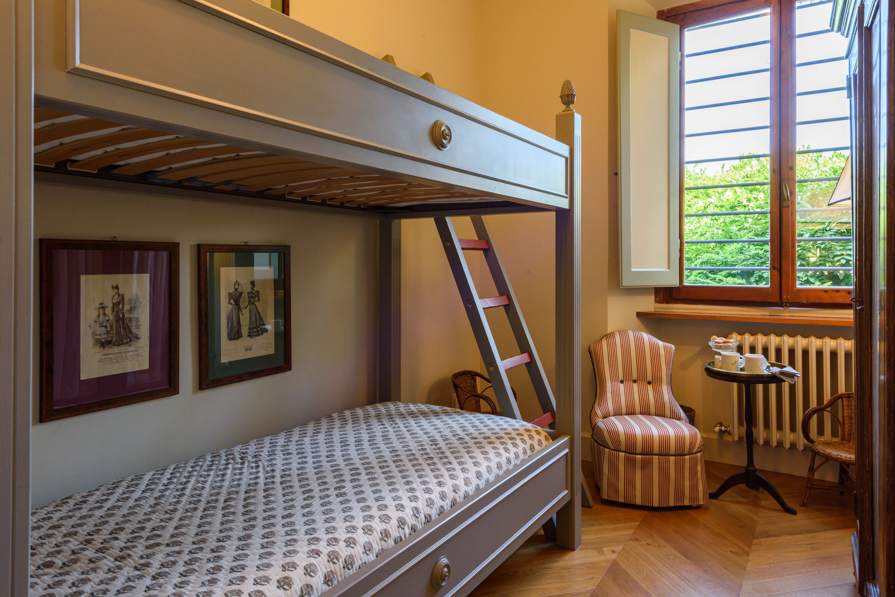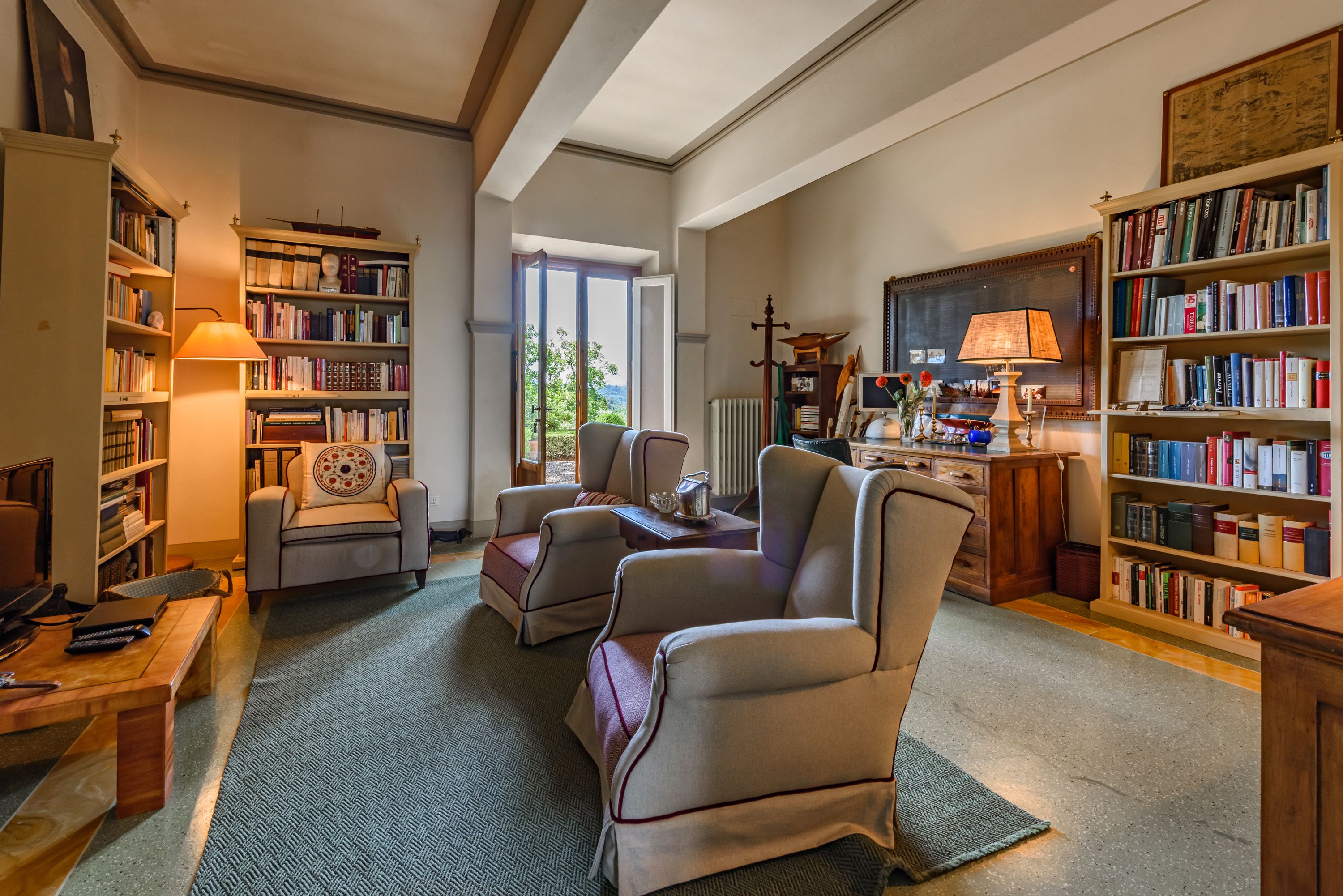 Up in the Chianti hills, this villa is surrounded by olive groves and vineyards. The setting is idyllic Tuscan countryside, yet it’s only 1km into the charming town of San Casciano Val di Pesa, whose narrow streets have a handful of traditional restaurants, shops and pavement cafés. The villa stands proud atop terraced gardens where stone steps lead to a turquoise pool at the bottom. The shaded back terrace houses multiple seating areas, from comfy outdoor sofas to a long, country-style dining table, all overlooking the Pesa river valley, between the cities of Florence and Siena. Inside you’ll find a selection of lounges for the whole group to spread out – a library brimming with books and a classy living room with traditional Italian sofas and darkwood dressers. The kitchen is a combination of modern and Tuscan traditional with an original open hearth still at the heart of the room. Bedrooms are furnished with antique wardrobes and some of the bathrooms have claw-footed bathtubs for a soak at the end of the day.