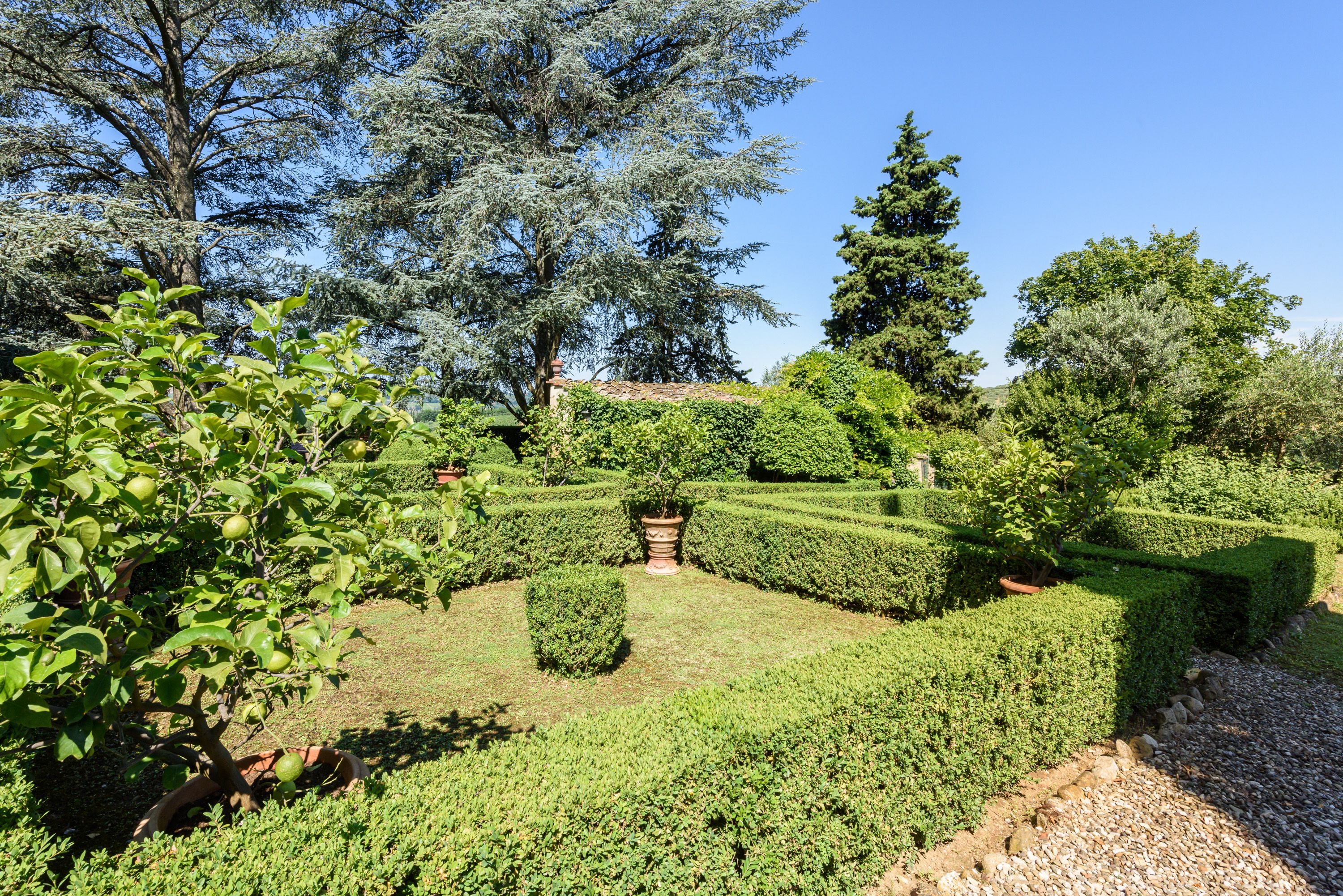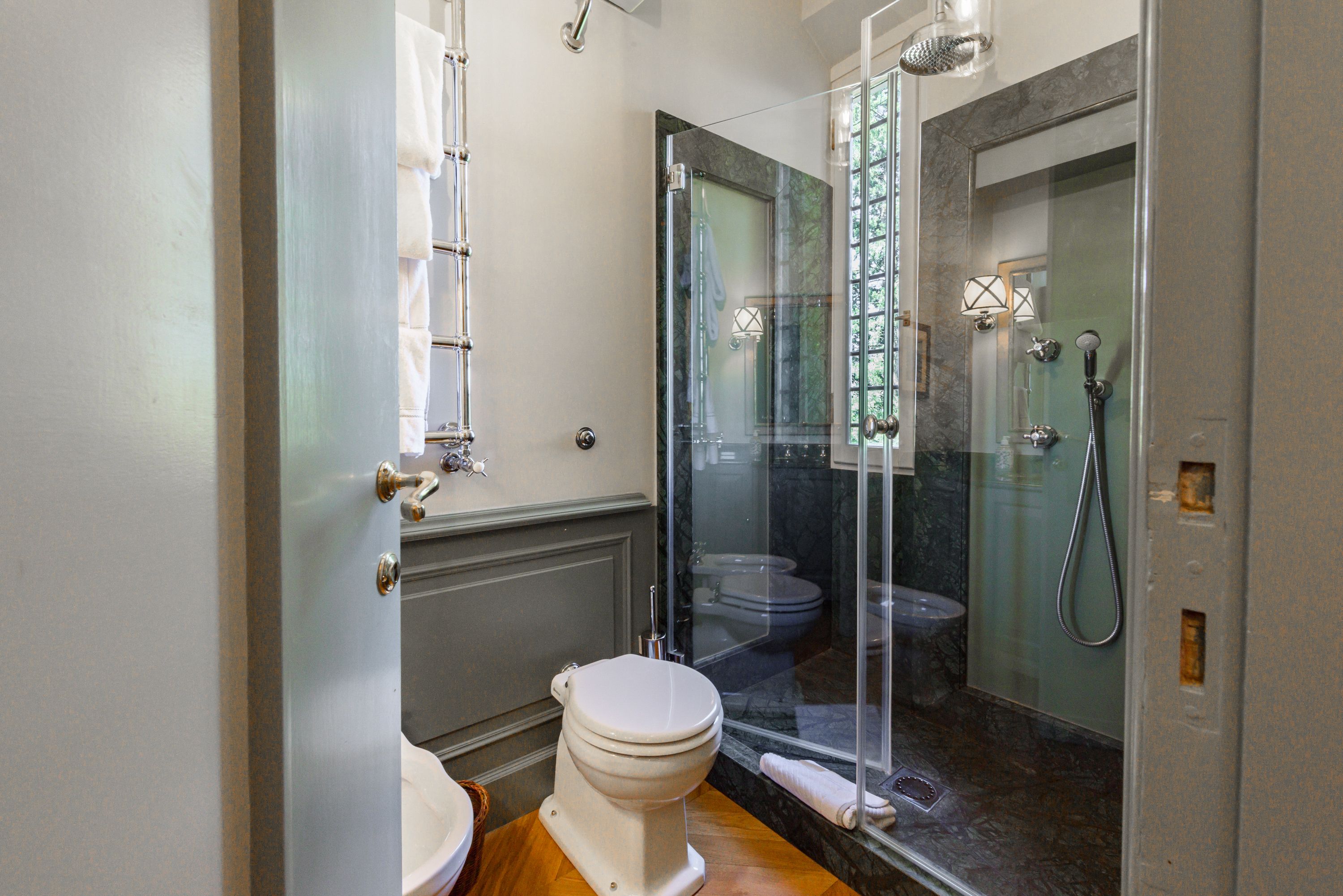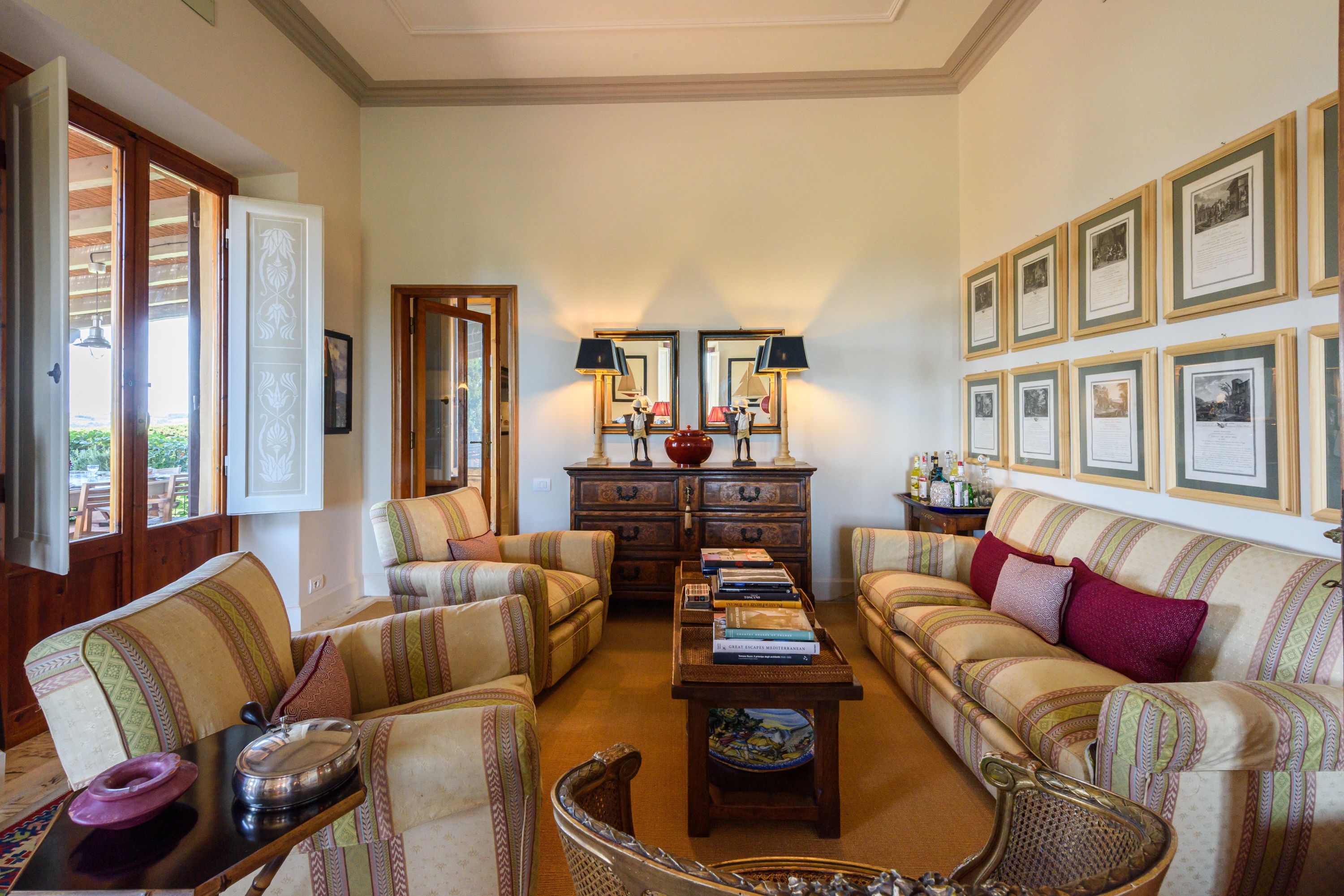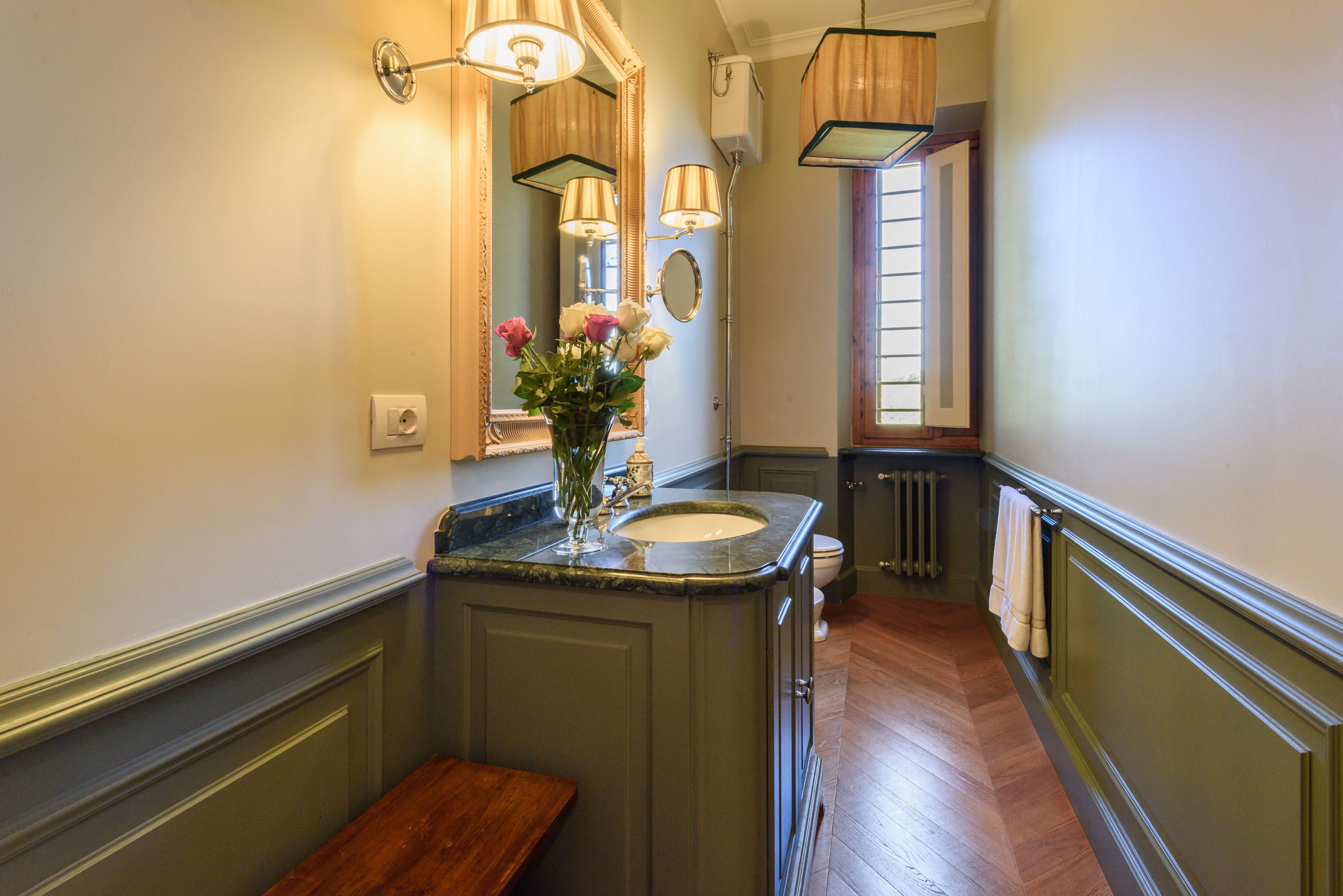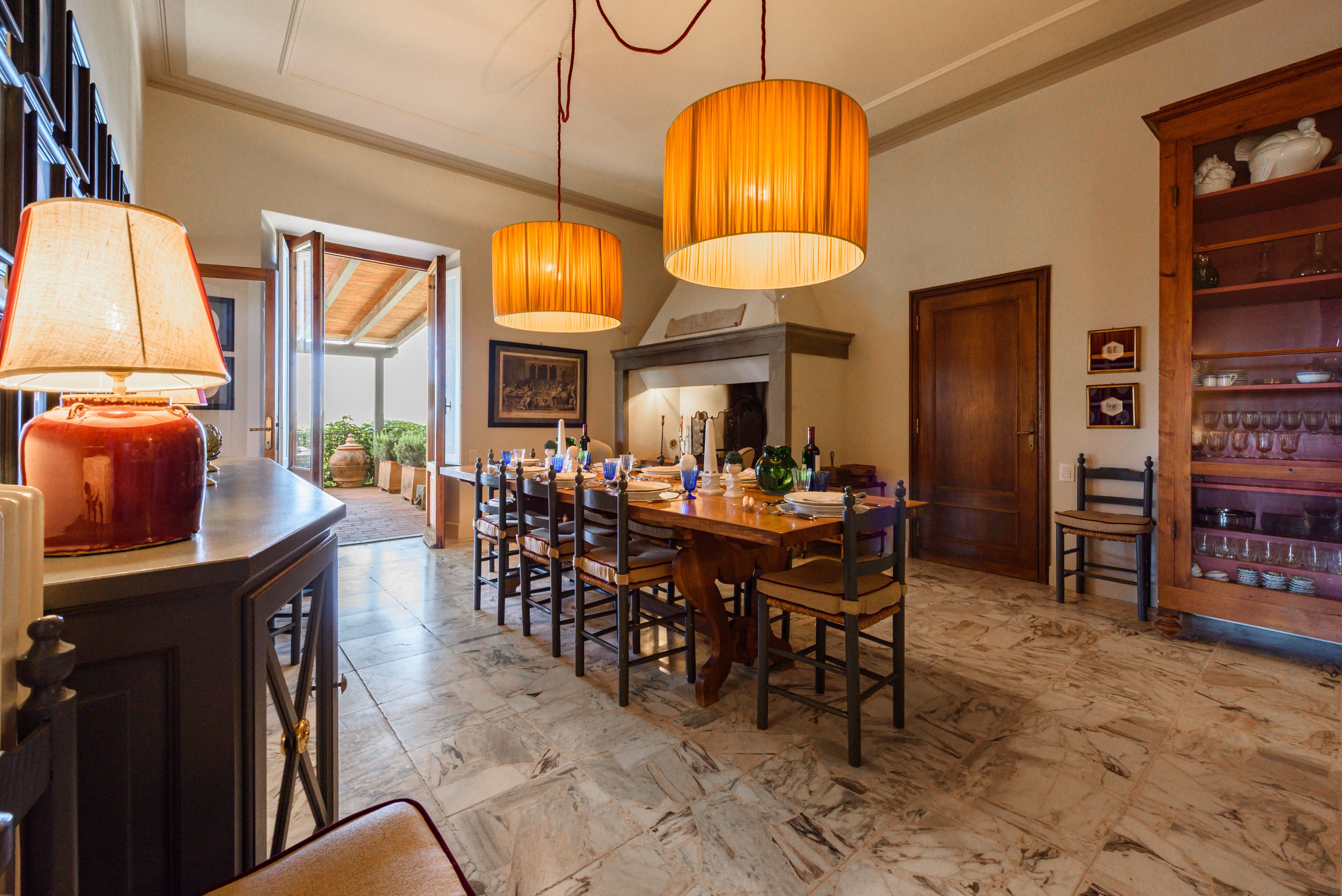 Up in the Chianti hills, this villa is surrounded by olive groves and vineyards. The setting is idyllic Tuscan countryside, yet it’s only 1km into the charming town of San Casciano Val di Pesa, whose narrow streets have a handful of traditional restaurants, shops and pavement cafés. The villa stands proud atop terraced gardens where stone steps lead to a turquoise pool at the bottom. The shaded back terrace houses multiple seating areas, from comfy outdoor sofas to a long, country-style dining table, all overlooking the Pesa river valley, between the cities of Florence and Siena. Inside you’ll find a selection of lounges for the whole group to spread out – a library brimming with books and a classy living room with traditional Italian sofas and darkwood dressers. The kitchen is a combination of modern and Tuscan traditional with an original open hearth still at the heart of the room. Bedrooms are furnished with antique wardrobes and some of the bathrooms have claw-footed bathtubs for a soak at the end of the day.